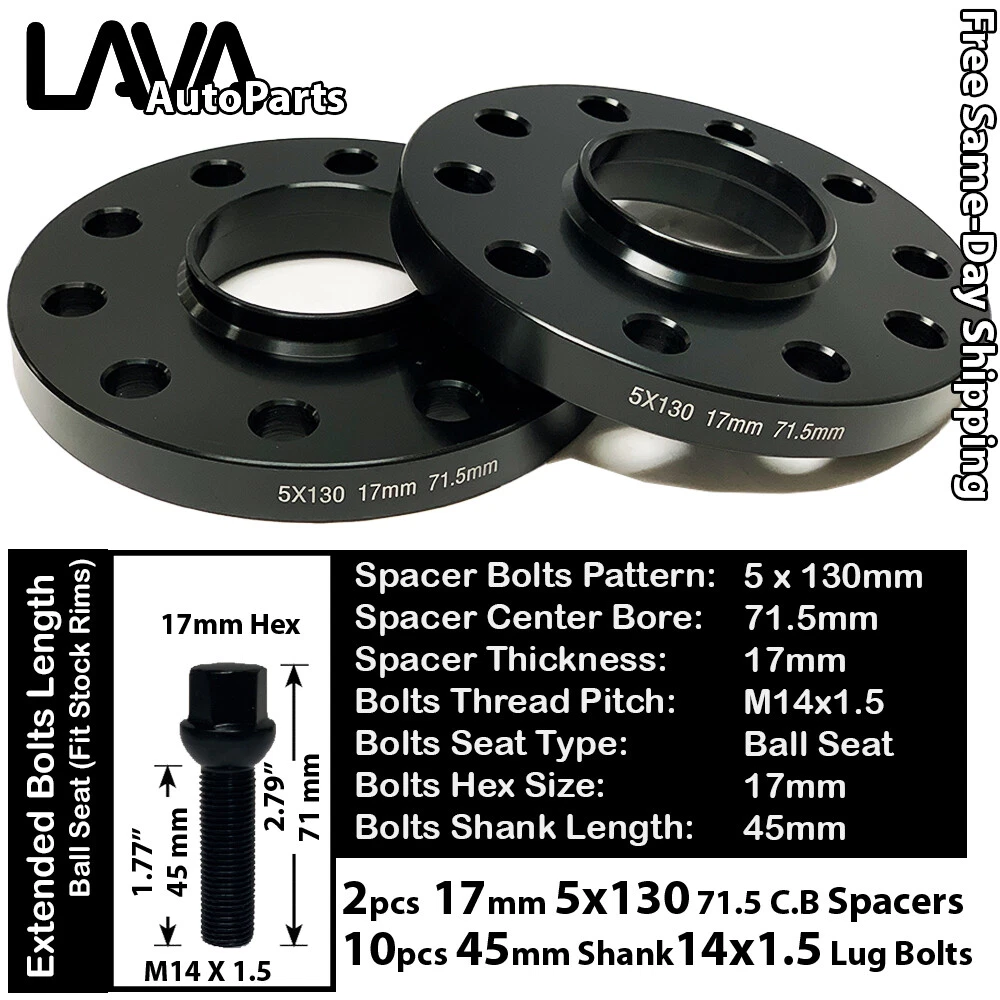 Product Specification: About Spacers Spacer Type: Hub Centric Spacer For Bolts Car Spacer Bolts Pattern: 5x130mm Spacer Center Bore: 71.5mm Spacer Thickness: 17mm Spacer Hub Ring: Yes Spacer Color: Black Spacer Material: Cold Forged 6061 T6 Grade Aluminum Quantity: 2 Pcs About Bolts Lug Type: Lug Bolts with Extended Shank Seat Type: Ball Seat Thread Pitch: M14x1.5 Hex size: 17mm Overall Height: 71mm or 2.79" Overall Diameter: 23mm or 0.9" Shank Length (From Bottom of the Seat to the end the thread shaft): 45mm or 1.77" Color: Black Material: Cold Forged Steel Quantity: 10 Pcs Requirements of the Vehicle Specification Required Vehicle Hub Bolt Pattern: 5x130mm Required Vehicle Hub Center Bore: 71.5mm Required Vehicle Hub Thread: M14x1.5 Required Vehicle Minimum Fender Gap: 17mm Requirements of the Wheel Specification Required Vehicle Wheel Bolt Pattern: 5x130mm Required Vehicle Wheel Center Bore: 71.5mm Required Vehicle Wheel Lug Seat Type: Ball Seat Required Vehicle Wheel Lug Nuts Hex: 17mm What You Will Receive: 2 pcs 17mm Hub Centric Spacers 10 pcs 17mm Hexed Black Ball Seat Lug Bolts Capability Chart and Important Part Note: Please Carefully Refer the Generation Code For Fitment, There may be multiple generations in the same year. Please Double Check For Fender Gap Limitation Make Model Year Range Part Notes Bolt Pattern Bolt Thread Special Notes Audi Q7 2007-2015 Stock Wheel Only 5x130mm 71.5 C.B. 14x1.5 Please Check Fender Gap Limitation Bentley Bentayga 2017-2021 Stock Wheel Only 5x130mm 71.5 C.B. 14x1.5 Please Check Fender Gap Limitation Bentley Continental 2019-2021 Stock Wheel Only 5x130mm 71.5 C.B. 14x1.5 Please Check Fender Gap Limitation Bentley Mulsanne 2011-2020 Stock Wheel Only 5x130mm 71.5 C.B. 14x1.5 Please Check Fender Gap Limitation Porsche 718 Boxster 2017-2021 Stock Wheel Only 5x130mm 71.5 C.B. 14x1.5 Please Check Fender Gap Limitation Porsche 718 Cayman 2017-2021 Stock Wheel Only 5x130mm 71.5 C.B. 14x1.5 Please Check Fender Gap Limitation Porsche 718 Spyder 2020-2021 Stock Wheel Only 5x130mm 71.5 C.B. 14x1.5 Please Check Fender Gap Limitation Porsche 911 1965-2021 Stock Wheel Only 5x130mm 71.5 C.B. 14x1.5 Please Check Fender Gap Limitation Porsche 912 1965-1976 Stock Wheel Only 5x130mm 71.5 C.B. 14x1.5 Please Check Fender Gap Limitation Porsche 914 1970-1976 Stock Wheel Only 5x130mm 71.5 C.B. 14x1.5 Please Check Fender Gap Limitation Porsche 918 Spyder 2015 Stock Wheel Only 5x130mm 71.5 C.B. 14x1.5 Please Check Fender Gap Limitation Porsche 924 1977-1988 Stock Wheel Only 5x130mm 71.5 C.B. 14x1.5 Please Check Fender Gap Limitation Porsche 928 1978-1995 Stock Wheel Only 5x130mm 71.5 C.B. 14x1.5 Please Check Fender Gap Limitation Porsche 930 1978-1979 Stock Wheel Only 5x130mm 71.5 C.B. 14x1.5 Please Check Fender Gap Limitation Porsche 944 1983-1991 Stock Wheel Only 5x130mm 71.5 C.B. 14x1.5 Please Check Fender Gap Limitation Porsche 968 1992-1995 Stock Wheel Only 5x130mm 71.5 C.B. 14x1.5 Please Check Fender Gap Limitation Porsche Boxster 1997-2016 Stock Wheel Only 5x130mm 71.5 C.B. 14x1.5 Please Check Fender Gap Limitation Porsche Cayenne 2003-2021 Stock Wheel Only 5x130mm 71.5 C.B. 14x1.5 Please Check Fender Gap Limitation Porsche Cayman 2006-2016 Stock Wheel Only 5x130mm 71.5 C.B. 14x1.5 Please Check Fender Gap Limitation Porsche Panamera 2010-2021 Stock Wheel Only 5x130mm 71.5 C.B. 14x1.5 Please Check Fender Gap Limitation Porsche Taycan 2020-2021 Stock Wheel Only 5x130mm 71.5 C.B. 14x1.5 Please Check Fender Gap Limitation Volkswagen Routan 2009-2014 Stock Wheel Only 5x130mm 71.5 C.B. 14x1.5 Please Check Fender Gap Limitation Volkswagen Touareg 2004-2018 Stock Wheel Only 5x130mm 71.5 C.B. 14x1.5 Please Check Fender Gap Limitation Important Notice 1. Please Contact Customer Service If You Ever Have Questions 2. Capability is Guaranteed if Your Vehicle is listed in the Capability Chart Above, Please carefully refer to the seat type requirement on the wheel. 3. Exceptions Have Been Marked Under Part Notes, Please Carefully Check Generation Code 4. Fender Gap is the most important measurement to check the maximum thickness you can use Notes: Buyer must check capability chart before buying, any vehicle that is not displayed in the capability may NOT fit. Please check if your rim uses proper lug nuts seat - product is only compatible with mentioned seat type required wheels Only guarantee compatible with Ball Seat Type Required Rim, If you have Aftermarket wheel, you may need Cone Seat Lug Bolts, Aftermarket wheels fitment is based on knowledge of buyer risk If your rim has wheel cap, this set might not be compatible with Wheel Cap Please have professional specialist to perform installation, adding spacers and related modification at your own risks Return Policy: Your happiness with the product is our top concern. We allow returns based on the following rules: Return is allowed within 30-day of Purchase Date; Return Product must be unused, intact, and with the original package; Buyer is responsible for return shipping; Please allow 3 business day after the delivery of your return for us to process the refund. Please notify customer service prior starting a return to avoid the 10% RMA Restocking Fee. Please use a specific return shipping address (not the ship-from address) to avoid the 30% Processing Fee. If you have any questions or concerns, please do not hesitate to let us know. Shipping: All shipments will be shipped via USPS Priority Mail (Same-Day); Order placed before 9:00 am PST will be shipped on the same day. Order placed after 9:00am will be shipped promptly the next business day. If you wish to cancel or modify order, please notify Customer Service before 8:00 am PST or we won't be able to change/cancel your order prior to shipping. We also provide local pickup service! Contact us for more information. Warranty: 30-Day Return Policy; For Colored Lug Nuts (Any color other than Chrome), we suggest the use of manual torque for installation to avoid damage to the pa