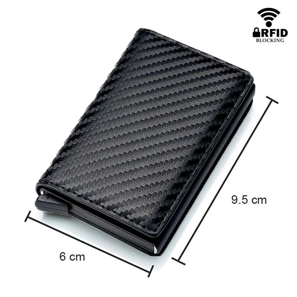 Specification: Material: PU Leather + Aluminum Color:as shown as the pictre Size: approx. 6.5 X 9.5 X 1.8 cm/2.6*3.74*0.7 inch Card Holder Composition: Aluminum Alloy Card Box (Can Hold 6-8 Credit Cards, Bank Cards), Cash Clip, Two Leather Card Slots Description: 1. High Quality Material: 100% Leather Surface Softer more Breathable and Glossier,and Perfect Size Aluminum Case Sturdy and , No breaking, No bending. 2. Humanized and easy-to-use design, Y shape month is convenient for you to put your credit cards, ID card into it, C shape month is for you to pull out the cards easily 3. Perfect men's wallet, slim credit card holder, small and convenient to use, easy to keep it in your back pocket. 4. Lightweight and slim body makes it is suitable to take out with you, you will never feel embarrassed any more for the bulge on the back pockets of your pants. 5. RFID blocking protection design, prevent your private credit card information from stealing by data thief, keep your private property in safety. 6. All cards slide out gradually with the automatic pop-up switch, stops the cards from damaging and falling out. Package Included: 2Pc Carbon Fiber Style Leather Wallet