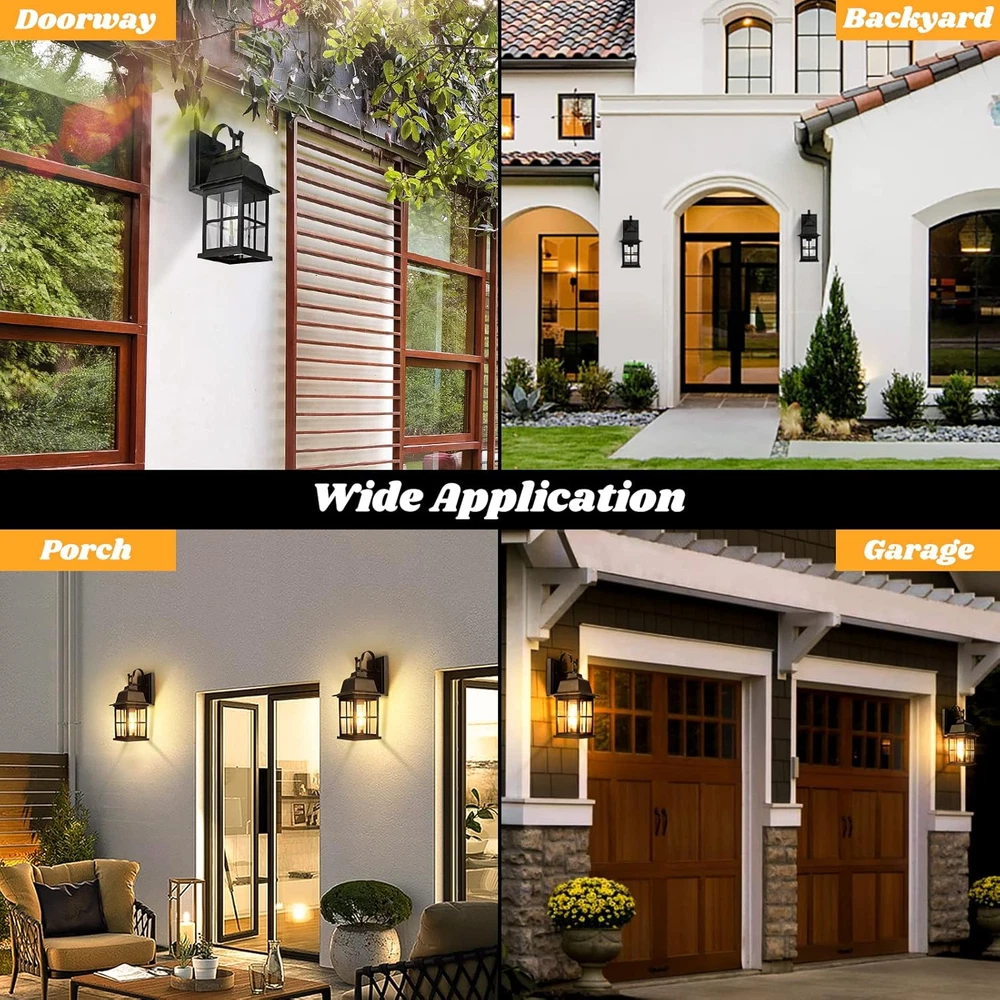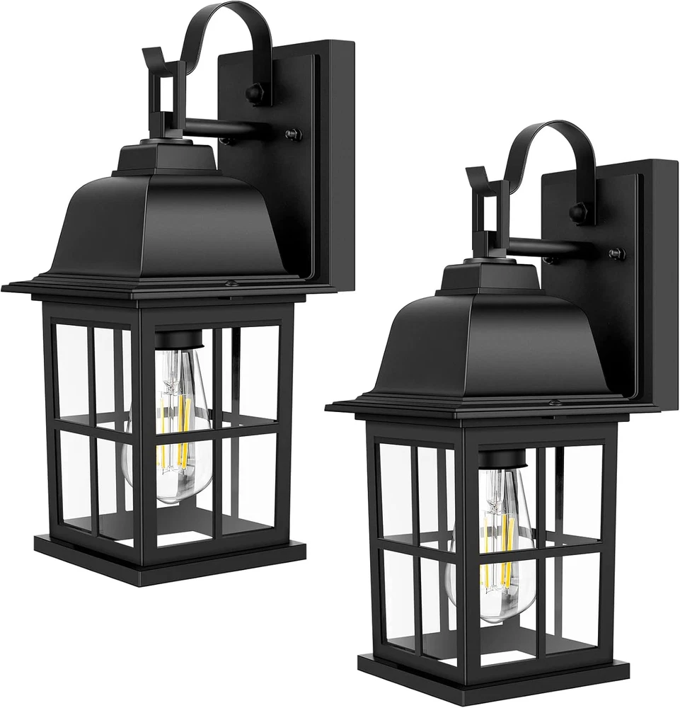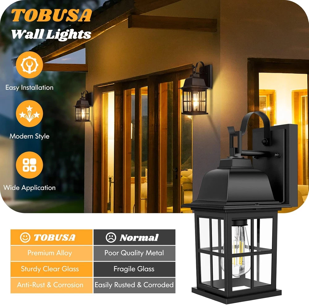 Firm Grid Design: Unlike other outdoor lights on the market, our wall lights are reinforced with cross grid design on the glass, being solider and more stable. Besides, with its grid design, these exterior light fixtures are spreading modern and contemporary touch for outside house Durable & Weather Resistance: Composed of 100% aluminium, these outdoor porch lights are greatly waterproof, suitable for outside of house and extreme weather, such as heavy rain/snow, extreme temperature, storm, etc. Besides, with its advanced material, these outdoor light fixtures wall mount are anti-rust and anti-corrosion, which can be durable for years Opened bottom design & Easy Installation: These outdoor wall lights are designed with opened bottom, being convenient for replacing bulb or keeping the lights clean. What’s more, all installation accessories and instructions are included in the package so that you can install the light in a few simple steps Contemporary Style & Wide Application: These patio wall light fixtures can essentially go with any decor for your house, which will be an ideal outdoor wall sconce for the porch, doorway, garage, backyard, hallway, patio, foyer, and entryway E26 Socket & Recommended Bulbs: These outdoor garage lights are built in standard E26 socket(100W Max), compatible with various bulbs, such as LED , Incandescent or CFL bulbs(Note: Bulbs are NOT included) Product Description TOBUSA Outdoor Wall Light Fixtures - Brighten Your Way Home! WHY CHOOSE US? Specialized in lighting field for years, TOBUSA always offers the excellent product quality and strict surveys. TOBUSA always together new ideas and advanced technology to bring customer new surprise, we have been designed and manufactured decorative & functional lighting for international market for 10+ years, and remain as close to our core values as we ever have: high quality materials, updated function, unique design, satisfying service. Are you looking for security lights for outside of your house? Are you looking for wall lanterns that is symmetrically aesthetic to elevate the look of your outdoor space? Here are the solutions we offer! These outdoor wall light fixtures will definitely be your perfect choice! Specifications: These wall lanterns are made from premium alloy, being anti-rust and anti-corrosion, brilliant choice for outdoor lighting. Voltage: 120 V Wattage: 100W MAX Base Type: E26 Material: Alloy+Glass Fixtures: Matte Black Power Source: Cord-Electric Modern Light Fixtures For Outside House Lighting up your House with TOBUSA Now! Unique Opened Bottom Design: These outdoor light fixtures are designed with opened bottom, super easy to replace bulbs and clean. Durable for years: With high-quality material, these wall light fixtures are anti-rust, which will be last for years. Modern Design: High-quality transparent glass and matte black frame add a modern & contemporary touch to your house. Compatible with various E26 bulbs: Compatible with all E26 bulbs, DIY your own wall sconces for specific lighting effect. Package Lists: Wall Sconces * 2 Accessories * 2 Manual * 1 Outside of House Combining the features of the product in the market, these outdoor lighting are well-designed and upgraded in modern style, will definitely fit your lighting demands, creating your outside space more contemporary. Backyard/Patio These outdoor light fixtures are easily controlled by yourself, being super practical for your backyard or patio, making your space much different from others. Garage Perfect size and design, these nice wall light fixtures for your garage will offer you a safe lighting zone. Start your easy life now. FAQ: Q: Are these lights dusk to dawn? A: These lights are not dusk to dawn, saving much functional trouble for you. Install the bulbs and plug it in, then you can get your great lighting. Q: If the light is defective, how can I do for it? A: TOBUSA have our all product back-up, if you have any question or problem, feel free to contact. We're glad to offer help. Q: What kind of bulb I should get for these exterior light fixtures? A: These light fixtures are compatible with all E26 bulbs. If you have no idea of bulbs, please feel free to ask question.
