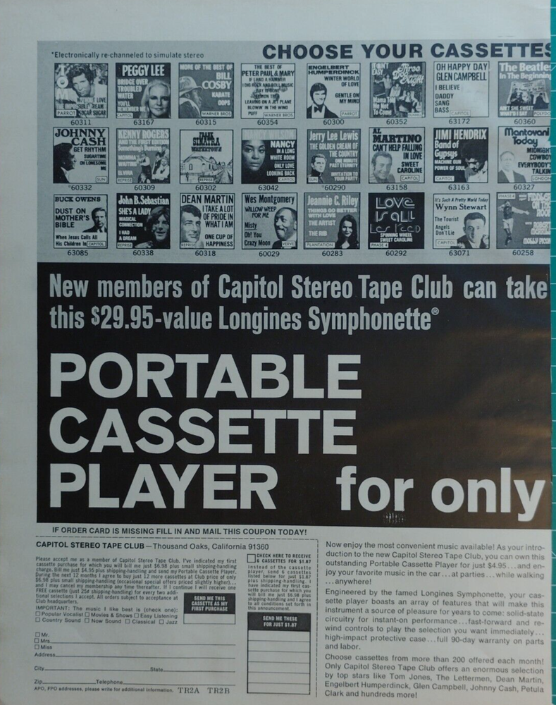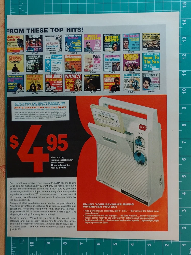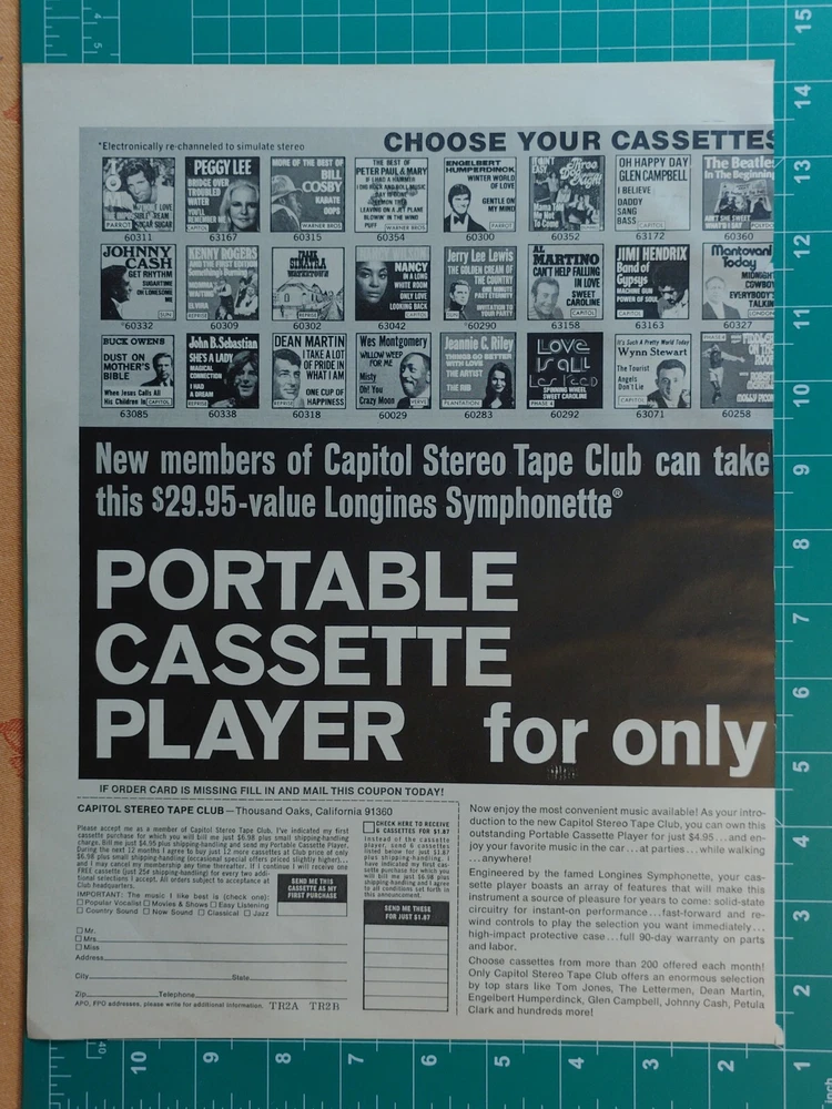 2 Page Ad: Capitol Stereo Tape Club (Cassette) $4.95 Tape Player With Reply Card For your consideration is this classic 2-page Vintage Advertisement from the 1970's. The "Date of Creation" represents the magazine issue date. "Old school" advertisements for sure! Please closely review the image for any signs of wear or damage, and, if needed, please ask for clarification prior to purchasing. All items presented for review come from a smoke free home. The Vintage Advertisement shown above is available today and is ready for immediate shipping, packaged in a sleeve between card stock stiffeners, ensuring that you receive it in an undamaged state. NOTE that any measurement listed is an approximation. NOTE : " Double Page " indicates that the advertisement was printed across 2 individual pages. The vast majority of my offerings will NOT be from the center of the magazine. If the advertisement is the "Center Fold" I will indicate that in the title. Be sure to visit my eBay store for other Postcards and ephemera I have to offer and follow me for access to flash discount sales - you never know when they will happen! Important note: As per eBay policy, all orders will be shipped out only to the address registered to the buyer on the account. No shipments will be made to alternate address. Terms of Sale What happens if you are not satisfied with your purchase? Well, just simply return the purchase to me within 60 calendar days and I will provide you with a 100% refund - no questions asked. I want you to be 100% satisfied! Shipping & Fees MULTIPLE PURCHASES SHIPPING NOTE When purchasing multiple items, please use the "ADD TO CART" button to add items to your eBay shopping cart. I am happy to combine shipping on multiple purchases, when possible (like items / shipping policies), however you need to ignore promptings from eBay to pay for each item immediately after your purchase, if you intend to purchasing more than one item. When you are finished shopping, you can then go to your "CART" and checkout. If the "CART" does not automatically combine shipping costs for you, send me a note and I will respond with combined invoice to take advantage of shipping discounts. I cannot combine shipping or issue shipping refunds after you have already paid for your multiple items individually. U.S shipping Calculated: Cost varies by buyer location Services USPS First Class Large Envelope (2 to 5 business days) Handling time: 1 business day Handling cost - Calculated shipping only: $0.99 International shipping Handled by eBay International Shipping Calculated: Cost varies by buyer location International handling cost: $ 2.50