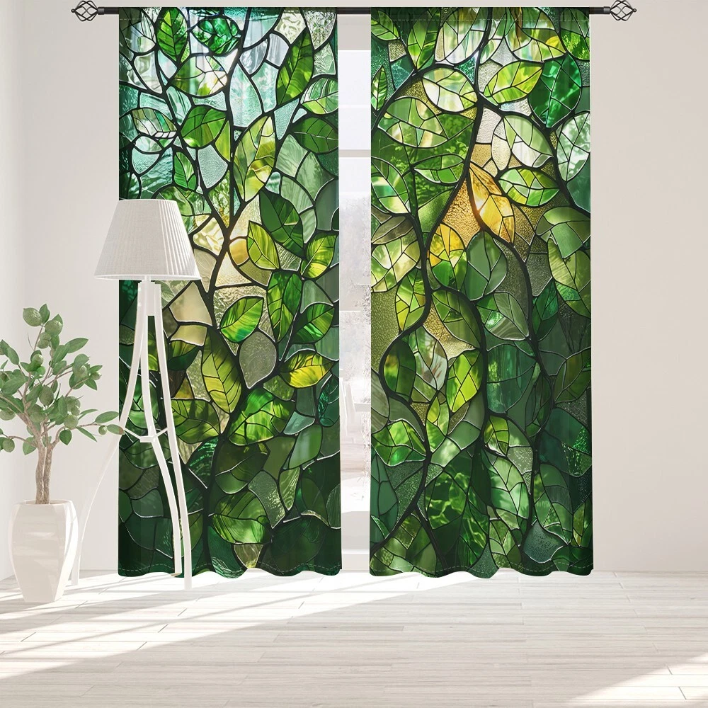 2Pcs Spring Green Leaf Glass Texture Window Curtain Bedroom Living Room Kitchen