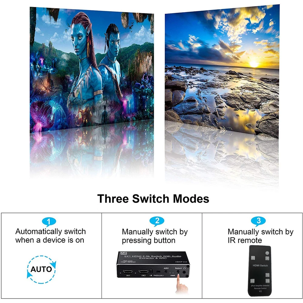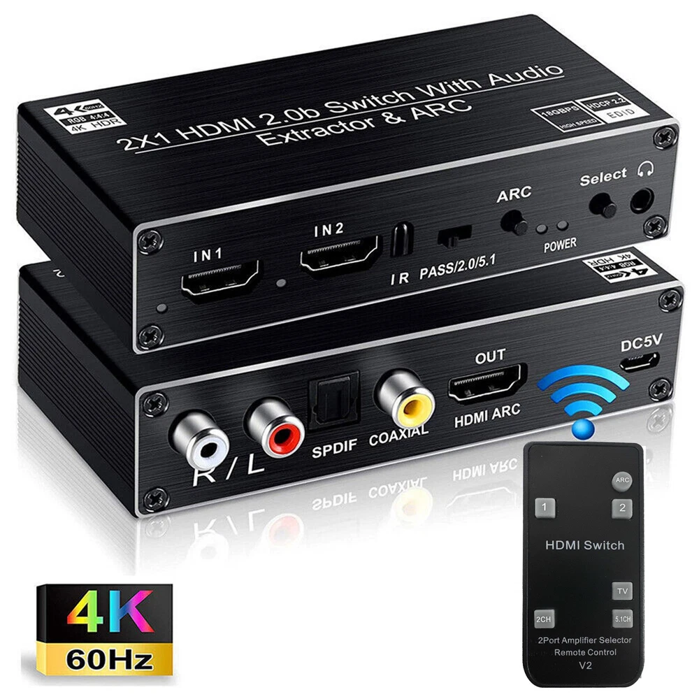 2x1 HDMI Switch Audio Extractor With R/L+Toslink SPDIF+COAXIAL Audio Out Adapter 4K 2 In 1 Out HDMI ARC Audio Switcher Selector Specifications: Compatible with HDMI2.0 and high-definition TV with HDCP2.2 Supports high-resolution input of 480P, 720P, 1080P, 1080P 3D, 4K60Hz Support compressed audio: DTS Digital, Dolby Digital (DTS-HD and DOLBY) with Audio Separation and Audio Return Function (ARC) Supports HDMI2.0 (4; 4; 4 RGB) Supports MHL function and has LED indication function Supports automatic identification of signal sources, and automatically jumps to the next port with a signal source when the signal source is disconnected, Automatically jump to newly inserted HDMI signal source Supports high-definition signal with remote control Supports video transmission with broadband of 3Gbps/300MHz Power supply: 5V1A(Included 5V1A power adapter) Feature: 1. 4K@60HZ 2X1 HDMI SWITCH with AUDIO EXTRACTOR: This 4K HDMI Switch allows you connect Two HDMI 2.0 Sources to one display device, Each input source support audio extract by the Toslink+L/R+Coaxial audio output channel. No loss of quality after you split the signal. No degradation in audio quality. (HDMI output support CEC) 2. ULTRA HD 4K VISUAL ENJOYMENT: Supports HDCP 2.2, HDMI2.0b, 4K@60HZ, RGB4:4:4, Full HD, UHD, HDTV, Deep Color to 36bit,also back compatible with 4K@30HZ and 1080P. Max Bandwidth of 18.2Gbps.(Kindly Note: It is not compatible with DVI) 3. HDMI ADUIO EXTRACTOR: With Optical Tolink SPDIF+L/R+3.5mm Jack+Coaxial audio out allows you extract the audio from the HDMI input source ( Like For PS4, Cable box, For Xbox or any HDMI device)connection to a spearker, Amplifier etc. Note: If you choose optical or coaxial audio out, you can enjoy 5.1CH or 2CH or audio copy. If you choose 3.5mm or L/R audio out, you can enjoy 2CH or audio copy. 4. HDMI ARC ADAPTER: Supports ARC (Audio Return Channel), Extractor the Audio from TV to Soundbar or Amplifier. Connect your TV HDMI(ARC) Port to this switch HDMI Output Port with HDMI Cable, then using optical or Coaxial cable to the soundbar, Speaker, home theater, A/V receivers etc.No distortion of audio or video(Note:3.5mm jack and L/R audio port not support ARC audio) 5. Smart Auto-Switch with Remote Control: It will automatically skip to the most recently inserted HDMI signal source,it will automatic change from HDMI source A to HDMI source B when you turned on source B and back to source A when you turned source B off Product List: 1x HDMI switcher 1x IR remote control(Included 1*CR2025 battery) 1x USB power cable 1x 5V Power adapter 1x User manual