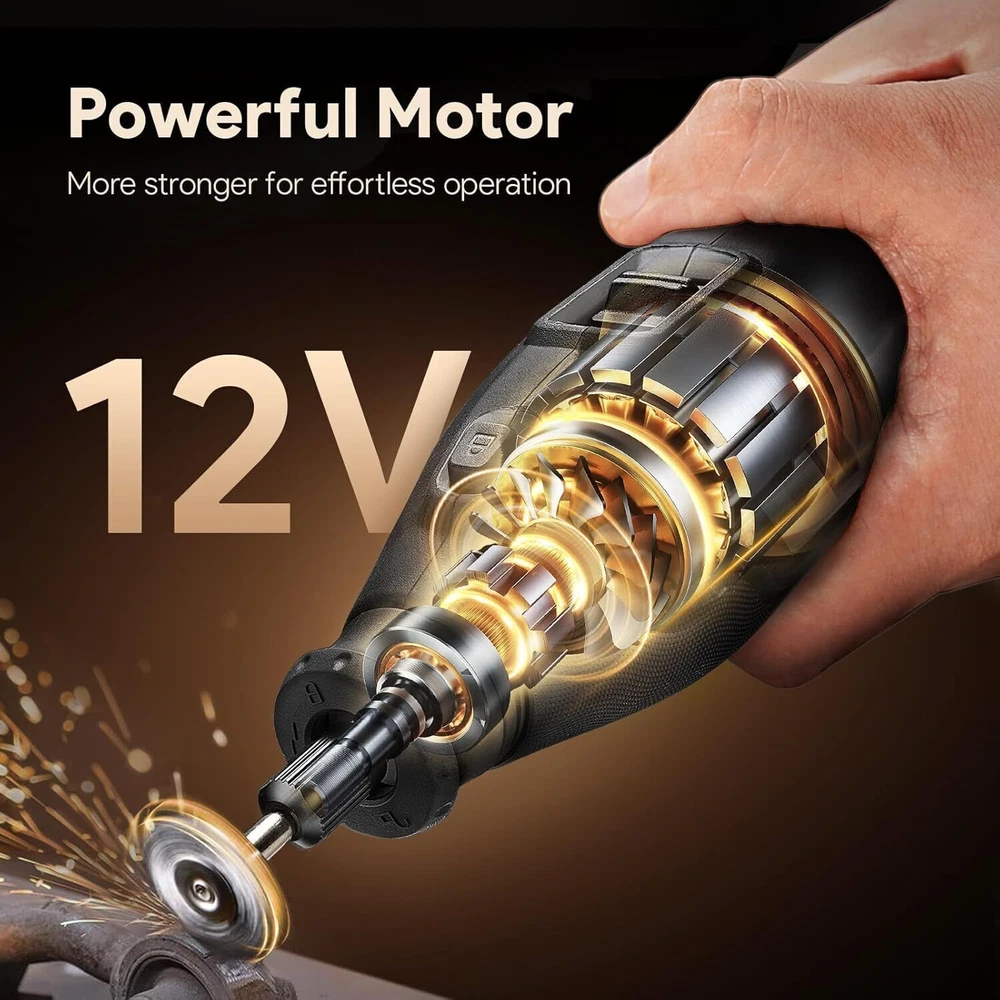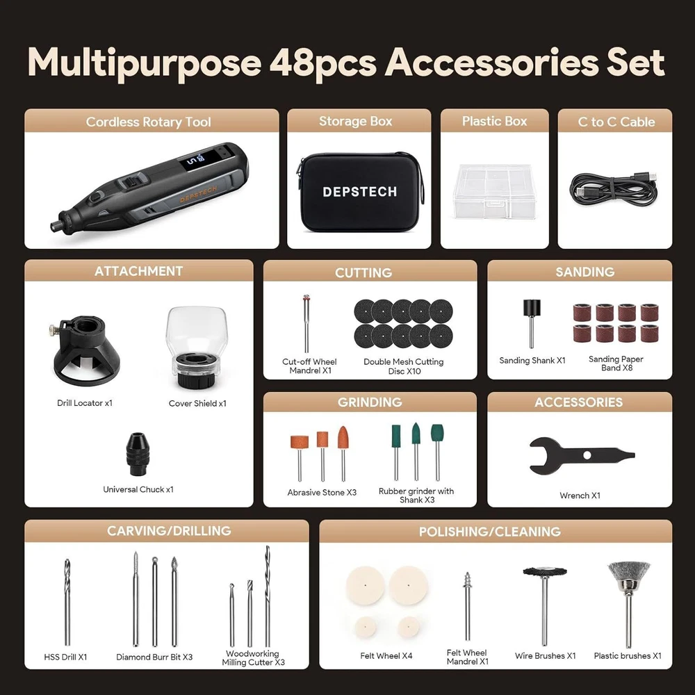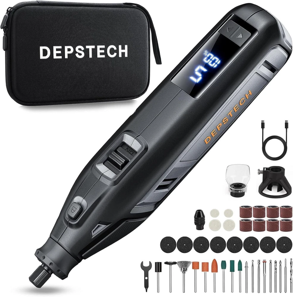 Voltage 12 Volts Power Source Battery Powered Recommended Uses For Product Carving, Cutting, Drilling, Sanding, Engraving, Cleaning, Polishing, DIY Craft, Household Repairs and Automotive Maintenance Carving, Cutting, Drilling, Sanding, Engraving, Cleaning, Polishing, DIY Craft, Household Repairs and Automotive Maintenance Special Feature Large Display Screen, 12V Powerful Motor, 3x 2.5Ah Battery, Support Fast Charging, 5 Variable Speed 5,000RPM to 35,000RPM, 48pcs Enduring Accessories Large Display Screen, 12V Powerful Motor, 3x 2.5Ah Battery, Support Fast Charging, 5 Variable Speed 5,000RPM to 35,000RPM, 48pcs Enduring Accessories About this item ใ๐๐๐ ๐๐จ๐ฐ๐๐ซ๐๐ฎ๐ฅ ๐๐จ๐ญ๐จ๐ซ, ๐๐๐๐-๐๐๐๐๐๐๐๐ใDEPSTECH P1P 12V cordless rotary tool is able to cover most family handcraft scenarios from DIY, home repair, auto repair to garden maintenance etc. It support 5 variable speeds up to 35,000RPM, capable of handling heavy-duty work than the 4V/8V electric grinder. ใ๐๐๐ ๐ ๐๐ฌ๐ญ ๐๐ก๐๐ซ๐ ๐ข๐ง๐ & ๐.๐๐๐ก ๐๐จ๐ง๐ ๐๐๐ญ๐ญ๐๐ซ๐ฒ ๐๐ข๐๐ใDEPSTECH P1P rotary tool kit built-in ๐ ๐ฑ ๐.๐๐๐ก lithium-ion batteries to deliver longer runtime. The convenient USB-C charging cable ensures you're always ready to charge with a power bank, car charger or wall charger. And it supports ๐๐๐ ๐๐๐ฌ๐ญ ๐๐ก๐๐ซ๐ ๐ข๐ง๐ (๐๐ก๐๐ซ๐ ๐ข๐ง๐ ๐ข๐๐จ๐ง ๐๐ฅ๐๐ฌ๐ก๐๐ฌ ๐ช๐ฎ๐ข๐๐ค๐ฅ๐ฒ), allowing you to complete charging in a short time and resume work promptly. ใ๐๐๐ซ๐ ๐ ๐๐ข๐ฌ๐ฉ๐ฅ๐๐ฒ ๐๐๐ซ๐๐๐งใCompared with traditional multi tools, this rotary tool has a more modern and technological appearance design, It comes with a large digital screen that accurately monitors remaining power and speed, so that you can easily control your working status at every moment. ใ๐ ๐๐ข๐ง๐ฌ ๐๐๐ฆ๐จ๐ซ๐ฒ ๐ ๐ฎ๐ง๐๐ญ๐ข๐จ๐งใThis carving tool can remember the speed setting you last used within 5 minutes of shutting down, remains enough time to change accessories or take a break, no need to re-adjust it every time. After 5 minutes, it will return to the default 3rd speed. ใ๐๐ซ๐ ๐จ๐ง๐จ๐ฆ๐ข๐ ๐๐๐ฌ๐ข๐ ๐ง & ๐๐จ๐ฐ ๐๐จ๐ข๐ฌ๐ใErgonomic & Compact design with larger area soft rubber for anti-slip and comfortable grip, maximizing comfort and control during long work sessions. DEPSTECH P1P has less noise and vibration than other rotary tools of the same power, which can reduce interference to the surrounding environment and other people. ใ๐๐ฎ๐ฅ๐ญ๐ข๐ฉ๐ฎ๐ซ๐ฉ๐จ๐ฌ๐ ๐๐ซ๐๐๐ญ ๐๐จ๐จ๐ฅใEnduring 48pcs rotary tool accessories are packed in a EVA carrying bag. These high-quality accessories allow the tool to handle various tasks like cutting, sanding, engraving, drilling and metal processing effortlessly. Equipped with a universal keyless chuck, able to compatible with Dremel accessories & attachments. Voltage โ12 Volts Power Source โBattery Powered Recommended Uses For Product โCarving, Cutting, Drilling, Sanding, Engraving, Cleaning, Polishing, DIY Craft, Household Repairs and Automotive Maintenance Special Feature โLarge Display Screen, 12V Powerful Motor, 3x 2.5Ah Battery, Support Fast Charging, 5 Variable Speed 5,000RPM to 35,000RPM, 48pcs Enduring Accessories Included Components โ1 X Cordless Rotary Tool, 1 X Plastic Case, 1 X Storage Box, 1 X C to C Cable, 1 X Universal Chuck, 1 X Drill Locator, 1 X Cover Shield, 8 X Sanding Paper , 1 X Sanding Shank, 3 X Diamond Burr Bit, 3 X Woodworking Milling Cutter, 1 X HSS Drill, 10 X Double Mesh Cutting Disc, 1 X Cut-off Wheel Mandrel, 3 X Abrasive Stone, 3 X Rubber grinder with Shank, 4 X Felt Wheel, 1 X Felt Wheel Mandrel, 1 X Wire Brushes, 1 X Plastic brushes, 1 X Wrench Item Weight โ1.37 Pounds Maximum Rotational Speed โ35000 RPM Number of Batteries โ1 AAA batteries required. (included) Style โCordless Rotary Tool Item dimensions L x W x H โ9.33 x 1.92 x 2.12 inches Minimum Speed โ5000 RPM Part Number โP1P Item Weight โ1.37 pounds Product Dimensions โ9.33 x 1.92 x 2.12 inches