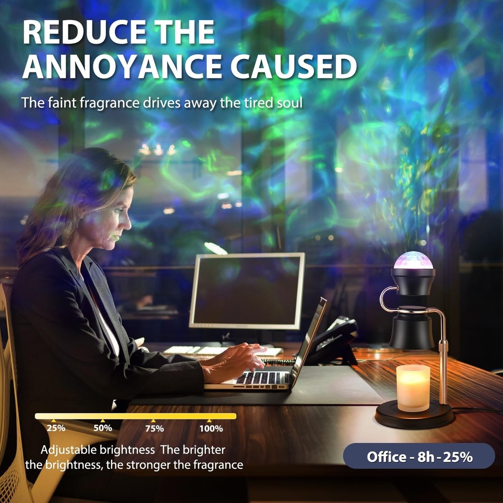 2 in 1 Adjustable Candle Warmer Lamp with Timer and 180° Rotating Light Projector,Electric Candle Warmer, Mom,House Warming Gifts New Home Bedroom Decor Dimmable Candle Lamp Product Details Finish Type: Painted Base Material: 铸铁 Bulb Base: GU10 Product Dimensions: 6.3"D x 6.3"W x 11.6"H Item Weight: 2.2 Pounds Product Dimensions : 6.3 x 6.3 x 11.6 inches; 2.2 Pounds Item model number : 01 Date First Available : September 25, 2024 Manufacturer : PRISESSA Country of Origin : China Customer Reviews: 4.4 4.4 out of 5 stars 38 ratings Finish Type: Painted Base Material: 铸铁 Bulb Base: GU10 Product Dimensions: 6.3"D x 6.3"W x 11.6"H Item Weight: 2.2 Pounds Lamp Type: Night Light Shade Color: Black Shade Material: Metal Switch Type: Touch Style: Contemporary Brand: PRISESSA Color: Black Light Source Type: Halogen Material: Cast Iron Power Source: AC adapter Number of Light Sources: 2 Included Components: Bulb Is Waterproof: false Bulb Shape Size: G16 1/2 Mounting Type: Tabletop Wattage: 5E+1 Number of Items: 1 Lighting Method: Incandescent Indoor/Outdoor Usage: Indoor Number of Pieces: 1 Efficiency: Energy Efficient Is Cordless?: No UPC: 753584375674 Manufacturer: PRISESSA Shade Height: 5.3 Inches Part Number: 001 Item Weight: 2.2 pounds Country of Origin: China Item model number: 01 Finish types: Painted Batteries Required?: No Date First Available: September 25, 2024 INNOVATIVE DESIGNCreatively combining the functions of the warming candle lamp and the projector lamp, you can enjoy the scent of the candle while appreciating the soft light of the projector lamp. Our candle warmer lamp will create a warmer and more romantic environment for you, helping you sleep or relax.Our candle warmers is the better choice for relaxing and creating a romantic atmosphere SAFE CANDLE WARMEROur candle warmer kit comes with two 50W GU10 bulbs(NO CANDLES INCLUDED), providing a safer way to light candles than traditional open flames in homes with pets, children or the elderly, eliminating the risk of fire, burns and smoke, and satisfying the need to enjoy soothing fragrance and soft light without having to worry about open flames BETTER GIFT FOR MOM Whether the candle warmer with timer is a housewarming gift, new home necessities, birthday gifts for women, Valentine's Day gifts, or anniversary, wedding, Mother's Day, Father's Day, Christmas gift, our candle warming lamp is a thoughtful and unique gift, whether it can be used in the bedroom, office, study, living room PERFECT HOME DECOR GIFT This electric candle warmer adopts a stylish metal lampshade design, with a beautiful projector lamp, adding a touch of elegance to the home, office. The unique lamp candle warmer plus projector lamp design adds a sense of fashion and science fiction, suitable for a variety of environments, from living room to office, Valentine's Day decoration, bedroom decoration aesthetics, etc. Our candle light warmer can also be used as a night light ELECTRIC DIMMER & TIMEROur candle warmer lamp with timer has 4-level adjustable brightness and projector lamp has a 90 adjustable, allowing to create the perfect atmosphere for any occasion. With the dimmer control, can adjust the melting speed of the candle. The higher the setting, the faster the wax melts. The dimmable candle warmer lamp's built-in timer function of 2, 4, or 8 hours allows the candle to be used longer, which is a cost-saving and environmentally friendly choice