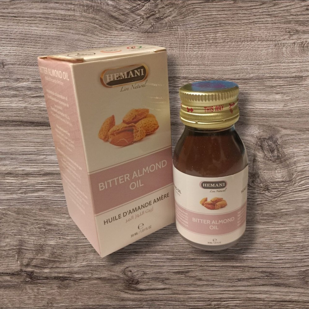 2x Hemani Bitter Almond Oil 30ml (Total 60ml / 2.03 fl oz) – 100% Natural Pure Bitter Almond Oil for softening skin, nourishing hair, and relaxing massage. Known for its soothing properties and mild almond scent. Made in Pakistan. For external use only.