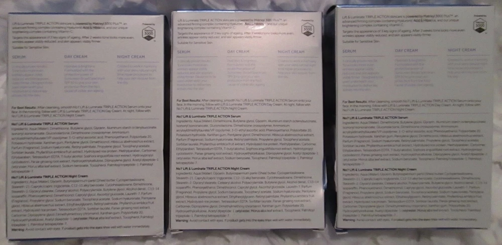 BRAND NEW. SEALED. ***3*** X BOXES No7 LIFT & LUMINATE TRIPLE ACTION SKINCARE SYSTEM ~EACH BOX CONTAINS: SERUM. 1 X 15 ml/ 0.5 US FL OZ DAY CREAM. 1 X 25 ml / 0.84 US FL OZ NIGHT CREAM. 1 X 25 ml / 0.84 US FL OZ *PLEASE NOTE EXP 07 2023* PRICED TO SELL. ALL SALES ARE FINAL. SEE PICS PROVIDED-WHAT YOU SEE IS EXACTLY WHAT YOU WILL RECEIVE *FREE SHIPPING IN THE USA ONLY* THANK YOU FOR VIEWING THIS LISTING HAVE YOURSELF A GREAT DAY