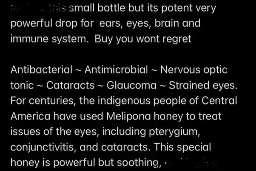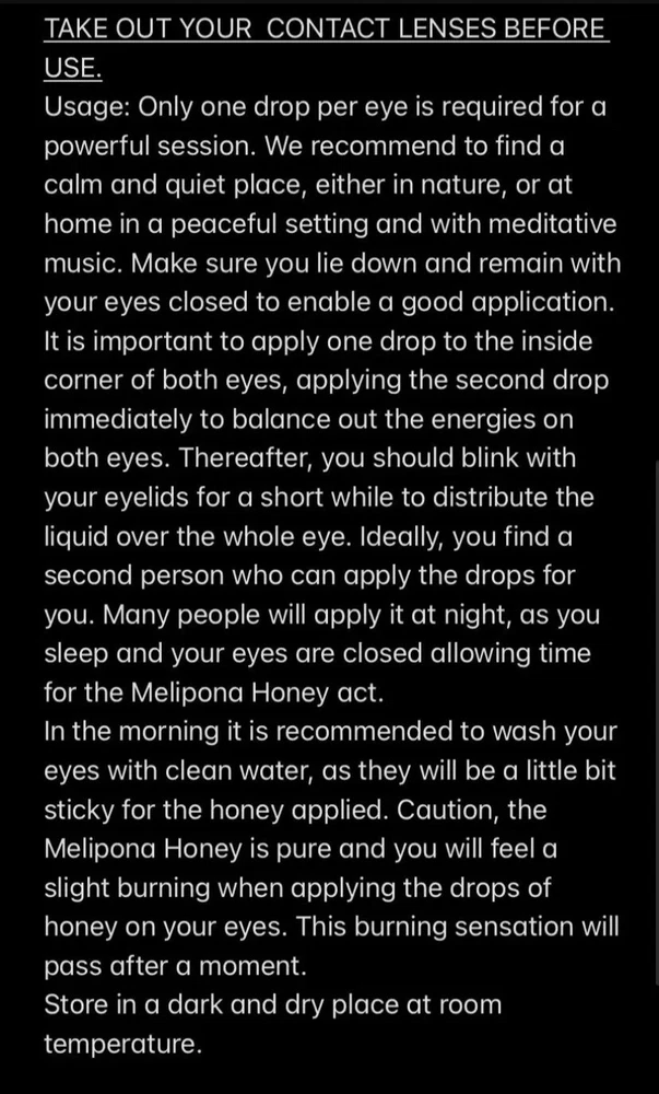 3 PCs included 5ml want a Healthy mind, brain, need healthy vision and healthy hearing use these drops. Will help stimulate tear duct to cleanse your eyes removing mucus naturally removing eye floaters, dry eyes, blurry vision and many eye diseases. Removes excess waste from nasal cavity and behind the eyes. Flavonoid’s help protect your eyes from free radicals caused by oxidative stress helps to create an alkaline environment within your eyes . Contains polyphenols that repair tissue damage and amino acids that fills your eyes with premium fuel for optimal vision healing. 100% pure Legit expensive un diluted one ingredient non gmo rare Honey from stingless bee. From Honduras. Remember it is honey but not your common honey it is bound to get sticky and Very thick RECOMMEND PLACING IN WARM WATER before use to liquify and make flowing through dropper easier 100% NATURAL INGREDIENT Naturopathic non toxic chemical free very safe organic alternative to typical over-the-counter eye drops. Comes Sealed in sanitized steamed all glass dropper bottle filled with dropper. Not plastic that can leech chemicals into the product. Uses: Treatment of many eye conditions including floaters, glaucoma cataracts or raised eye pressure, itchy, poor vision, inflammation, conjunctivitis, ocular inflammation and dry eye disease. can also be used after eye surgery, useful to prevent infection or reduce inflammation. It treats corneal ulcers, hypopyon ulcer, superficial and deeper eye infections and pre and post-operative care has many healing properties. Removes any eye virus, infection, detached retina all types of eye diseases and also for brain health. Application: One drop on each eye note will sting for less than 1 minute. NOTICE !!!!![[[PLEASE BE SURE TO CHECK THE PICTURES AND READ THE DESCRIPTION BEFORE PURCHASING BECAUSE ONCE ITS CAREFULLY EFFORTFULLY PACKED WITH FAST DELIVERY. WON’T ACCEPT REFUND REQUEST OR RETURNS THANK YOU!.]]]]