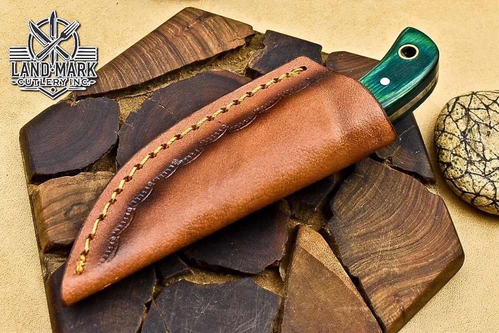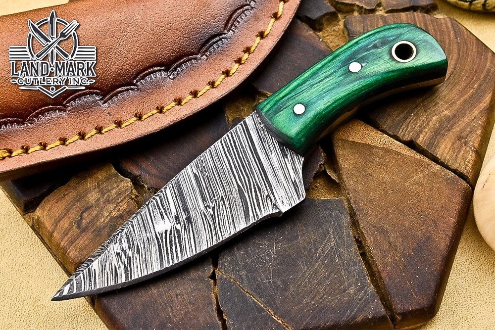 This Damascus steel hunting knife is a stunner—razor-sharp, perfectly balanced, and the green Pakka wood handle feels luxurious. The leather sheath is a sleek touch. I love the craftsmanship; it's a reliable little beast for outdoor tasks. The combined shipping discount is a nice bonus if you grab more than one. Great value for such a well-made blade!