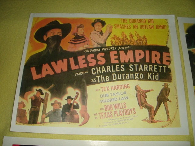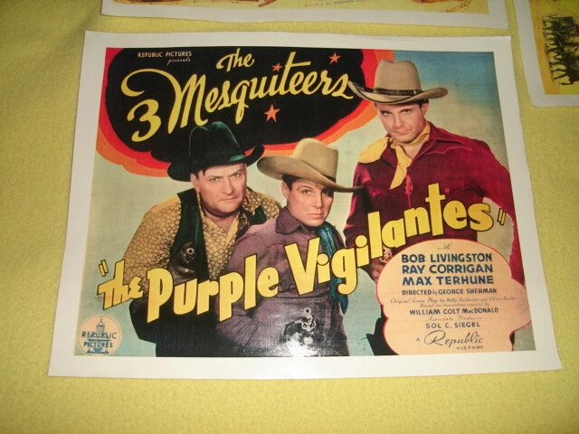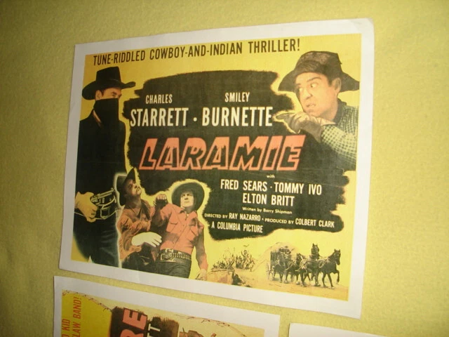 Three 11"x14" movie lobby cards posters all in very good to excellent condition: 1938's THE PURPLE VIGILANTES by Republic Pictures presents the 3 Mesquiteers (Bob Livingston, Ray Corrigan, Max Terhune) Nice glossy paper very clean (no watermark on paper on back); may be original but not sure 1949's LARAMIE by Columbia Pictures starring Charles Starrett and Smiley Burnette Matte finished paper with "Hammermill Laser Plus" lightly watermarked on back of paper, may not be original but not sure 1945's LAWLESS EMPIRE by Columbia Pictures starring Charles Starrett as The Durango Kit & Bob Wills and his Texas Playboys Matte finished paper with "Hammermill Laser Plus" lightly watermarked on back of paper, may not be original but not sure I'm not a movie lobby care / poster expert, so if you have any questions, please ask before bidding See my other movie posters listed on Ebay