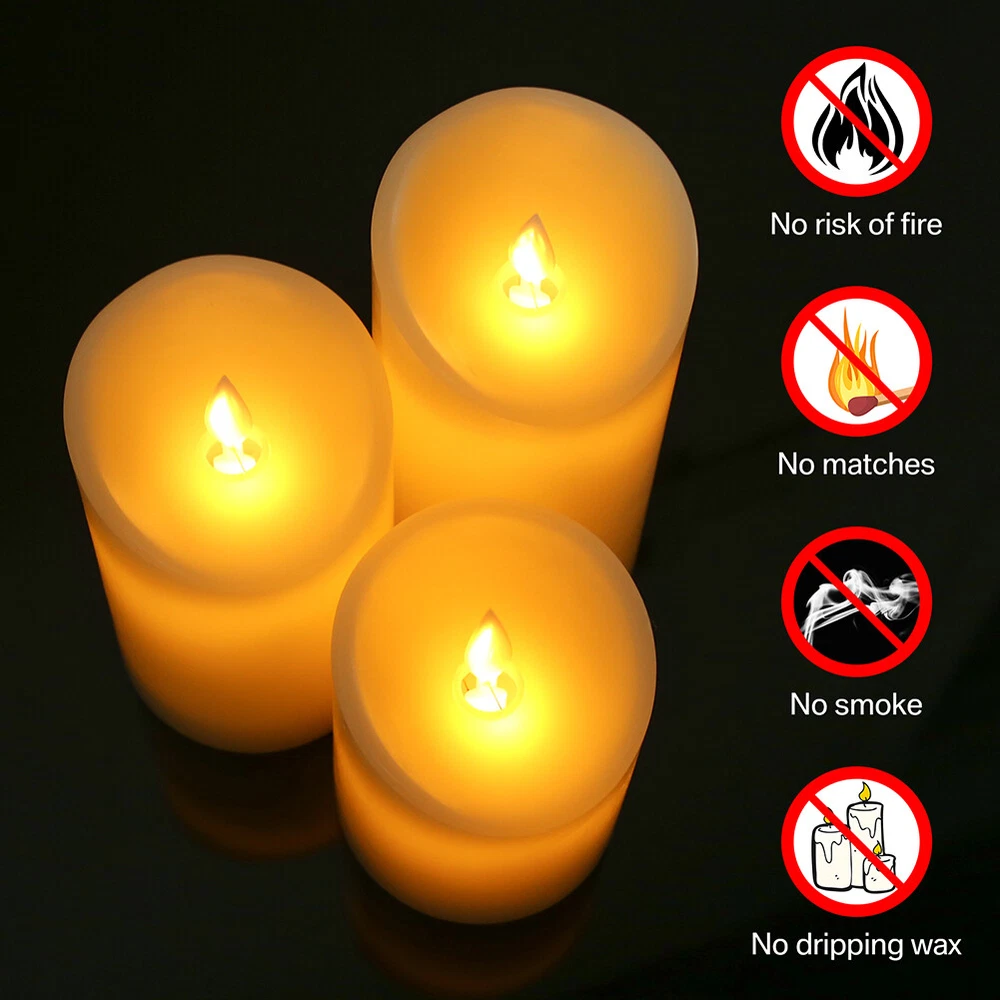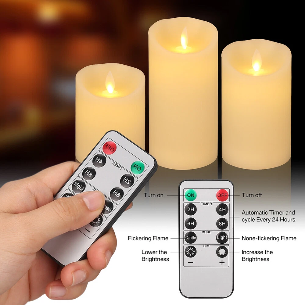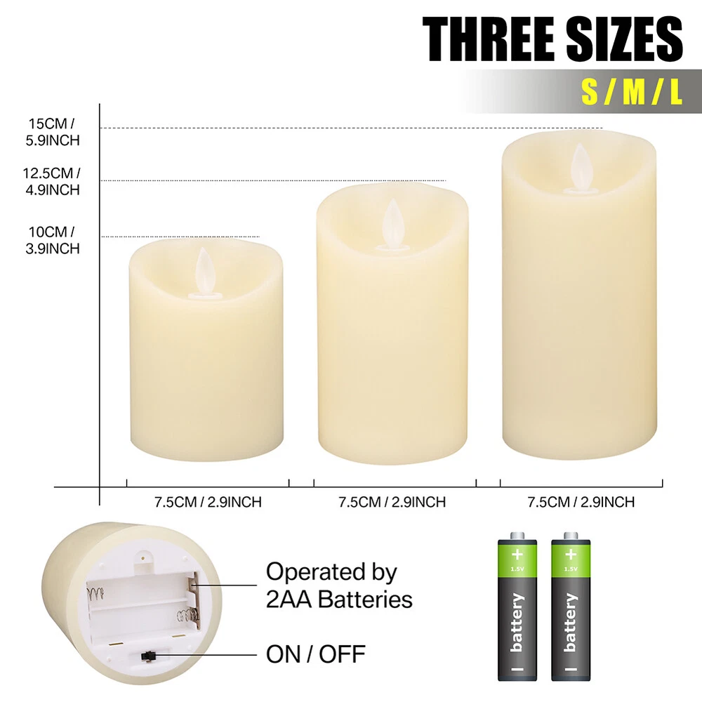 Descriptive: 3 LED Flameless candle (Size: Φ 7.5cm x H 10/12.5/15cm / Φ 2.9" x H 4"/5"/6"), 1 remote control,. Batteries are NOT include This big diameter and 3 different heights flameless candles can decorate your happy time! Safe To Use Around Children and Pets:Light is created by LED, The LED flameless candles without real fire, never worry about fire-related accidents again. Each LED bulb delivers 50,000 hours of lamp life. Use of 2 high-grade AA batteries that will provide 300 hours of continuous ambience 10-KEY REMOTE CONTROL with 16.4-foot range lets you display candles in hard-to-reach places. Timer feature lets you schedule your candles in 2-, 4-, 6- and 8-hour increments, cycling every 24 hours SMOKELESS AND DRIPLESS CANDLES with smooth, classic ivory color are ideal for bookshelves, bedrooms and as safe focal points in holiday wreaths and centerpieces These decorative moving wick candles can be widely applied to birthday, Christmas, home decorations, bars, hotel, parties, holidays, wedding, or other occasions. Specification: Product: LED Candle Lamp Material: ABS Color: Ivory Size: Φ 3" x H 4"/5"/6" On-Off Button: Illuminating the Candle On=Off (Note:Before you use the Remote Control, switch the ON-OFF button to ON at the bottom of the LED candles). How to illuminating the Candle: Move the OFF-ON switch on the bottom to ON. The candle will illuminate until you manually move the switch to OFF. ON-OFF button: Illuminating the Candle On=Off (Note:Before you use the Remote Control, switch the ON-OFF button to ON at the bottom of the LED candles). TIMER: set On/Off Automatic Time feature, set to 2Hours/4Hours/6Hours/8Hours. Mode: Candle-Flickering Lights; Light-Non-Flickering Lights. Brightness Control: Left button to lower the brightness Right button to increase brightness. Package Included: - 1 x LED Candles (Size: D 2.9" x H 4") - 1 x LED Candles (Size: D 2.9 " x H 5") - 1 x LED Candles (Size: D 2.9 " x H 6") - 1 x 10 Key Remote Control More Tips: 1. This candle is made of real wax and is flammable. Do not attempt to light this candle. 2. Keep out of direct sunlight, away from heat sources and out of extreme temperatures or your candle may soften or melt. 3. Constant use of the timer however may considerably reduce battery life.