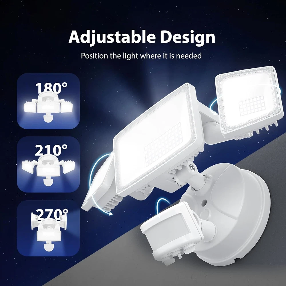 Excellent Brightness: This LED outdoor floodlight has a 65-watt, 6500 lumens and 6500 Kelvin daylight white optical setting, that provides you a super bright area of 1150 sq. ft; This is definitely a great extra layer of security for your house Energy Saving: Not only does the security light provide optimal lighting, but it also offers incredible energy savings; Featuring state-of-the-art LED technology, 112 120 LM/W high quality and efficiency LED beads can 85% of your electricity bill Motion Activated: This outdoor security light is equipped with the most popular PIR tech-motion detection activated mode; The built-in motion sensor detects movement within a wide range (max 72 feet), ensuring that your space is always well-lit when you need it Outstanding Quality: The cover of this outdoor flood light is made of die-cast aluminum, which provides efficient dissipation and ensures its long lifespan; Beaded cover can effectively avoid dazzling light, taking care of your eyes Simple Installation: Easy to install, little tools and user-friendly, also a best choice for DIY customers with it's broad feature set for every application Product Description 1 Energy Saving 2 Reliable Design 3 Motion Detector