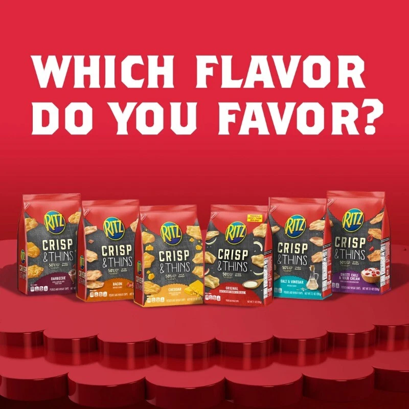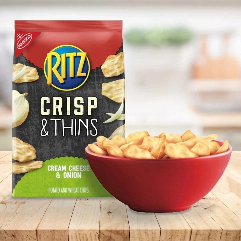 RITZ Crisp and Thins Cream Cheese and Onion Potato and Wheat Chips are light chips that are oven baked, not fried, with a crispy, thin shape and an irresistible crunch. These reduced fat chips contain 50 percent less fat than the leading regular fried potato chips. Pack these snack chips in lunchboxes for a crunchy companion to sandwiches, or add them to your snack food shelf as a tasty after school treat. Serve these cream cheese and onion chips alongside other shareable foods or by themselves for a light and airy snack that's great for munching without filling up. Each 7.1 ounce bag of RITZ Crisp and Thins is sealed to lock in freshness and great taste. One 7.1 oz bag of RITZ Crisp and Thins Cream Cheese and Onion Chips (packaging may vary) Light and airy chips are great for munching without filling up Crispy, thin chips with 50% less fat than the leading regular fried potato chips A crunchy snack for home, work or school A sealed bag keeps these oven baked chips fresh until you're ready to enjoy Our mission at Mondelēz International is to create more moments of joy and build the best snacking company in the world by growing our people, growing our business and growing our impact on the world around us