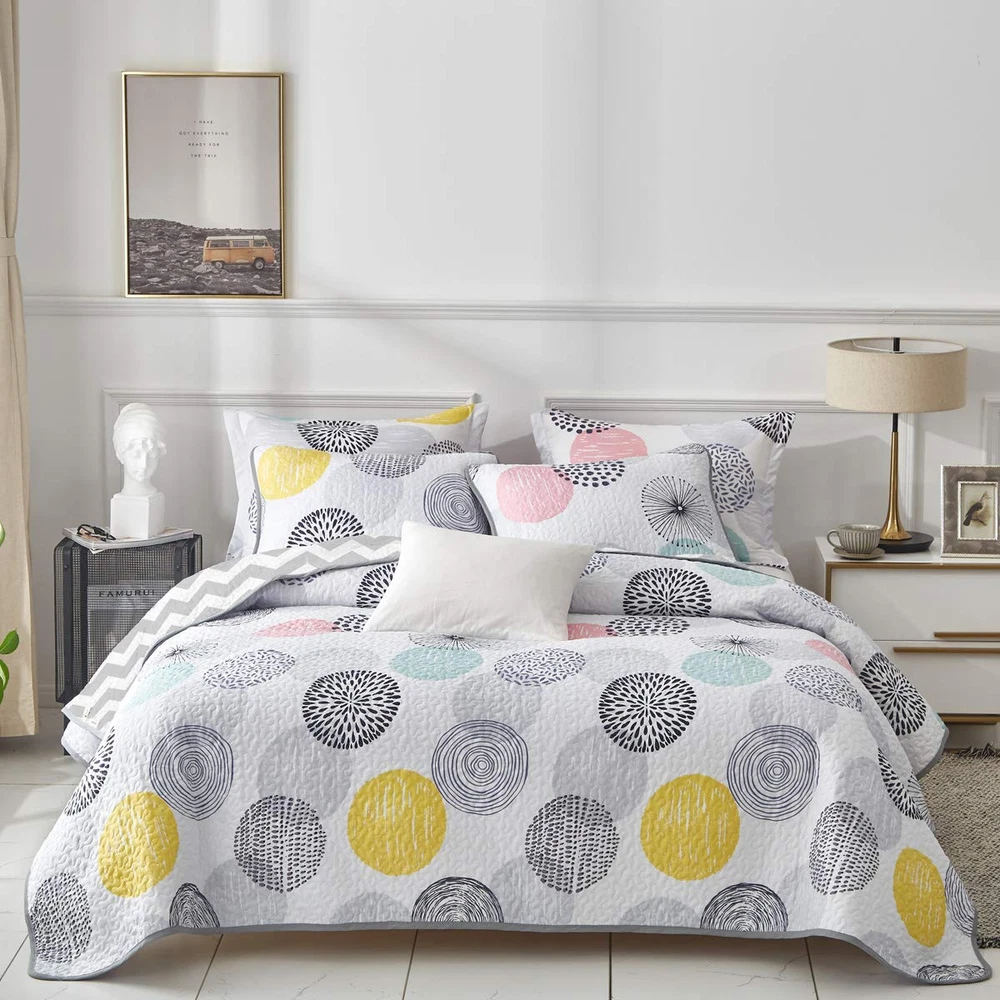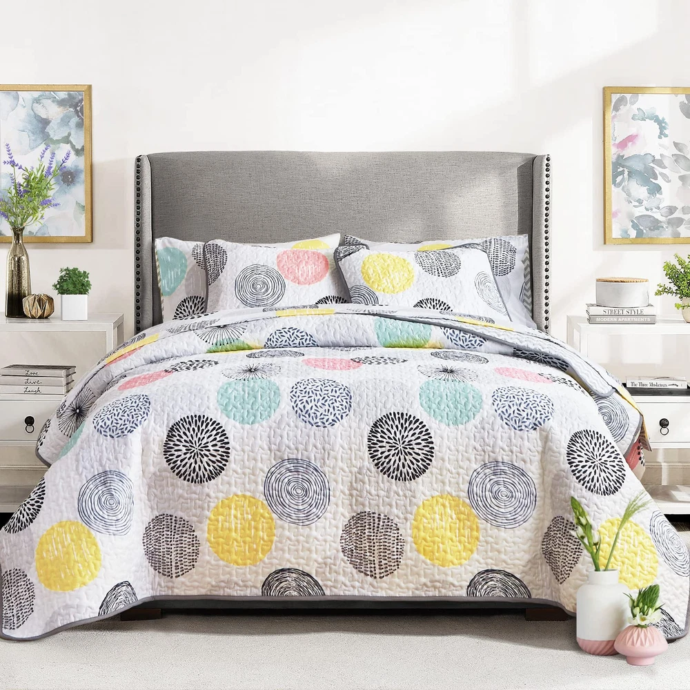 DESIGN DETAILS: A Side - Colorful dots (pink,gray,yellow Cyan Black) style with B side - White Gray Stripes Style, Twin Queen King size available most suitable for your bedroom, guest room, children's room, holiday house, dormitory,etc BEST FOR YOUR BED: Easily cover all sides and end of your bed, even with extra layers of padding(If you need a quilt that drapes all the way to the floor, you may have a low bed or choose a larger size)! Try our quilt set, you will sleep on a luxurious beautiful and cute bed MULTI-PURPOSE USAGE: Perfect coverlet quilt for spring or the coming summer or warmer weather, a little cool feeling for the hot weather, also can use in winter as a blanket. Order 1 set and use all season. Use as quilt,bedspread, comforter set, blanket,bed cover. EASY CARE: Easy to clean (NO Dog's or Cat's hairs pets' fur left) Machine wash in cold. Tumble dry low. Package Include: 1 Queen Quilt 90"x90" and 2 Pillow sham (20"x26") 00000 Try bigger Size (King or CakIing) if you want to drape to floor. Want a cover for this quilt? Search Duvet Cover Set on and find more collection! We also have the same style sheet set and comforter, If you want them, just search Uozzi colorful dots on