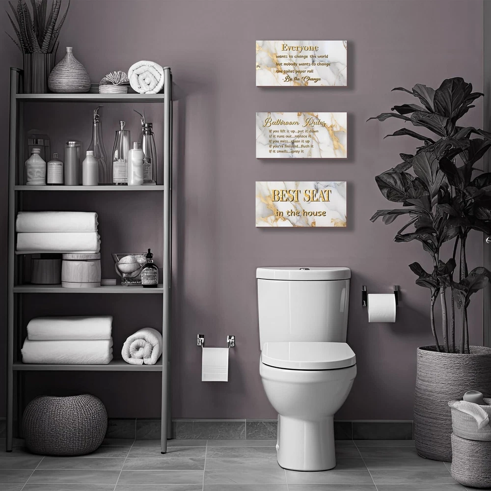 3 Pieces White Gold Bathroom Decor Bathroom Rules Wall Art White Gold Bathroom Rules Best Seat in The House Rustic Farmhouse Wooden Sign for Bathroom Toilet Wall Decor (White Gold 10x5) Product Details Color: White Gold Brand: DONFENTHY MPN: DON0012WHITE GOLD UPC: Does not apply EAN: Does not apply Color: White Gold Brand: DONFENTHY Material: Wood Theme: Flower Recommended Uses For Product: Bathroom decor and enhancement Mounting Type: Wall Mount Product Dimensions: 10"L x 5"W Shape: Rectangular Style: Rustic Item Weight: 8.8 ounces Elevate Your Bathroom Decor with a Set of 3: A trio of charming white gold bathroom rule wall decor pieces, each adorned with a captivating white gold flower background and a delightful phrase, like "Best Seat in the House." Suitable for a cohesive and stylish bathroom upgrade. Ideal Dimensions for Bathroom Elegance: Crafted at an ideal size of 10 x 5 inches, our white gold bathroom rule signs strike the right balance between visibility and subtlety. Hang them effortlessly on your toilet wall, creating a focal point that adds a touch of sophistication to your space. Quality Craftsmanship for Lasting Appeal: Meticulously crafted from quality materials, these rustic farmhouse wooden grey bathroom rule signs boast quality that stands the test of time. The 0.2-inch thickness adds a robust feel, ensuring they remain a timeless addition to your bathroom decor. Transform Your Space with Eye-Catching Charm: Catch attention and admiration with our white gold bathroom rule wall art. The white gold marble background and interchangeable bathroom rules not only create an inviting atmosphere but also leave a lasting impression of cleanliness and warmth on your guests. Versatile Decor for Every Bathroom Theme: Tailored for the bathroom theme, these white gold wall decor pieces effortlessly blend into any washroom aesthetic. With the right quantity and ideal dimensions, they become the focal point, effortlessly tying together the elements in your bathroom for a cohesive and inviting atmosphere.