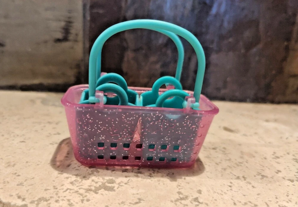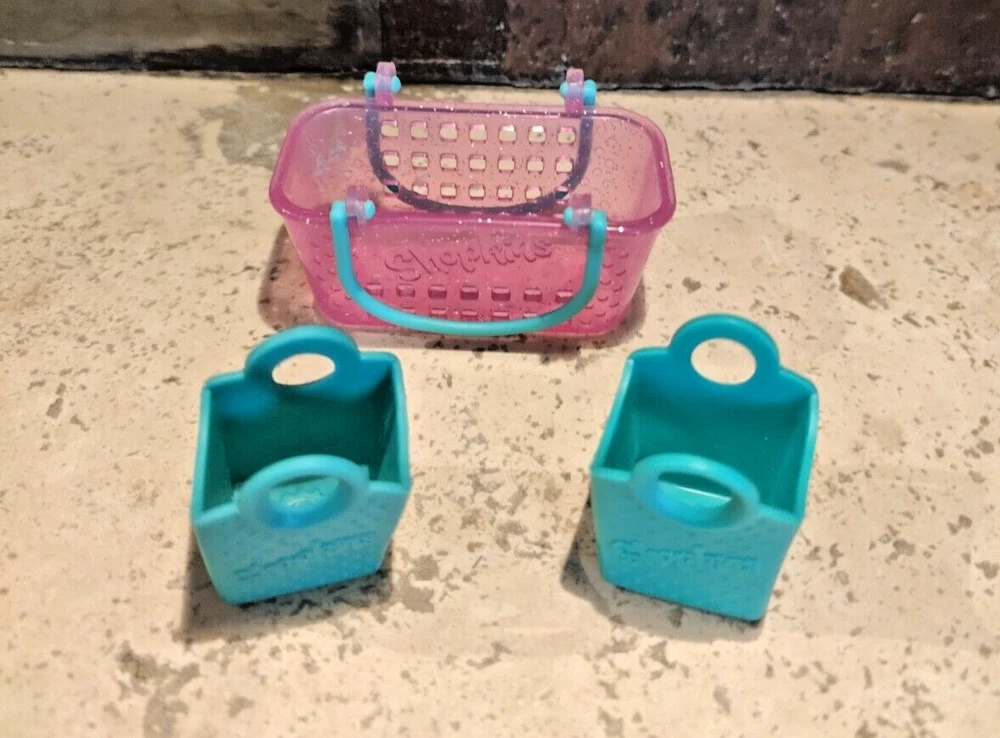 This Shopkins shopping baskets are the perfect addition to any collection. The large basket features a pink color with sparkly details and green handles. Also included is one small green and one small pink for a total of 3 baskets. (toy8)