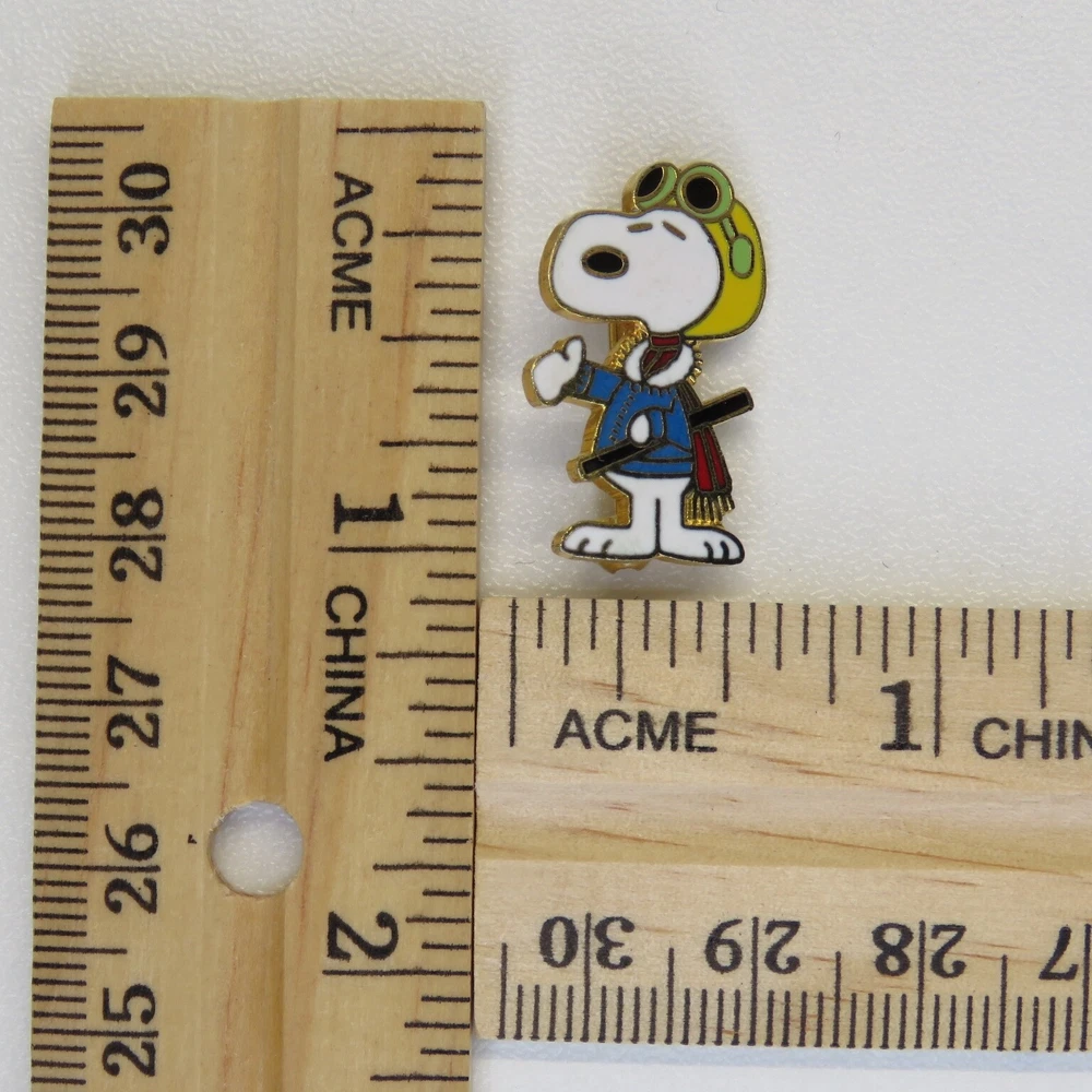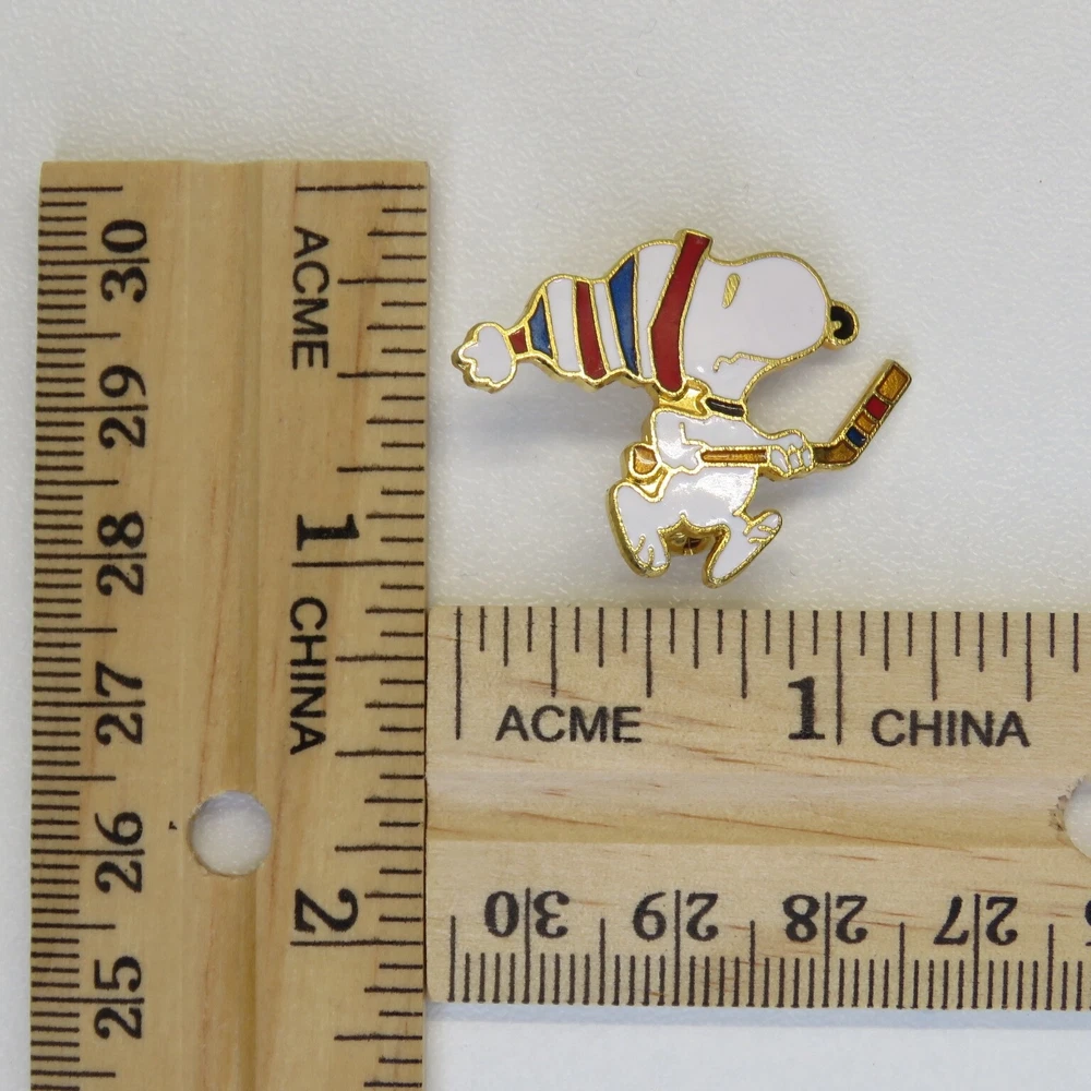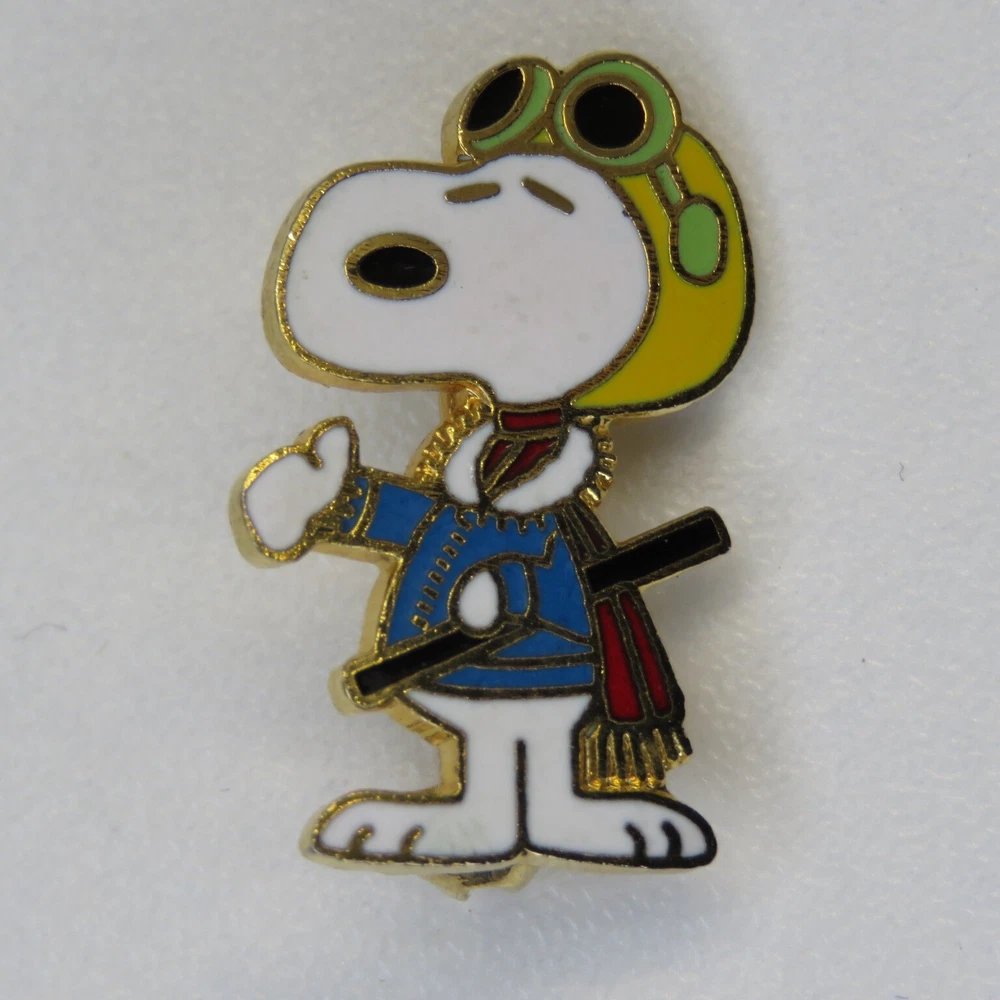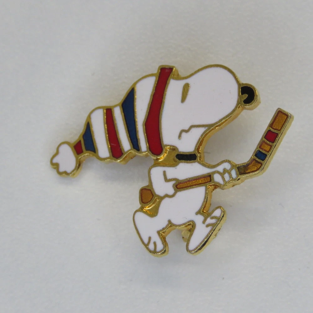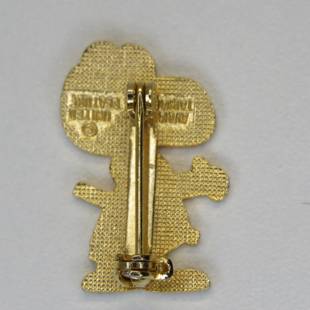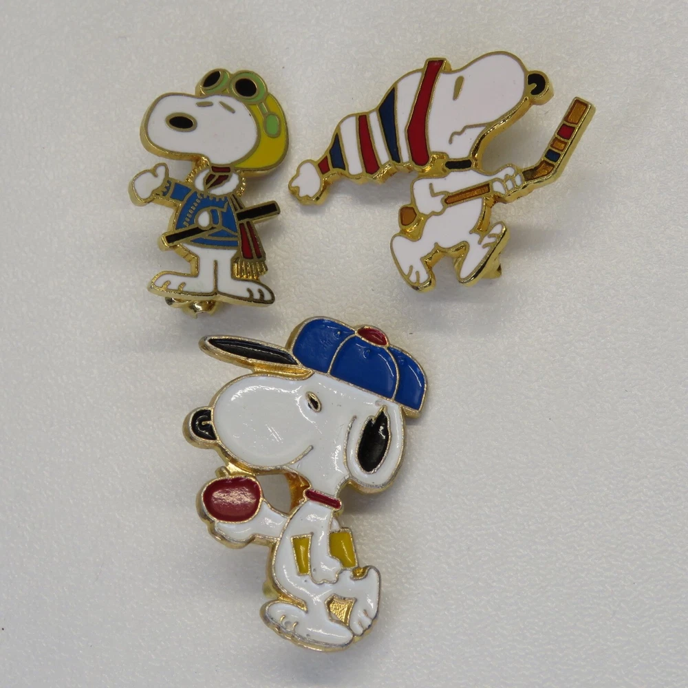 This is a lot of three vintage Snoopy lapel pins. The pins are marked on the backsides "United Features" and "Aviva Taiwan". The pins have enamel set in a gold tone metal. The apple carrying Snoopy has a lower quality enamel with manufacturing flaws in the form of small broken bubble spots. All pin mechanisms are in working order with the pilot and hockey pins measuring approximately 1 inch in height. Please look closely at the pictures for actual condition and pins included. Please contact me with any questions. When possible I can combine shipping on multiple purchases. Please wait for a revised invoice before paying. Check out my other cool items!