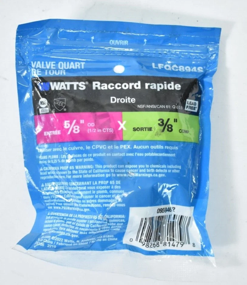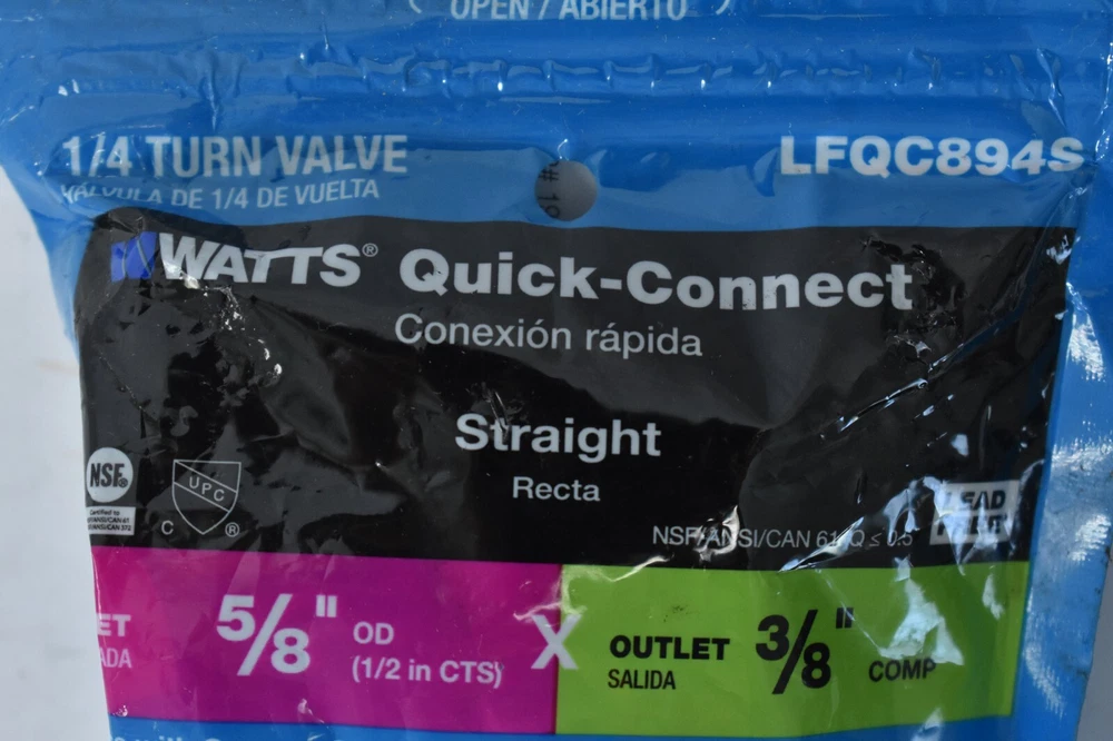 Qty 3 Watts Lead Free C1/4 Turn Valve Quick Connect Straight LFQC894S Inlet: 5/8" OD (1/2" CTS) Outlet: 3/8" Comp All are New in Sealed Package Location: F11
