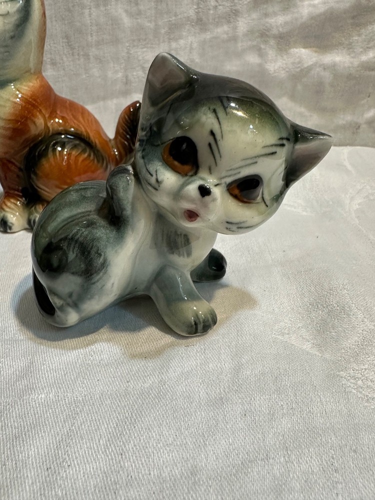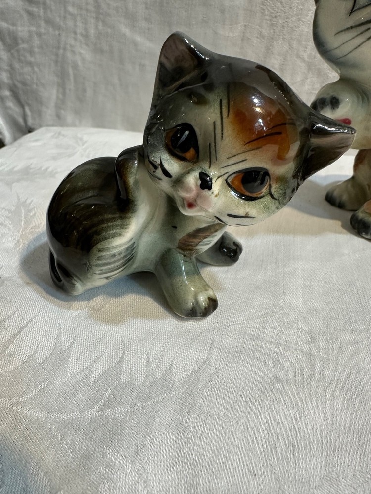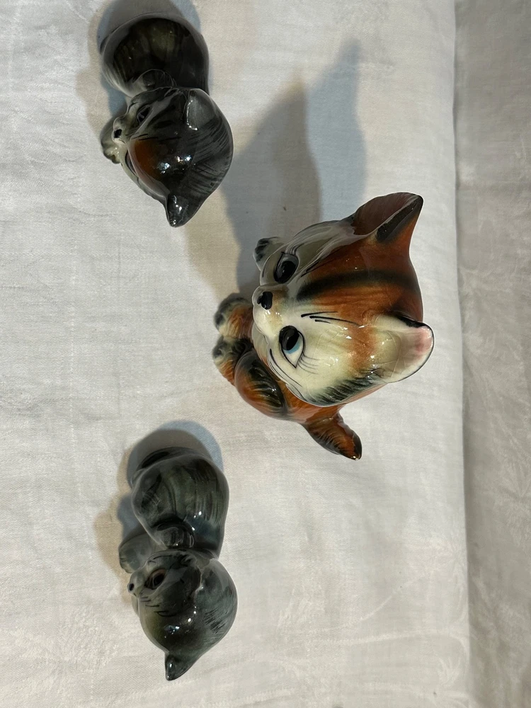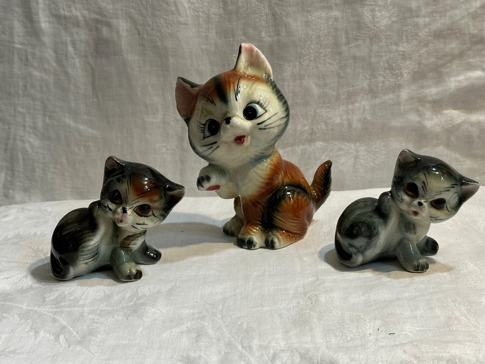 The product is a set of three vintage 1950's Anthropomorphic cats from Japan. The largest cat is a 6" calico cat, while the other two are 3" tabby cats. Made of porcelain, these figurines depict cats with human-like features, adding a unique touch to any collection of cat-themed items. Their origins in Japan add a cultural element to their charm, making them a special addition for collectors interested in international memorabilia. Cat on the right had a foot repair other 2 in good condition. See photos for reference