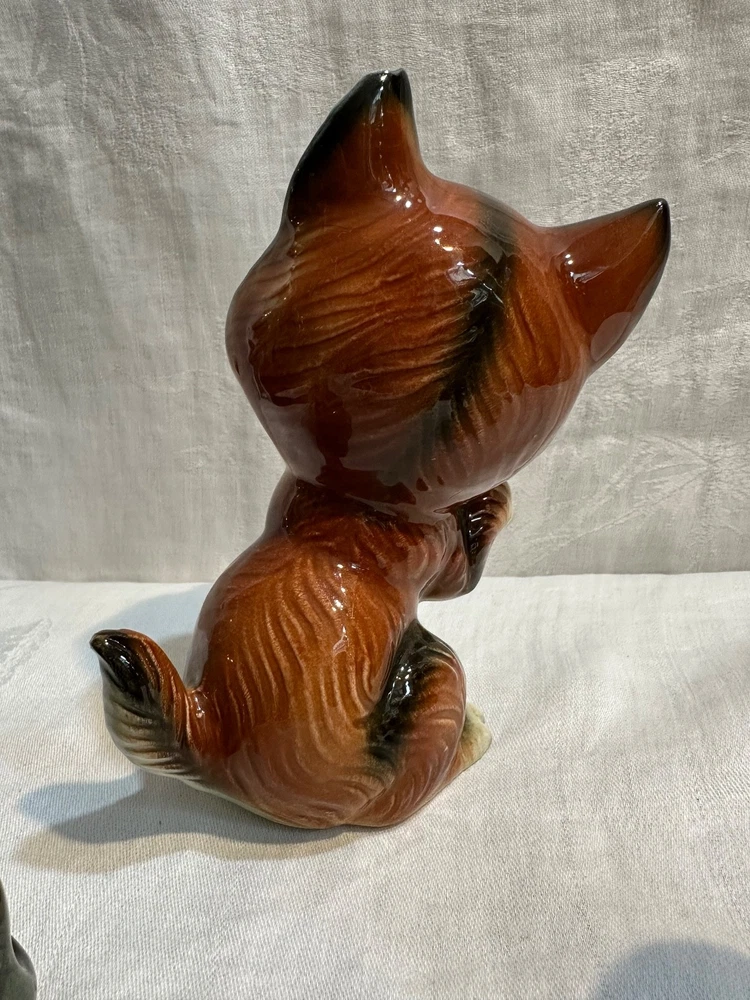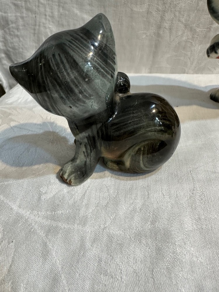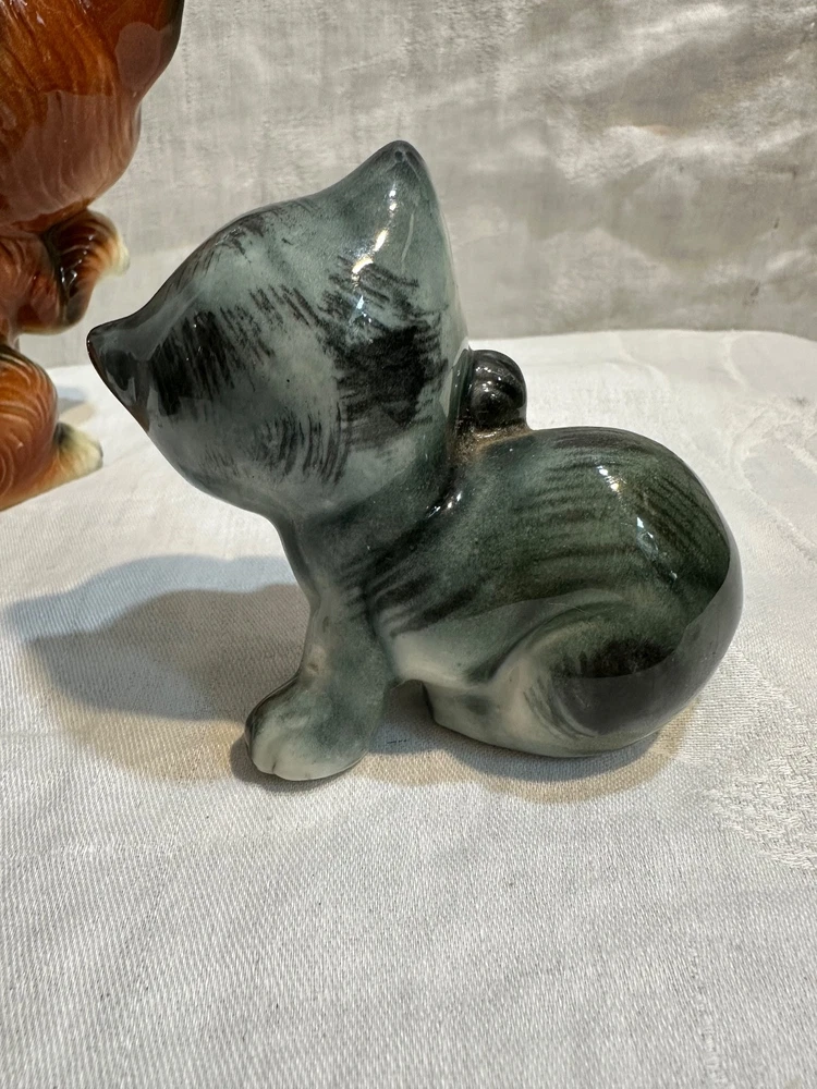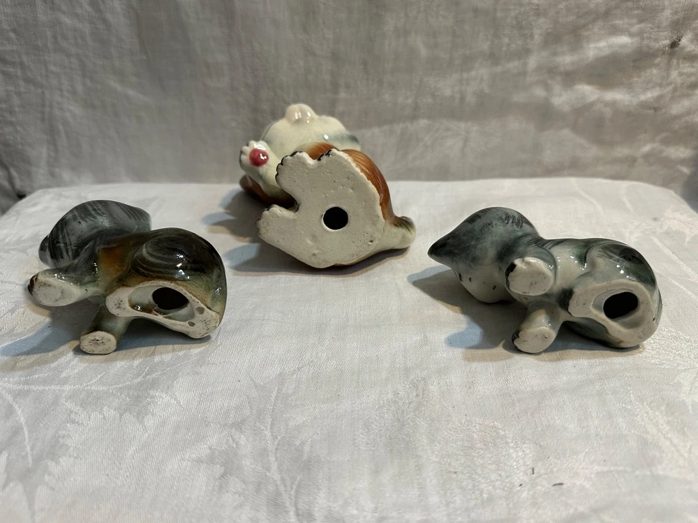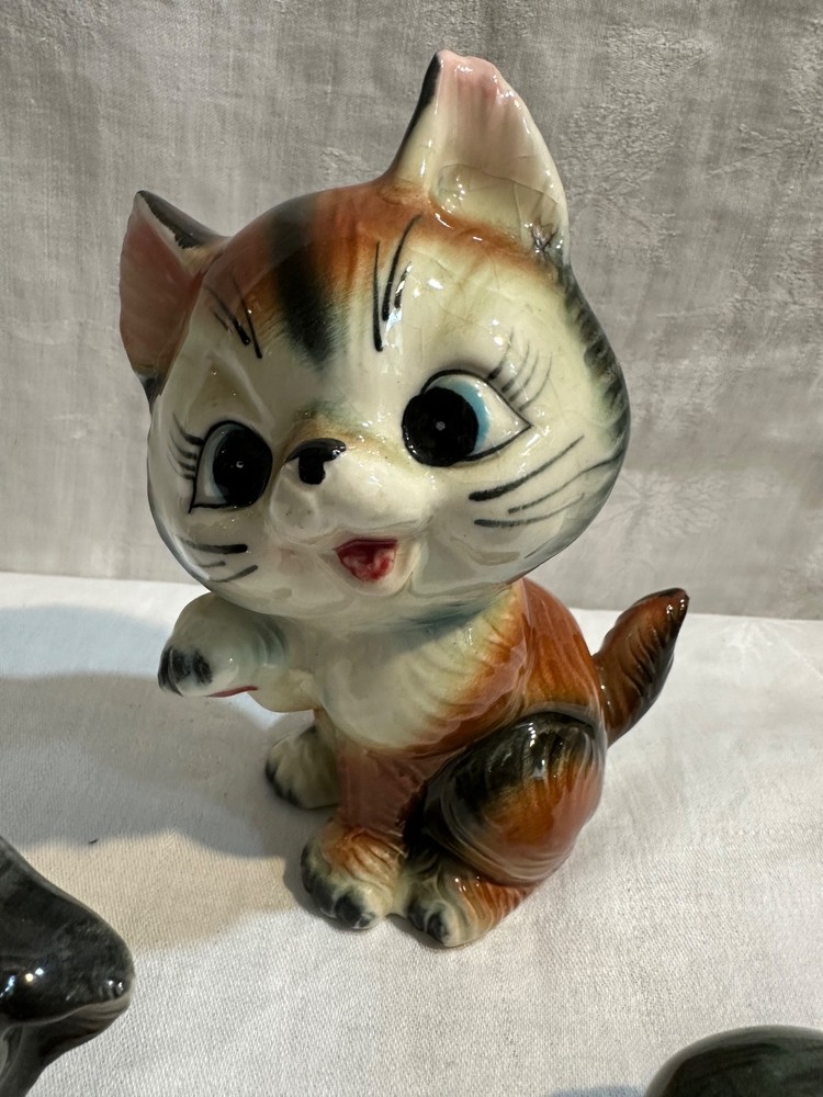 The product is a set of three vintage 1950's Anthropomorphic cats from Japan. The largest cat is a 6" calico cat, while the other two are 3" tabby cats. Made of porcelain, these figurines depict cats with human-like features, adding a unique touch to any collection of cat-themed items. Their origins in Japan add a cultural element to their charm, making them a special addition for collectors interested in international memorabilia. Cat on the right had a foot repair other 2 in good condition. See photos for reference