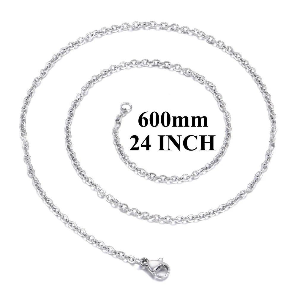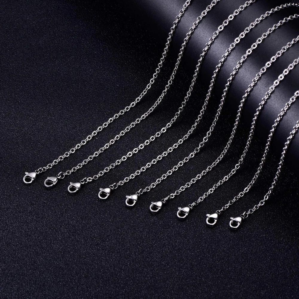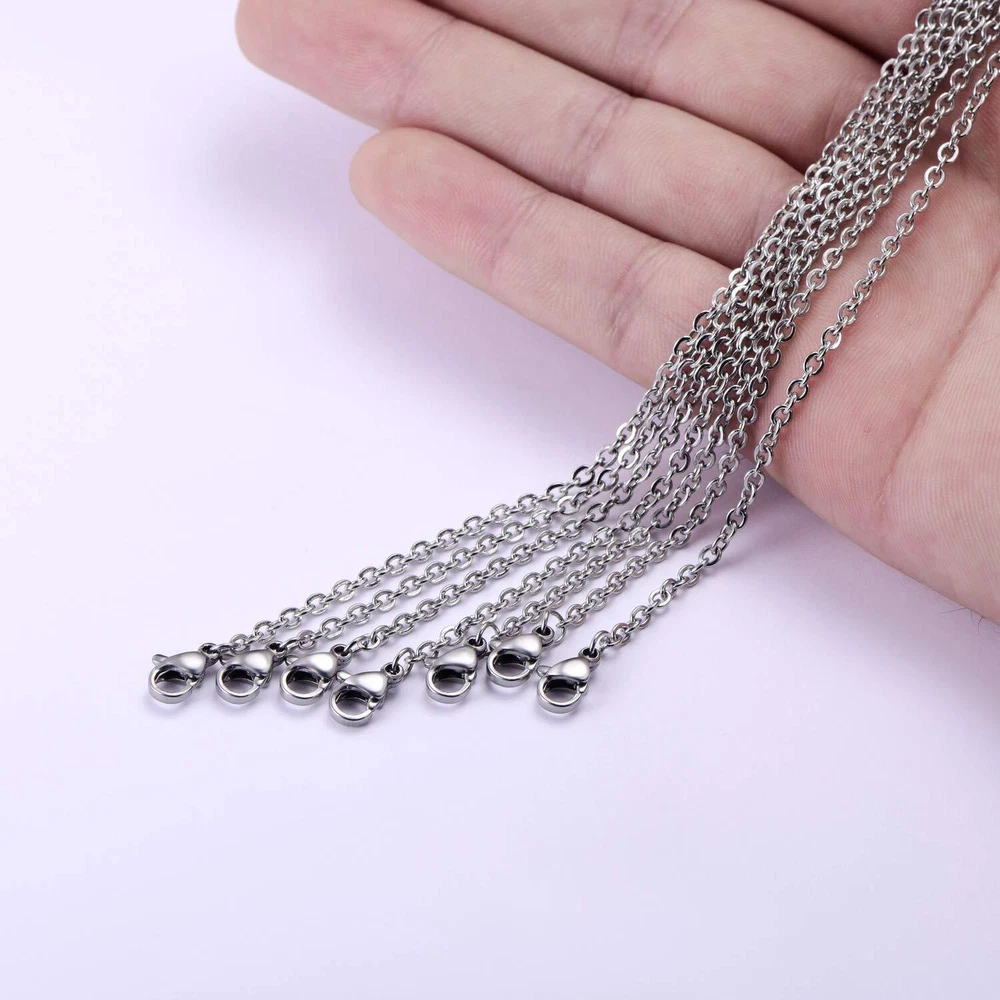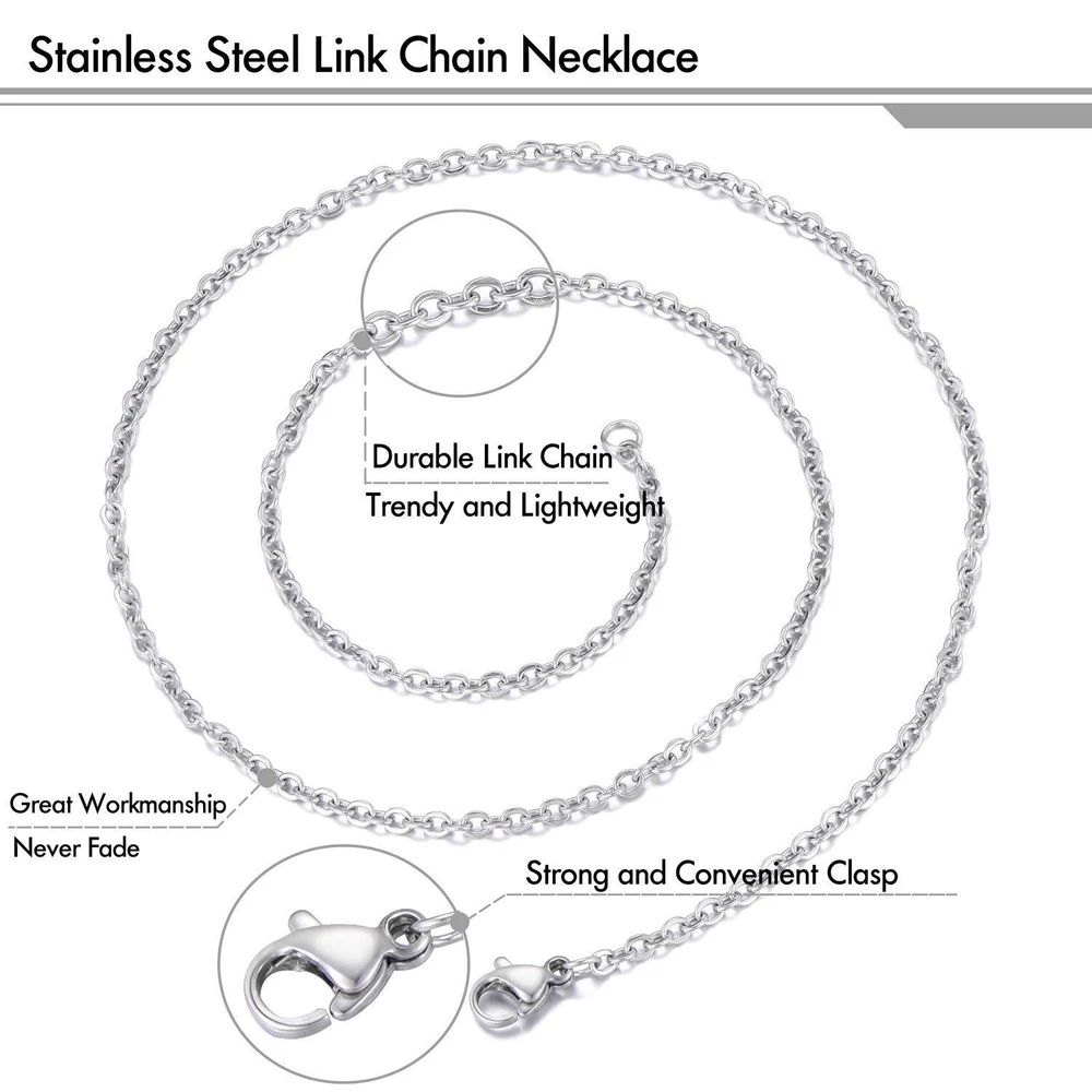 necklace chain features classic oval links, perfect for layering, wearing alone or matched with your favorite charms and pendants. Product Feature: - Size: 24 inches (60 cm) in length - Material: stainless steel - Color: stainless steel color, won't fade Package Included: - 30 pack stainless steel necklace chains - 1 x handy storage box : We are committed to providing exceptional customer services. Please us if you're not satisfied or if you get defective products. A or will be offered with no question asked Great Value: necklace chain bulk come with 30 pieces stainless steel cable necklace chains individually packed in a convenient storage box, enough for your jewelry making project Well Made: All the jewelry chains are made of high-quality stainless steel, durable and bright. These cable chains are tarnish resistant and anti-allergic, safe for most skin types Perfect Size: The length of each chain necklace is approx. 24 inches (60 cm), the width is approx. 2 mm. Perfect size for wearing alone or with your favorite pendant Widely Used: These chain neckalces are perfect for jewelry pendants and you can use them to create pendant necklaces of your own style to show your personality : We are committed to providing exceptional customer services. Please us if you're not satisfied or if you get defective products. A or will be offered with no question asked
