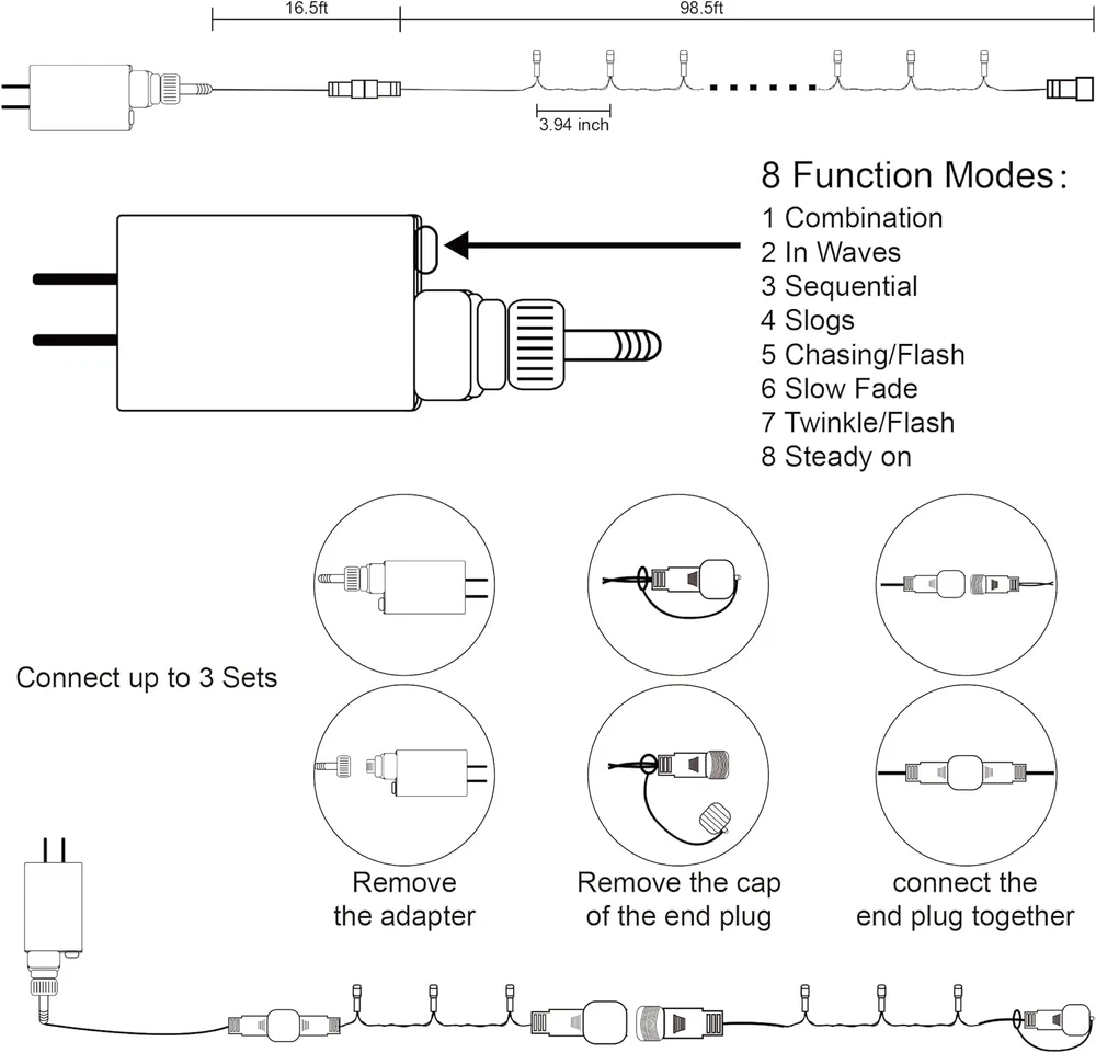 Store New Arrivals Add to Favorite View Feedback Contact Fast deliveries to the customer's home Quality customer service John Make the customers happy! 300 LED String Lights Outdoor Indoor, Extra Long 98.5FT Super Bright Christmas Lights, 8 Lighting Modes, Plug in Waterproof Fairy Lights for Holiday Wedding Party Bedroom Decorations ( White) Description 98.5ft Christmas Decorations string lights: With 300 Cool White individual LED bulbs. Each lights has end-to-end connection, you can connect up to 4 sets together to illuminate a wider range. 8 Lighting Functions: Our Halloween string lights have 8 lighting modes: combination, in waves, sequential, slogs, chasing/flash, slow fade, twinkle/flash, and steady on. Fit different occasions, moods, feelings, holidays, festivals, anniversaries, etc. Pressing the round button on the transformer to change the lighting modes. 29V low voltage string lights: Keep at a low temperature state after lighting up for hours, ensure and maximize the safety. Directly plug in and unplug it for power on and off. US standard outlet, voltage 110V. Adapter to the first LED light: 16.5ft. Total length(lights string and leading line): 115ft. Waterproof & Widely Use: The strong construction makes the string lights tough and Christmas, Halloween, Thanksgiving, wedding, party, home, bedroom, wall, garden or balcony decorations. Product Description Feature: 300 LED 98.5ft White Xmas String Lights 98.5ft Xmas Decorations string lights with 300 White individual LED bulbs. Perfect for indoor and outdoor decorations. 8 lighting modes: combination, in waves, sequential, slogs, chasing/flash, slow fade, twinkle/flash, and steady on. Perfect for Christmas, Halloween, party, Valentine's Day, wedding, home, window, bathroom, festival, Holiday, shows, restaurant, hotel, commercial building, shopping center etc. Specification: Material: Plastic Light Color: Cool White LED Count: 300 pcs Total Length (end to end): 115FT String lights: 98.5FT Waterproof Level: IP44 Voltage: 110V Output: 29V safe low voltage Power Supply: Adapter Powered Package Including: 1 x 300 LED White String Lights Some More Christmas Decorations Add to Cart Add to Cart Add to Cart Add to Cart Add to Cart Add to Cart Customer Reviews 4.4 out of 5 stars 197 4.4 out of 5 stars 197 4.4 out of 5 stars 197 4.4 out of 5 stars 197 4.1 out of 5 stars 714 4.5 out of 5 stars 276 4.5 out of 5 stars 276 Price $37.99 $ 37 . 99 $39.99 $ 39 . 99 $39.99 $ 39 . 99 $37.99 $ 37 . 99 — $29.69 $ 29 . 69 $26.99 $ 26 . 99 Package: 1 Pack 1 Pack 1 Pack 1 Pack 1 Pack Set of 4 Set of 3 Number of Light Sources: 1000 LED 1000 LED 1000 LED 1000 LED 10 Count 70 LED 60 LED Powered Source: Adapter Powered Adapter Powered Adapter Powered Adapter Powered Plug In Adapter Powered Adapter Powered Material: Plastic Plastic Plastic Plastic Plastic PVC Plastic, Metal PVC Plastic, Organza Light Color: Cool White Warm White Multicolor Red & Green Clear Warm White Warm White Some More Christmas Decorations Add to Cart Add to Cart Add to Cart Customer Reviews 4.3 out of 5 stars 131 4.3 out of 5 stars 131 4.4 out of 5 stars 395 4.4 out of 5 stars 395 4.4 out of 5 stars 395 4.4 out of 5 stars 75 4.1 out of 5 stars 169 Price — — $14.99 $ 14 . 99 — — $25.99 $ 25 . 99 $24.99 $ 24 . 99 Package: 1 Pack 1 Pack 2 Pack 2 Pack 2 Pack Set of 6 2 Pack Number of Light Sources: 50 LED 50 LED 50 LED Each 50 LED Each 50 LED Each 100 Count 100 LED Powered Source: Adapter Powered Adapter Powered Battery Powered Battery Powered Battery Powered Plug In Battery Powered Material: Plastic Plastic Plastic Plastic Plastic Plastic Plastic Light Color: Warm White Multicolor Multicolor Cool White Warm White Clear Warm White Warm White Some More Christmas Decorations Add to Cart Add to Cart Add to Cart Add to Cart Add to Cart Add to Cart Add to Cart Customer Reviews 4.6 out of 5 stars 14,708 4.6 out of 5 stars 14,708 4.5 out of 5 stars 2,224 4.5 out of 5 stars 2,224 4.5 out of 5 stars 2,224 4.5 out of 5 stars 2,224 4.5 out of 5 stars 2,224 Price $27.99 $ 27 . 99 $19.99 $ 19 . 99 $11.89 $ 11 . 89 $11.89 $ 11 . 89 $11.04 $ 11 . 04 $9.98 $ 9 . 98 $11.89 $ 11 . 89 Package: 1 Pack 1 Pack 1 Pack & 3 Pack 1 Pack & 3 Pack 1 Pack & 3 Pack 1 Pack & 3 Pack 1 Pack & 3 Pack Number of Light Sources: 200 LED 200 LED 150 Each 150 Each 150 Each 150 Each 150 Each Powered Source: Adapter Powered Adapter Powered Plug In Plug In Plug In Plug In Plug In Material: Plastic Plastic Plastic Plastic Plastic Plastic Plastic Light Color: 20 Colors Red & Green Red Blue Green Clear Warm White Multicolor Some More Christmas Decorations Add to Cart Add to Cart Add to Cart Add to Cart Add to Cart Add to Cart Add to Cart Customer Reviews 4.6 out of 5 stars 4,715 4.6 out of 5 stars 4,715 4.4 out of 5 stars 191 4.4 out of 5 stars 191 4.6 out of 5 stars 14,708 4.6 out of 5 stars 14,708 4.6 out of 5 stars 14,708 Price $21.99 $ 21 . 99 $21.99 $ 21 . 99 $32.99 $ 32 . 99 $32.99 $ 32 . 99 $18.99 $ 18 . 99 $18.99 $ 18 . 99 $16.99 $ 16 . 99 Package: 1 Pack 1 Pack 1 Pack 1 Pack 1 Pack 1 Pack 1 Pack Number of Light Sources: 300 LED 300 LED 1000 LED 1000 LED 200 LED 200 LED 200 LED Powered Source: Adapter Powered Adapter Powered Adapter Powered Adapter Powered Adapter Powered Adapter Powered Adapter Powered Material: Plastic Plastic Plastic Plastic Plastic Plastic Plastic Light Color: Red Red & Green Warm White Multicolor Warm White Multicolor Green Some More Christmas Decorations Add to Cart Add to Cart Add to Cart Add to Cart Add to Cart Add to Cart Add to Cart Customer Reviews 4.5 out of 5 stars 742 4.5 out of 5 stars 742 4.5 out of 5 stars 742 4.5 out of 5 stars 742 4.4 out of 5 stars 5,088 4.5 out of 5 stars 683 4.5 out of 5 stars 683 Price $9.99 $ 9 . 99 $9.99 $ 9 . 99 $9.99 $ 9 . 99 $9.99 $ 9 . 99 $25.99 $ 25 . 99 $25.99 $ 25 . 99 $24.99 $ 24 . 99 Package: 8 Tubes 8 Tubes 8 Tubes 8 Tubes 1 Pack 1 Pack 1 Pack Number of Light Sources: 288 LED 288 LED 288 LED 288 LED 300 LED 300 LED 300 LED Powered Source: Adapter Pow