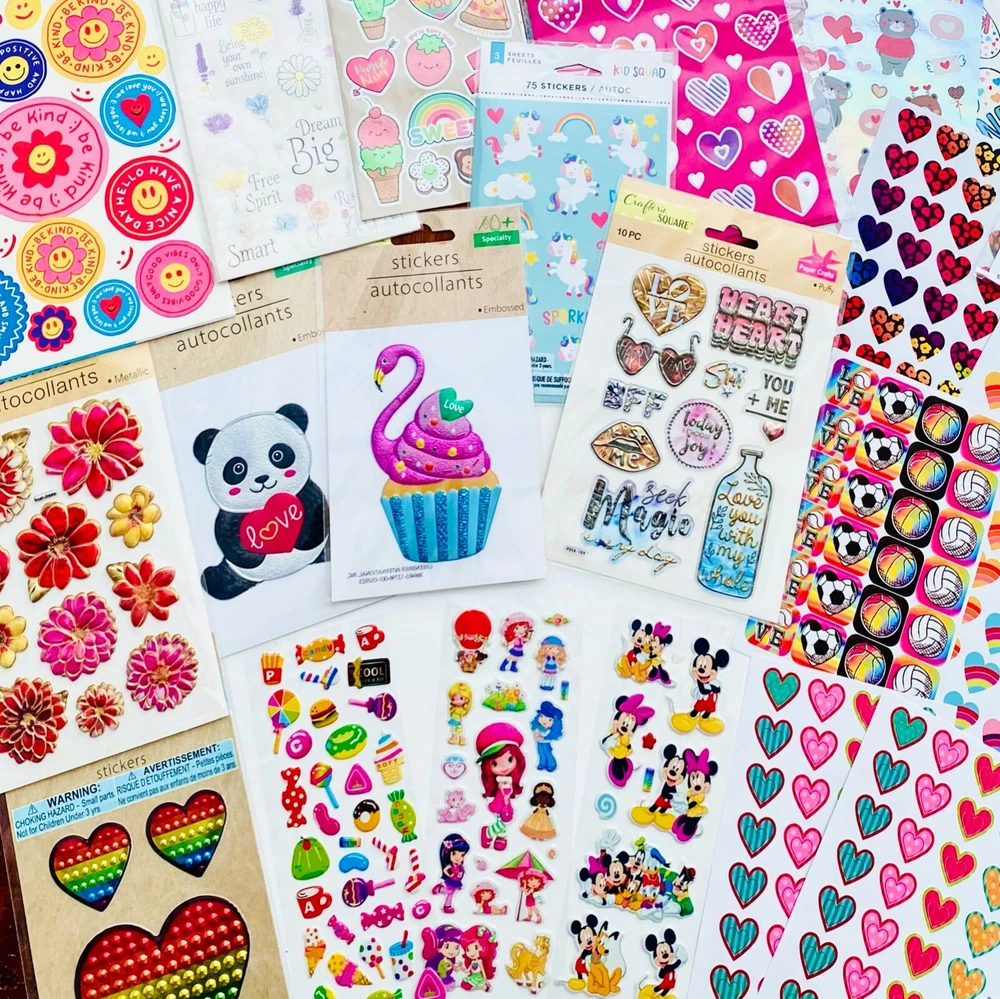 All stickers are BRAND NEW | New Full Sticker Sheets! Popular Mixed Sticker Lot | The Ultimate Kit | Qty. 300+ Stickers | High Quality Only! Fun Assortment of Puffy, Scrapbook, Cartoons, Bubble, Pop Up Stickers Packs For Everyone! I have included a large variety of pictures of the assortment available. The pictures give you an idea of what you will be receiving. Please Note: You will not receive everything pictured. Please contact me with any special requests. This HUGE Variety of fun designs stickers can be used in parties, classroom, school and home, good for reward for students, potty training, adding inside a birthday card, game activities, entertaining toddlers, etc. Perfect Gifts for Kids & all Occasions: Can be given as a gift for kids, girls, boys, toddlers, teens, students, friends, and classmates, they will love it! Each package of stickers is a different style & theme with some lovely embellishments like rhinestones, ribbons, buttons and other 3D details that make these quality stickers look so unique!