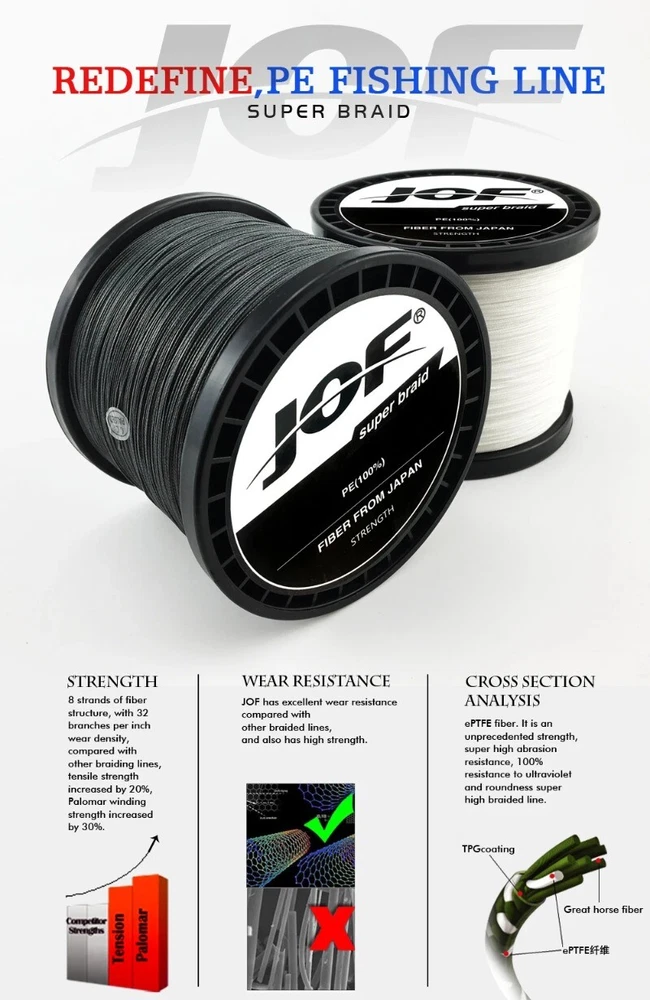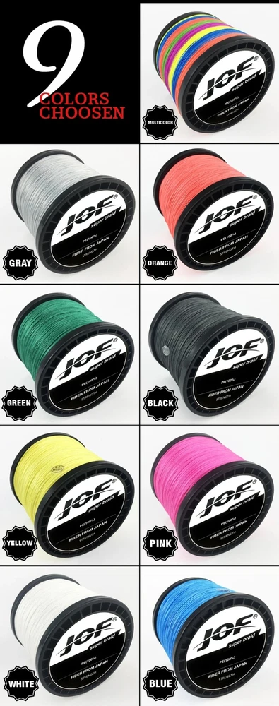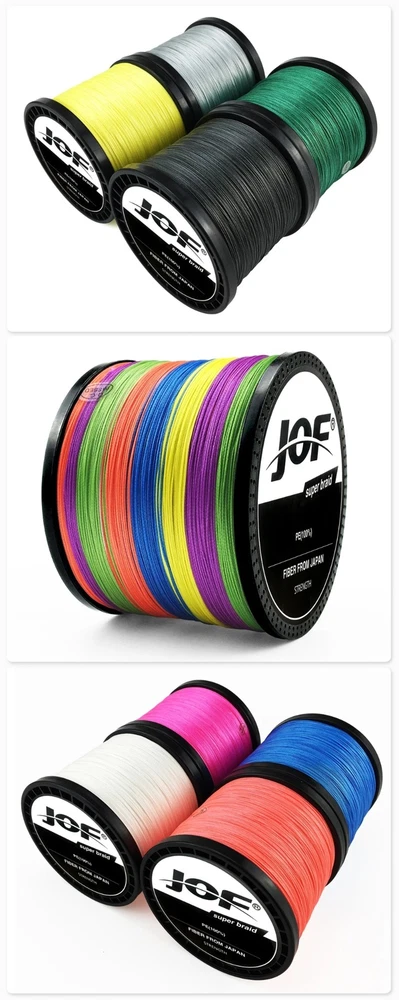 300M 500M 1000M 8 Strands 4 Strands 18-88LB PE Braided Fishing Wire Multifilament Super Strong Fishing Line Japan Multicolor BASIC INFORMATION Item: JOF Braided Fishing Line Threads: 8 Strands / 4 Strands (Optional) Length: 1000m 500M 300M (Optional) TEST LB for 8 Strands: 22 31 41 50 61 72 88 (Optional) TEST LB for 4 Strands: 10 12 18 28 35 40 50 60 82(Optional) Colors: Multicolor, Green, Gray, Yellow, Orange Black (Optional) PARAMETER FOR 4 STRANDS Line Number 0.4#: 0.10mm / 10LB / 4.8KG Line Number 0.6#: 0.12mm / 12LB / 5.6KG Line Number 1.0#: 0.16mm / 18LB / 8.3KG Line Number 2.0#: 0.23mm / 28LB / 12.7KG Line Number 3.0#: 0.28mm / 35LB / 16.2KG Line Number 4.0#: 0.32mm / 40LB / 18.5KG Line Number 5.0#: 0.37mm / 50LB / 22.6KG Line Number 6.0#: 0.40mm / 60LB / 27.2KG Line Number 8.0#: 0.50mm / 82LB / 36.8KG PARAMETER FOR 8 STRANDS Line Number 1.0#: 0.18mm / 22LB / 9.1KG Line Number 2.0#: 0.23mm / 31LB / 13.7KG Line Number 3.0#: 0.28mm / 41LB / 18.2KG Line Number 4.0#: 0.32mm / 50LB / 22.7KG Line Number 5.0#: 0.37mm / 61LB / 28KG Line Number 6.0#: 0.40mm / 72LB / 35.4KG Line Number 8.0#: 0.50mm / 88LB / 40KG Package Included 1pcs x Fishing Line SUPER BRAID PE(100%) PARAMETERS 8 strands & 4 strands REDEFINE,PE FISHING LINE *STRENGTH *WEAR RESISTANCE *CROSS SECTION ANALYSIS 9 colors choosen Multicolor, Green, Gray, Yellow, Orange Black,Pink,Blue,White (Optional) 8 STRANDS PE 8 Strands PE line,material from Japan,Unique Braid Construction,Made of ultra-high strength PE fibers 4 STRANDS PE 4 Strands PE line,material from Japan,Unique Braid Construction,Made of ultra-high strength PE fibers Strong abrasion resistanc Great knot strength Easy cuting water PRODUCT SHOW