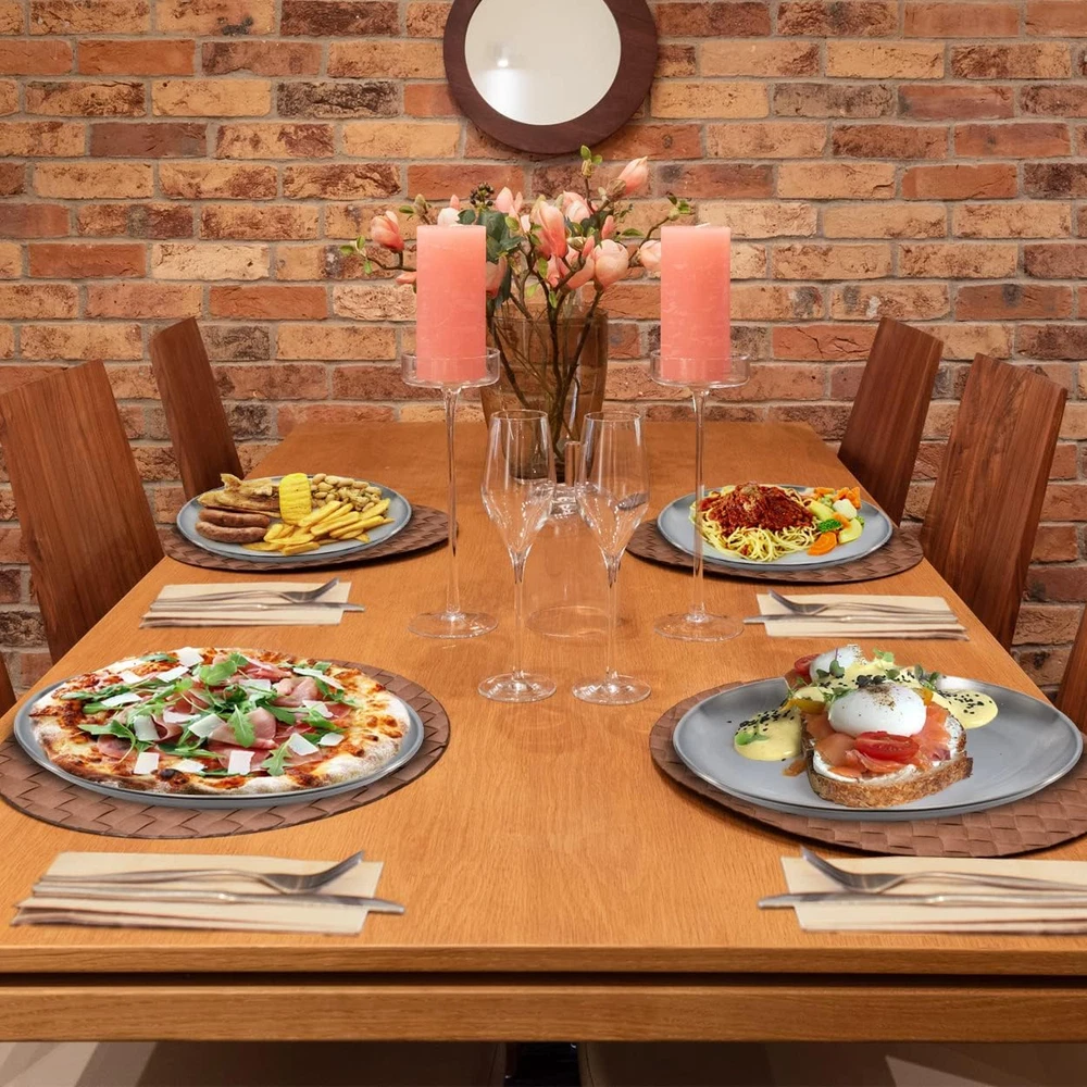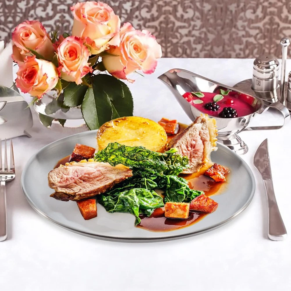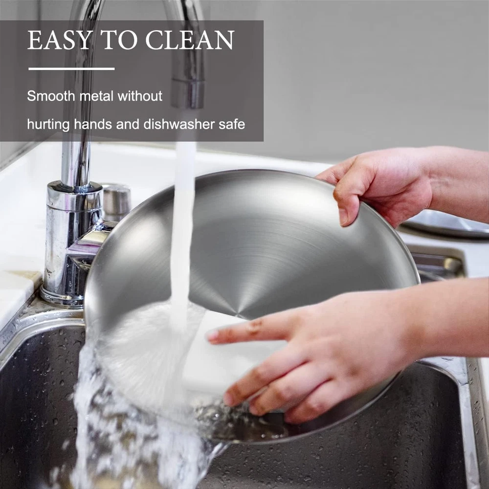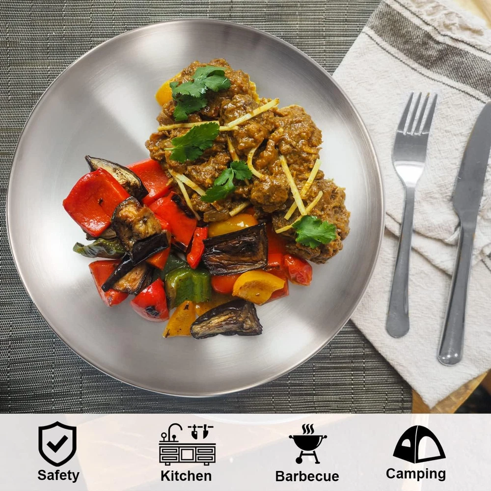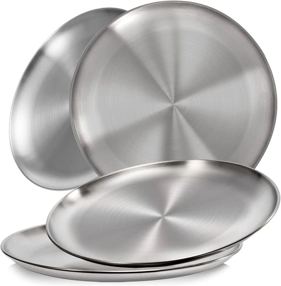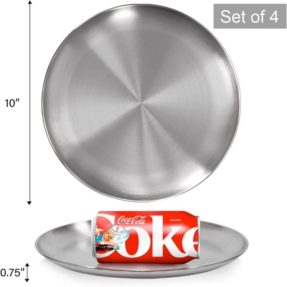 Hygienic and safety: Round dinnerware are made of high-quality 18/8(304) stainless steel, which means BPA-FREE and NO TOXINS, with excellent rust resistance. Perfect size: 10 inches dish sets great for hold dinner or lunch, such as salad, pizza, grilling, steak, BBQ, etc. As well be used as fruit plates and snack dessert plates. Ease clean and reusable: Metal surface is smooth without rough spot easy to clean, dishwasher safe. Stainless steel plates wouldn't bended, be last for a long time. Save kitchen space: It can be easily stacked and stored, space-saving in the kitchen cabinets. Versatile: Great for indoor and outdoor use, dinner, lunch, poolside entertaining or camping dishes, picnics, traveling. Product Description Reusable and friendly The round dinner plates are made of high quality 18/8(304) stainless steel with excellent rust resistance, strong and durable for last years use. Perfect size 10 inches in diameter, set of 4, these lunch plates are lightweight and easy to carry for picnics, camping, outdoor, barbecue, etc, great serve for food, fruit, salad, steak, pasta and so on. Health and safe Sturdy stainless steel is food-grade, curved lip there are no sharp edges, no worry the safety and health of the dinner plate. Stackable It can be easily placed in the cupboards for easy stacking and space-saving, 4 lunch plates taking less than 3" in higher. Easy to clean It can be cleaned simply with soapy water, dishwasher safe. Note: cannot microwave oven.