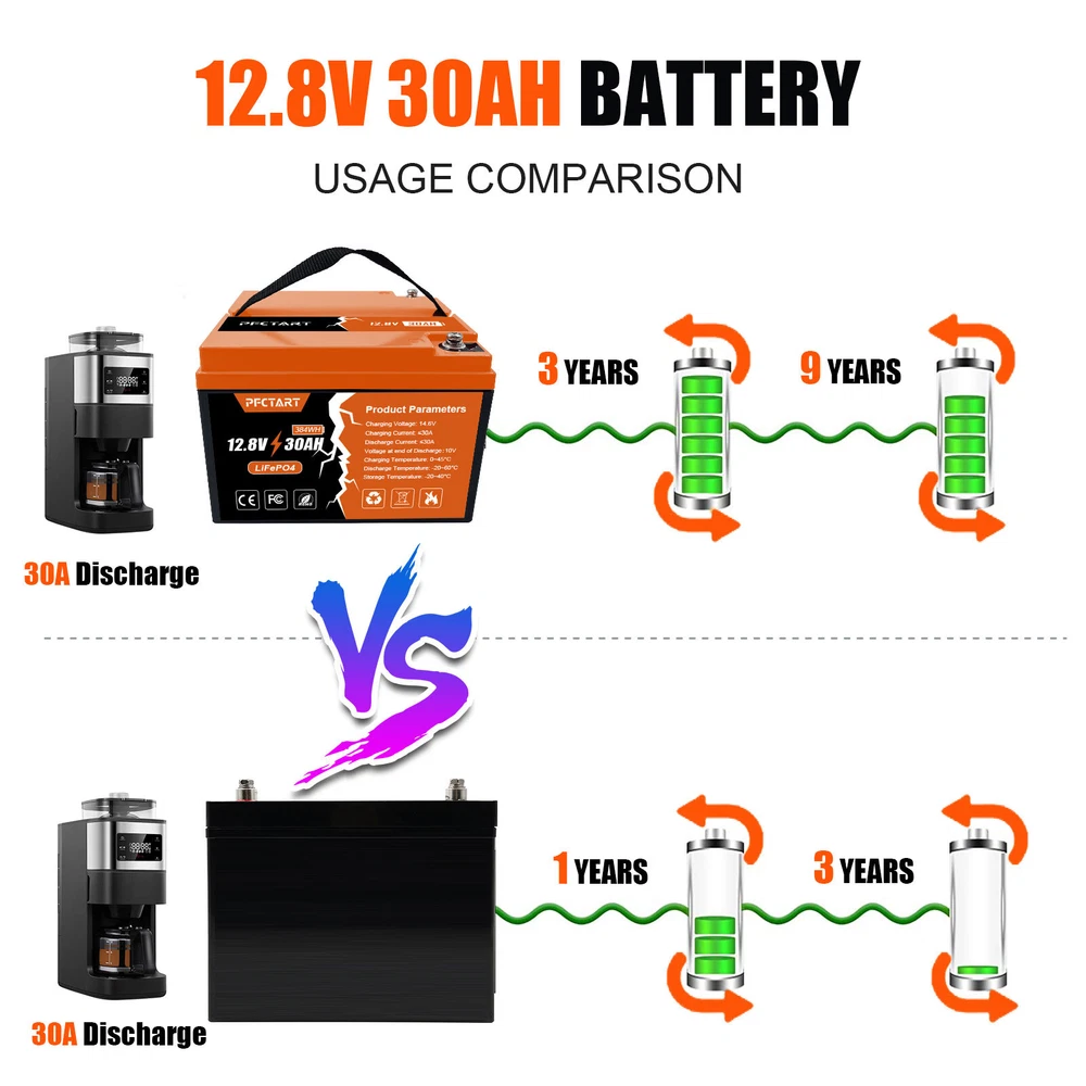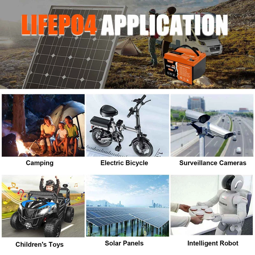 Features 【Automotive Grade Lithium Battery】 PFCTART lithium iron batteries have exceptional quality since they are manufactured by Automotive Grade LiFePO4 Cells with higher energy density, more stable performance & greater power. Highest-level safety based on UL Testing Certificate for the cell inside the battery.This makes li-iron batteries perfect for solar home, RV, campers,motor homes, off-grid applications. 【10 Years lifetime】PFCTART LiFePO4 battery provides 4500+ cycles, which is more than 10 times to Lead Acid with 300~600 cycles. PFCTART LiFePO4 battery has a 10-year service life, three times longer than the Lead Acid’s 3-year lifetime. 【95%* Efficiency】 PFCTART LiFePO4 battery’s flat discharge curve holds above 12.8V for up to 95%,of its capacity usage, providing astronomical boosts in run-time compared to only 50% in Lead Acid. This product is your best choice for outdoor camping power and indoor easy installation. 【1/3* Lightweight】 PFCTART LiFePO4 Battery weighs only 8.81 lbs for one module, only 1/3* the weight of lead acid batteries, which makes it an easy choice for RVs, Marine and Off-Grid Applications when mounting or mobility is in the consideration. 【100% Protection】 PFCTART LiFePO4 battery has built-in BMS (Battery Management System) to protect it from overcharge, over-discharge, over-current, and short circuit with excellent self-discharge rate. Built-in high-temp cut off prevents charging over 167 °F (75 °C). Without memory effect, no matter what state the battery is, it can be used as soon as it is charged. PFCTART LiFePO4 battery is IP65 level waterproof, which set you free from worrying to install indoors or outdoors. Specifications Battery type: LIFEPO4 MODEL: 30Ah 12.8V(4S5P) Rated capacity: 30Ah(384WH) Normal voltage: 12.8V Discharge termination voltage: 10.0V Charging voltage: 14.6V Internal resistance: ≤180mΩ Single cell: IFR 32700 3.2V 6000mAh Standard charging. Continuous current: 0.2C5A Continuous voltage: 14.6V Cut-off current: 0.01 C Standard discharge: Constant current 0.2C5A end voltage 10.0V Max. charging continuous current: 30A Maximum discharge continuous current: 30A Operating temperature range. Charge: 0~45℃ Discharge: -20~60℃ Product size: 177*167*125mm Weight : 4kg BMS Protection Cell overcharge detection voltage:3.90V±50mV Cell overcharge recovery voltage:3.80V±100mV Cell over-discharge detection voltage:2.00V±100mV Cell over-discharge recovery voltage:2.50V±100mV Rated operational charge current:30A Over current detection:60±5A PCM impedance:≤50mΩ Note It does not have series/parallel protocol, please do not use it for multiple series or parallel installations.