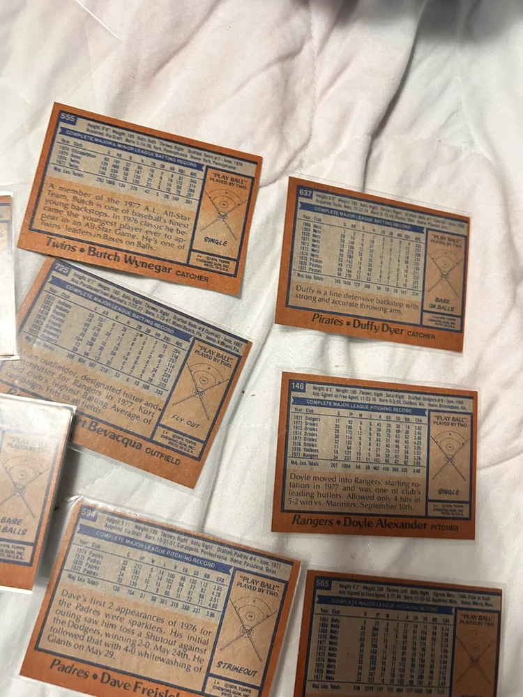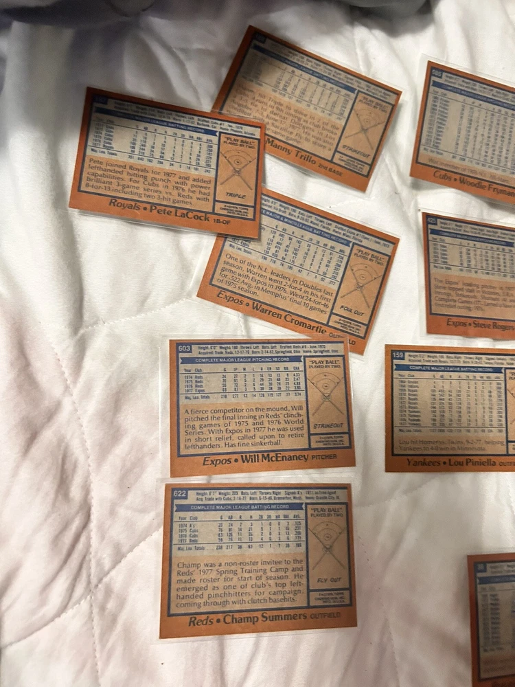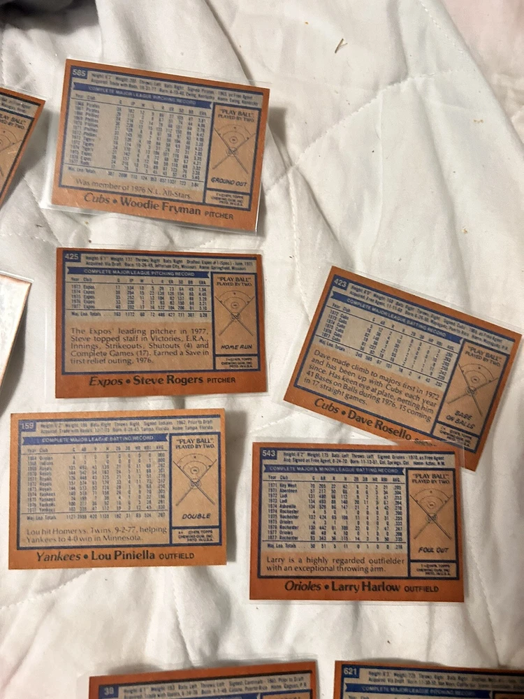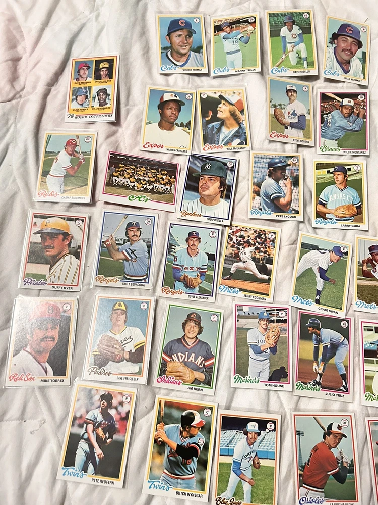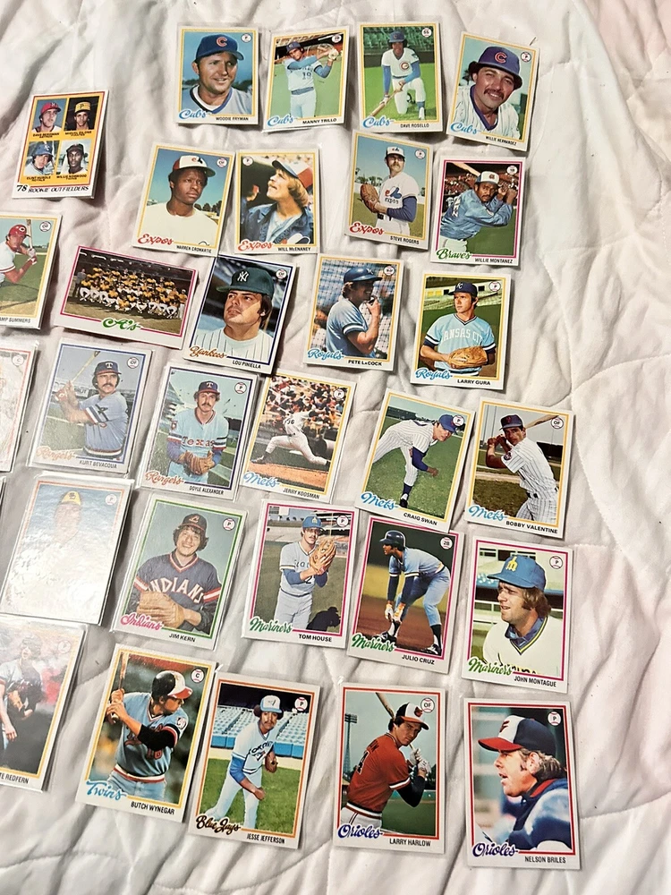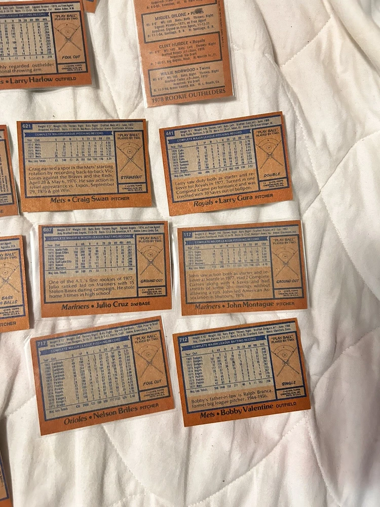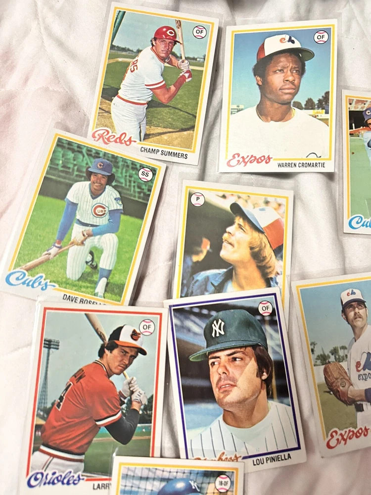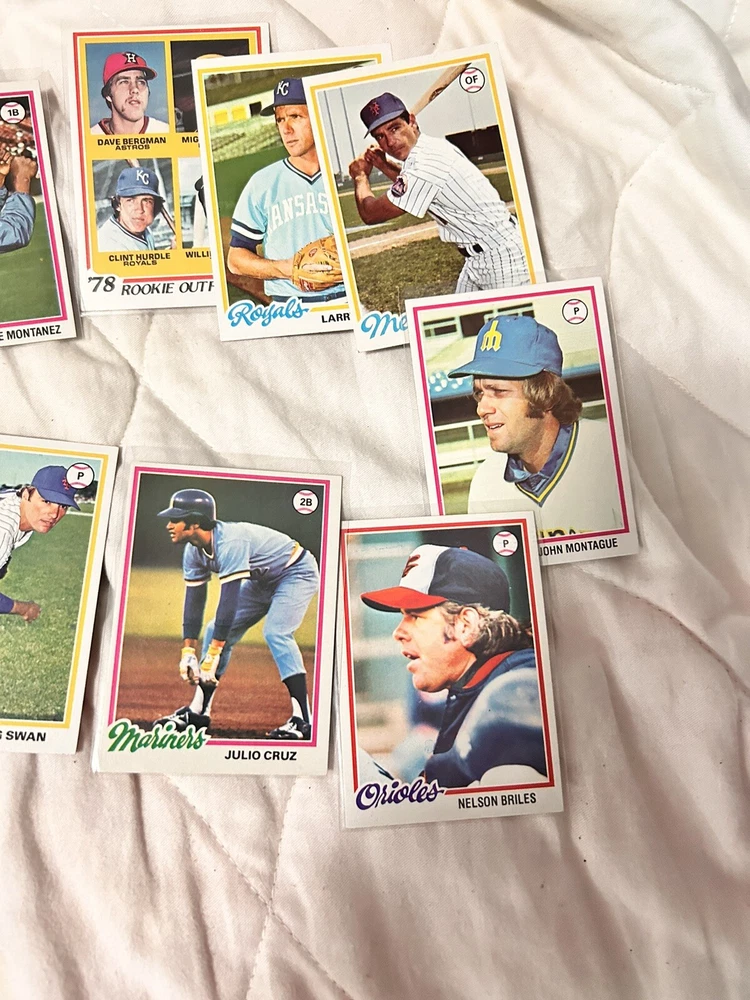Country/Region of Manufacture:United StatesCard Size:StandardVintage:YesPlayer/Athlete:Lou Piniella, Clint Hurdle, Bobby Valentine, Nelson BrilesManufacturer:ToppsTeam:New York Yankees, New York Mets, Cincinnati Reds, Chicago Cubs, Baltimore Orioles, Montreal Expos, Seattle MarinersType:Sports Trading CardSport:BaseballCard Name:1978 Topps BaseballFeatures:Base Set, Rookie, ChecklistNumber of Cards:31Year Manufactured:1978Language:EnglishLeague:Major League (MLB)Season:1978Original/Licensed Reprint:OriginalSet:1978 ToppsMaterial:Card Stock