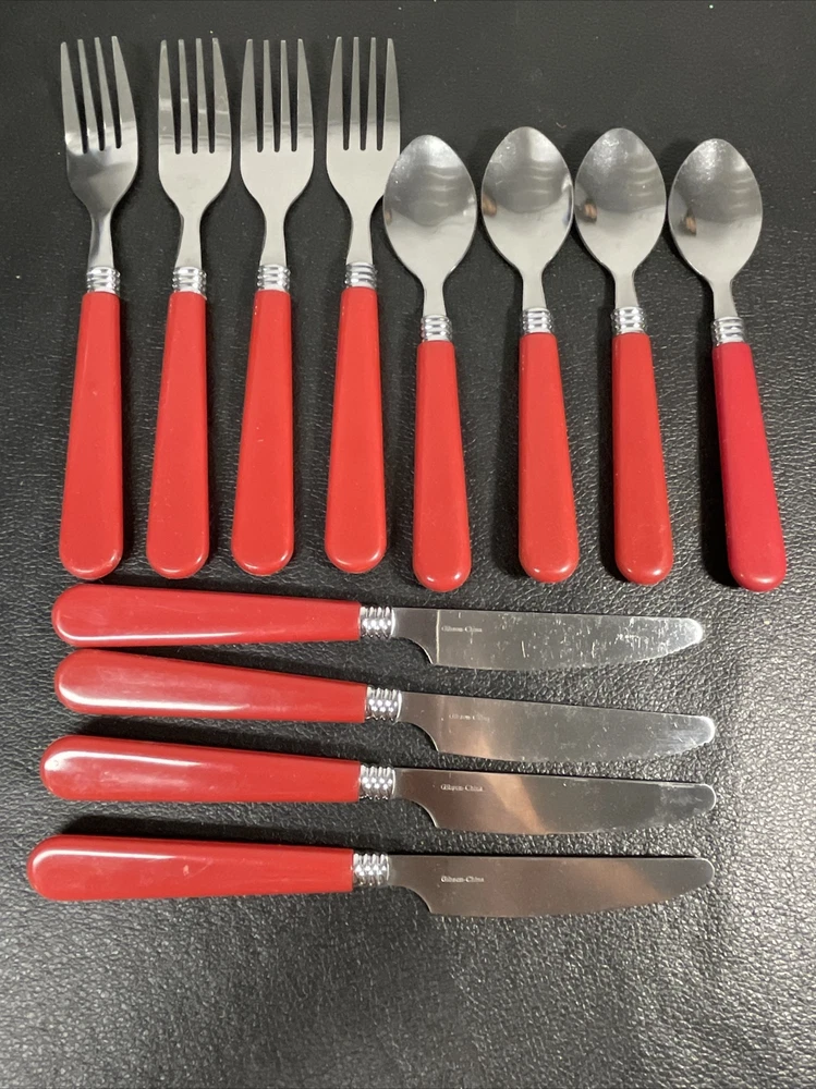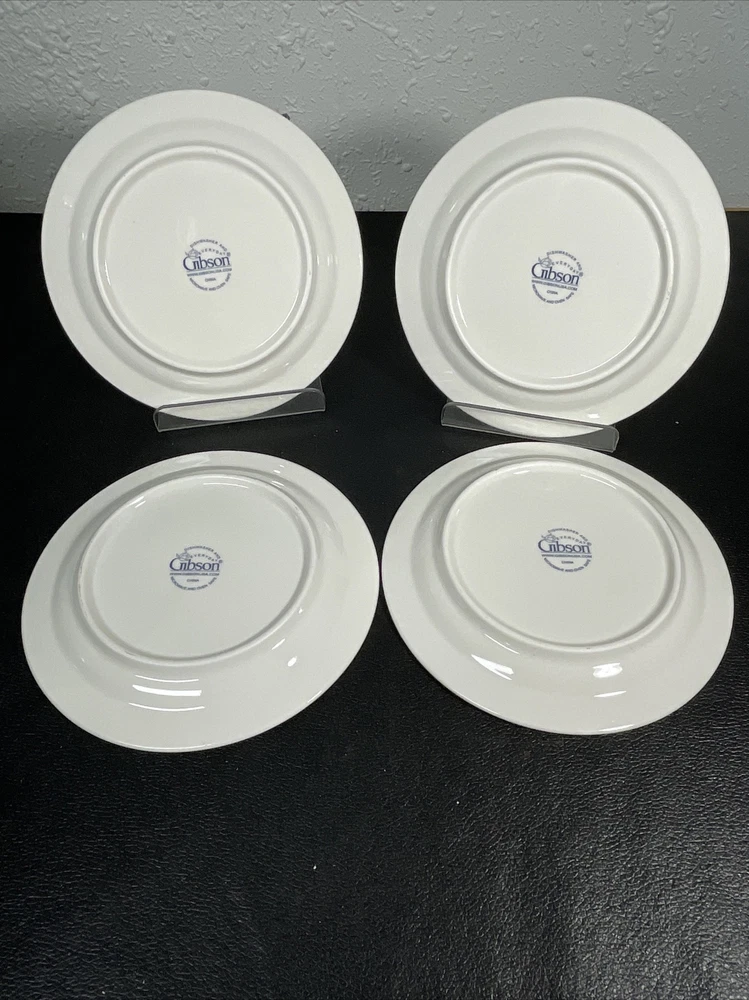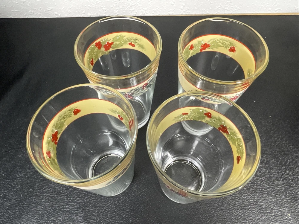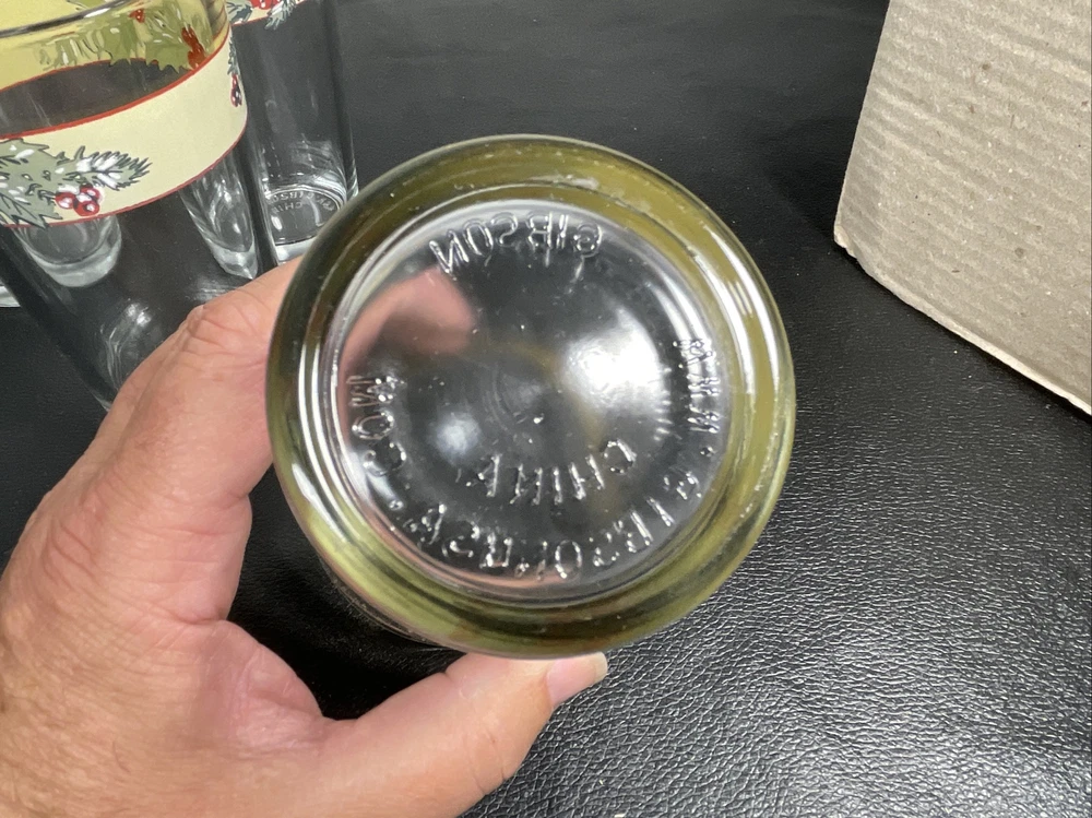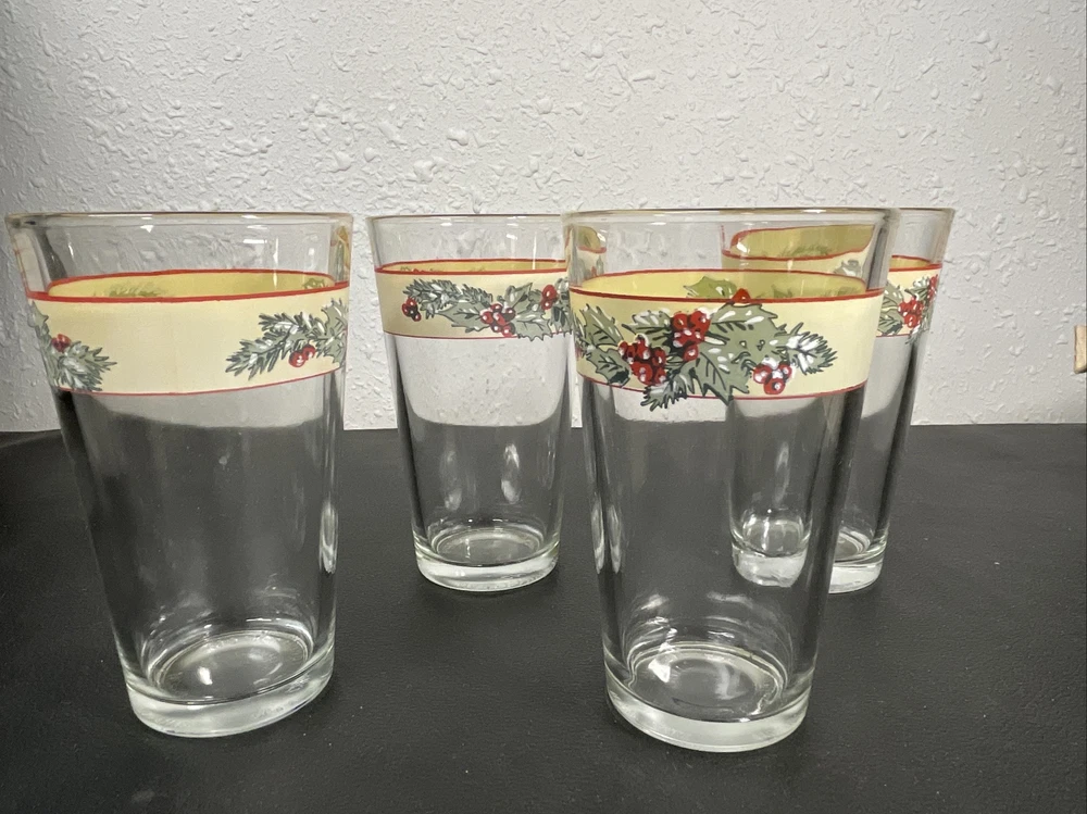 This is a 32-piece dinnerware set from Gibson, perfect for Christmas occasions. The set includes dinner plates, dessert plates, bowls, cups, knives, forks, and spoons, all featuring a Christmas mistletoe pattern with holly berries. The set is made of stoneware and comes with 16oz tumblers. It is designed for four place settings and is manufactured in China. We have 3 sets and of the piece that we have looked at show very little wear, utensil marks.