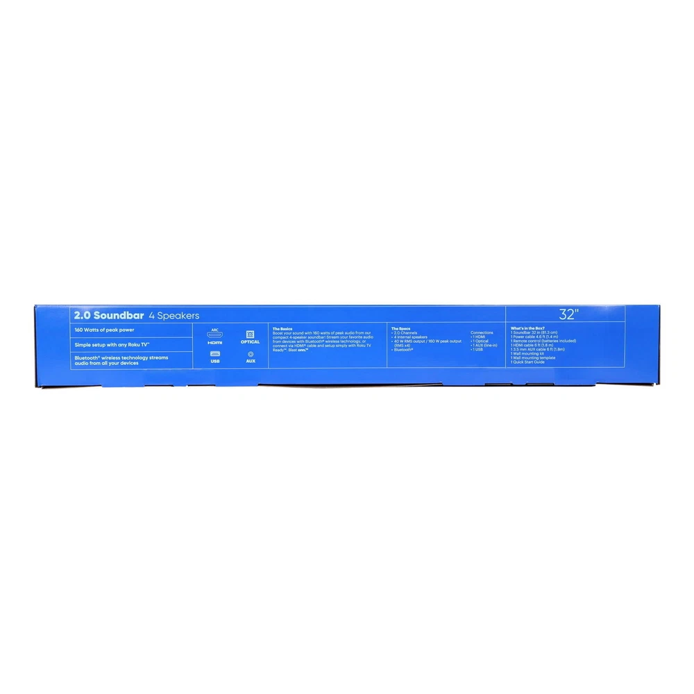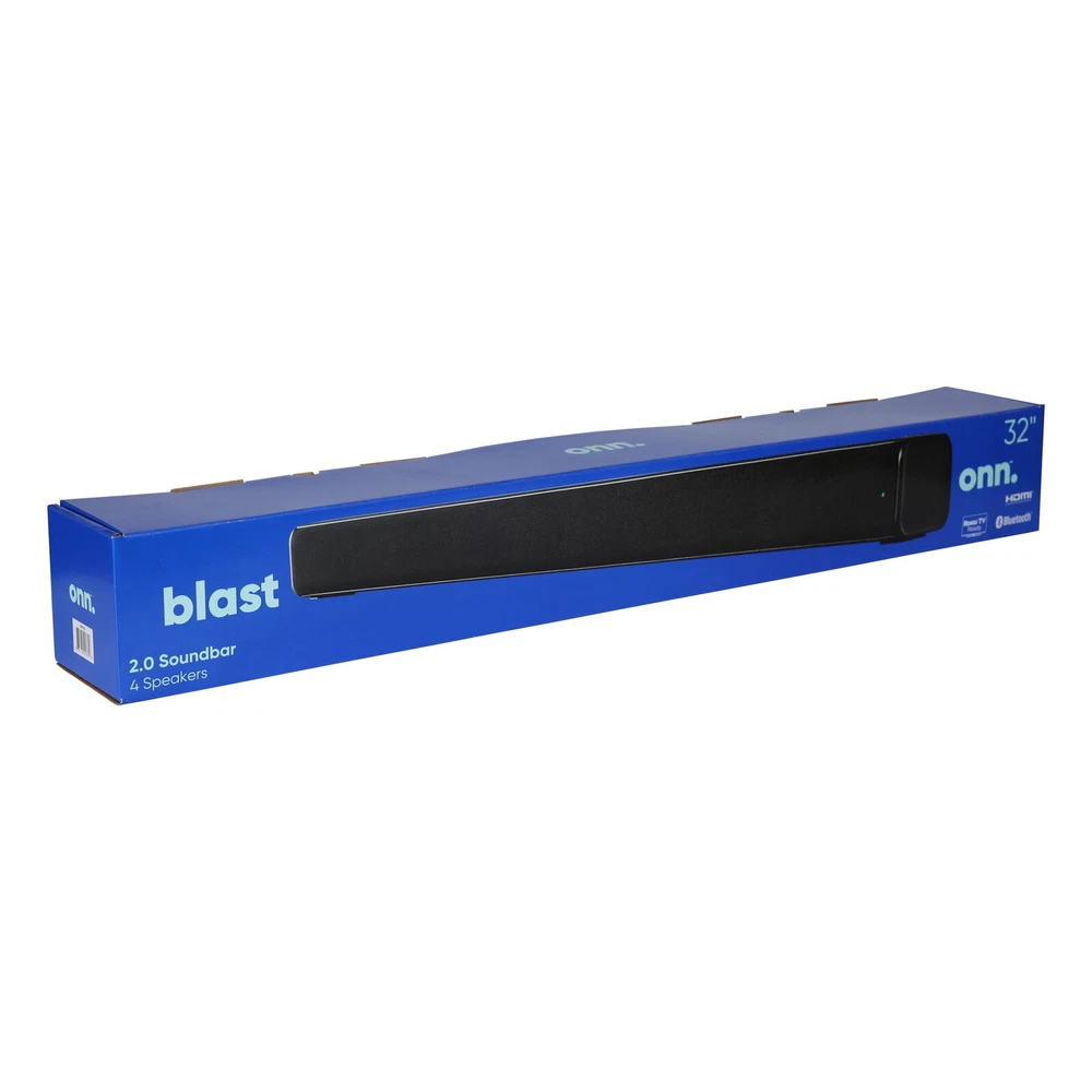 Product details Boost your sound with 160 watts of peak audio from our compact 4-speaker soundbar, the onn. 2.0 Soundbar! Stream your favorite audio from devices with Bluetooth wireless technology, or connect via HDMI cable and setup simply with Roku TV Ready. Blast onn. with our onn. 2.0 Soundbar. We're onn. to something here. We took the hassle out of buying electronics and built a brand that's fresh and simple. With delightful pops of color, finding the right product has never been easier. Say goodbye to stressful decision-making and fear of the electronics aisle. Our mission is simple... to deliver great products and make it easy. Choose onn. and get back to using your brainpower for the important things in life.. like pondering the question, "What should I binge watch this weekend?" 2.0 Soundbar, 32" 4 internal speakers 40 W RMS output / 160 W peak output (RMS x 4) Bluetooth wireless technology streams audio from all your devices Roku TV Ready Connections: 1 HDMI, 1 Optical, 1 AUX (line-in), and 1 USB What’s in the box? 1 Soundbar 32 in (81.3 cm), 1 Power cable 4.6 ft (1.4 m), 1 Remote control (batteries included), 1 HDMI cable 6 ft (1.8 m), 1 3.5 mm AUX cable 6 ft (1.8m), 1 Wall mounting kit, 1 Wall mounting template, and 1 Quick Start Guide On Jan 9, 2025 at 19:22:05 PST, seller added the following information: