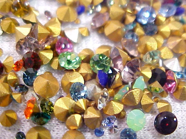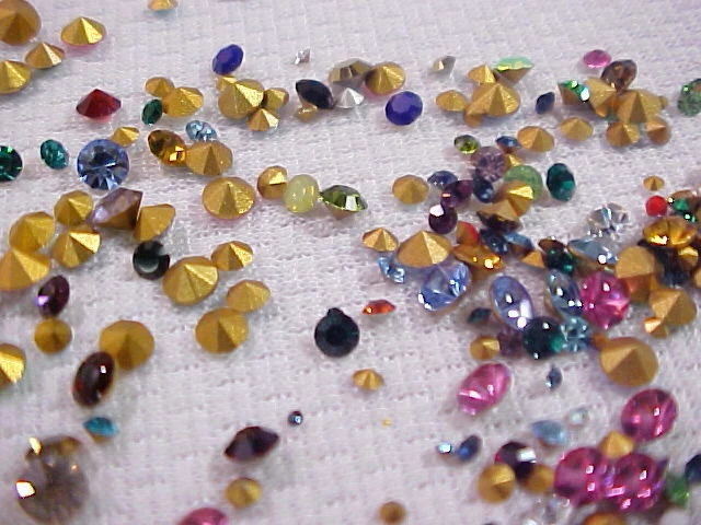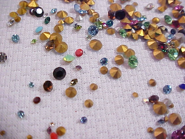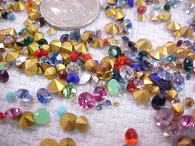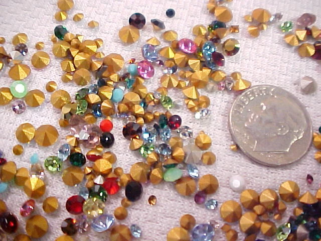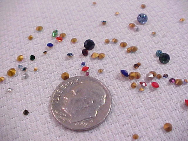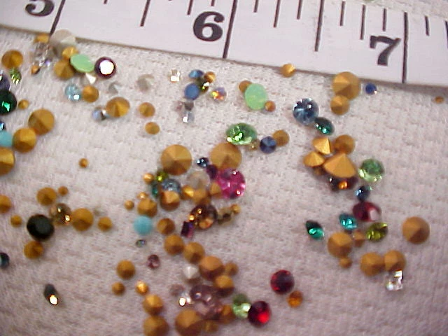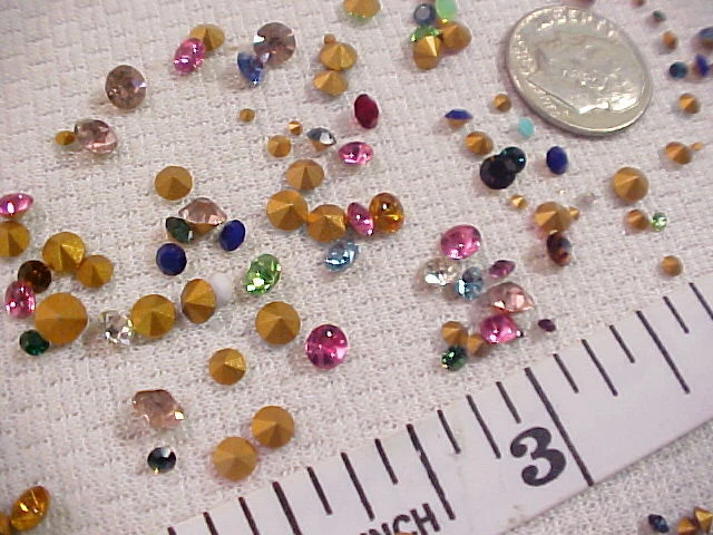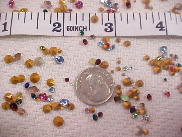Please put ALL of your items in the same STORE SHOPPING CART and pay in 1 SINGLE payment for everything. This is a large lot of approximately 325 unused Old Stock Vintage Swarovski-Austria Crystal Rhinestones. These are Small down to Tiny sized stones. I believe some of them are as small as you can find, and they range up in size from 1 PP (0.8 mm) up to about 30 PP (3.7 to 3.8 mm) . They have faceted backs (pointed) and about 98% of them are rounds. I say that only because I saw a few tiny baguettes and squares when I made up the lots so there may or may not be a few of them in the lot. Almost all of these are foil backed. I saw a few that were un-foiled but not very many. I think the lot has a great assortment. Most of them are regular, shiny sparkling rhinestones and there are some solids or opaque stones in the lot too. ALL of them are Swarovski Austria Crystal rhinestones in a rainbow of colors with crystal clear rhinestones as well. These are old. Some of the packages were stamp dated 1951 and the newest ones I saw were 1964.