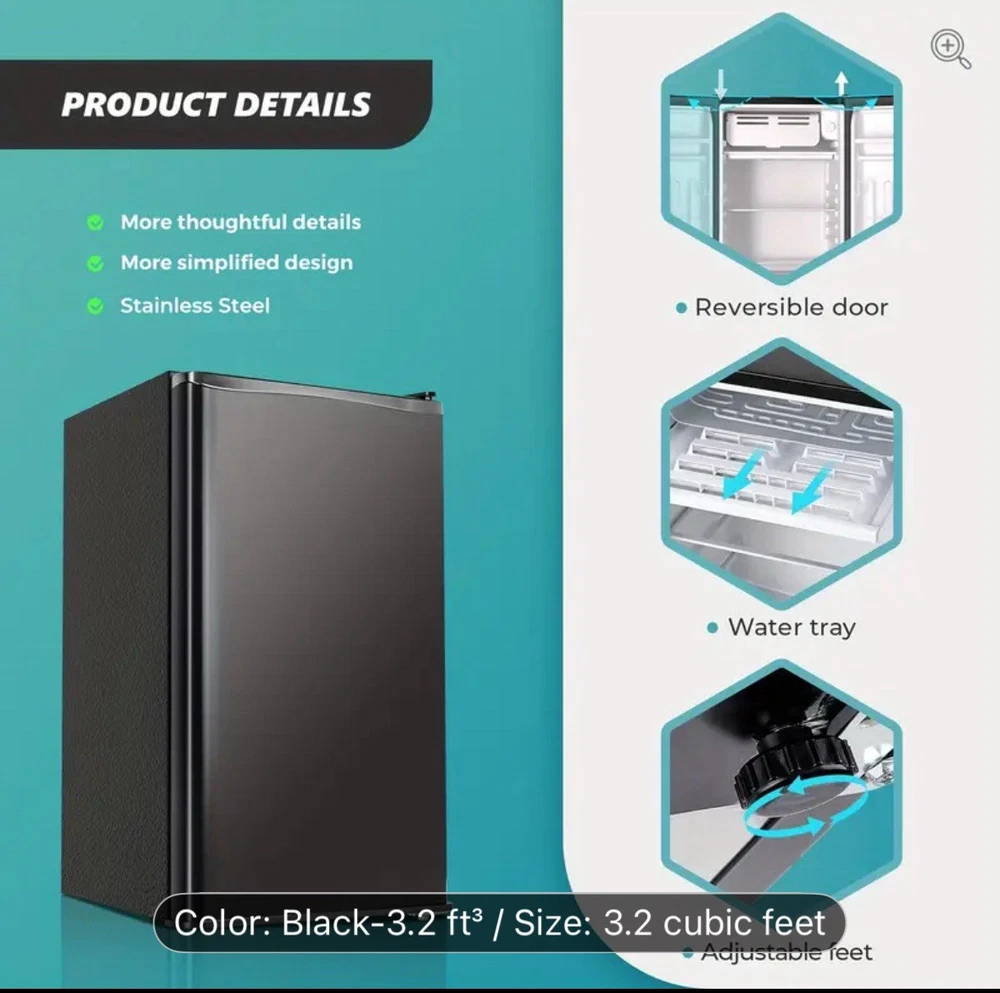 The product is a compact 3.2 cubic foot single door mini fridge with a freezer, ideal for home storage. It features three shelves, a less than 20 inch wide opening, and a capacity of 1-5 cubic feet. This freestanding refrigerator has a sleek black design, measuring 32.4 inches in height and 18.5 inches in width. Its compact size makes it a practical choice for small spaces or as a supplemental refrigerator for additional storage needs.