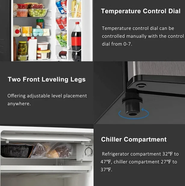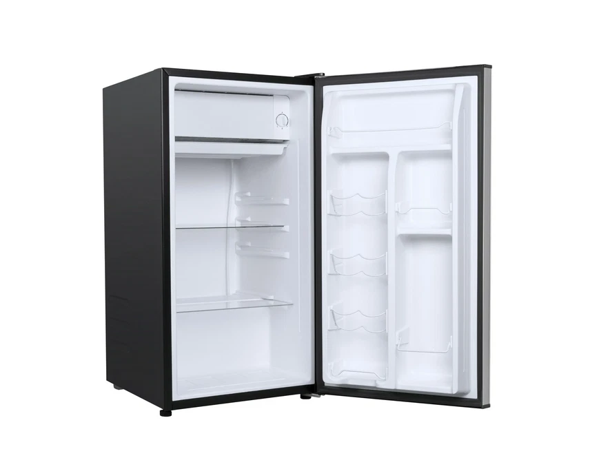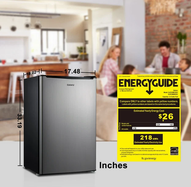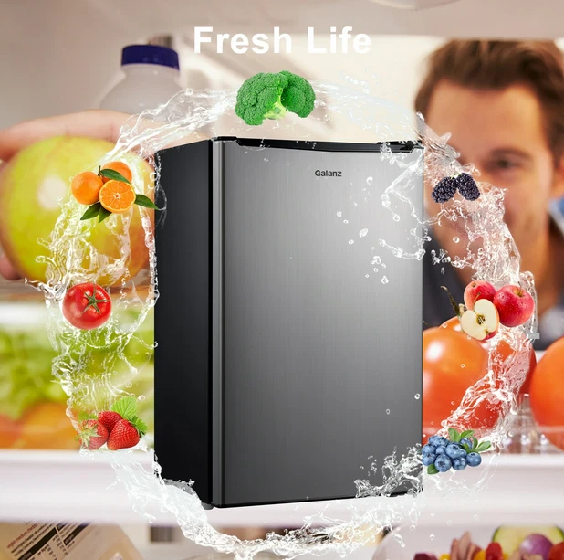 About this item Product details Enjoy the convenience of having your favorite chilled food, drinks, or snacks whenever you want with the Galanz 3.3 Cu ft One Door Mini Fridge in stainless steel look. The Galanz 3.3 cu ft One Door Mini Fridge is an ideal size for the dorm room, game room, exercise room, office, garage, bedroom, or any other living space. The Galanz 3.3 Cu ft One Door Mini Fridge features a full-width freezer compartment . The convenient reversible door allows you to choose to open from the left or right side making the Galanz 3.3 Cu ft One Door Mini Fridge suitable for any layout. Condition: New, Stock Number: GLR33MS1E02 3.3 Cu ft Capacity Stainless Steel Look Estar Certified Low Energy Consumption Reversible Door 2 Adjustable Leveling Legs Temperature Control Dial Adjustable Mechanical Thermostat Control 2 Liter Bottle Door Storage 7 Can dispenser 1 Full Slide Out Glass Shelf Reversible Door Condition: New Stock Number: GLR33MS1E02 Specifications Power Type Electric Volts 120 V Brand Galanz Model VIPRB-GLR33MS1E02