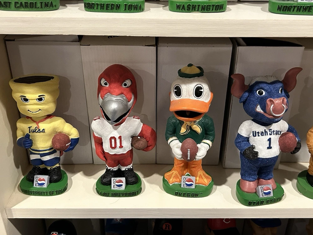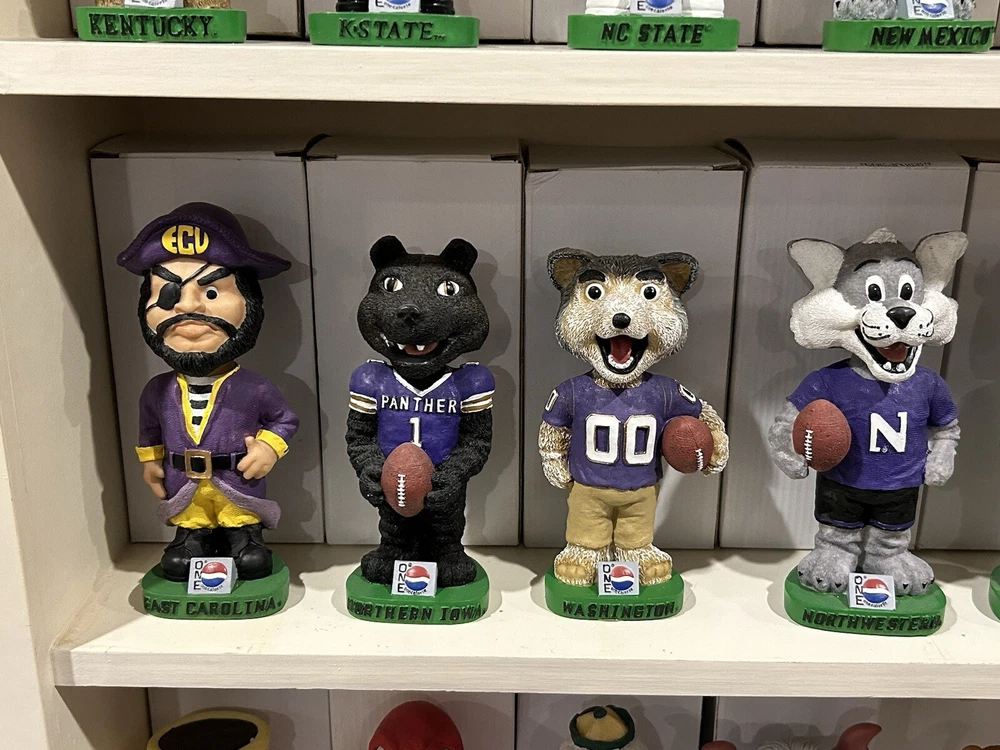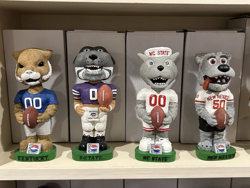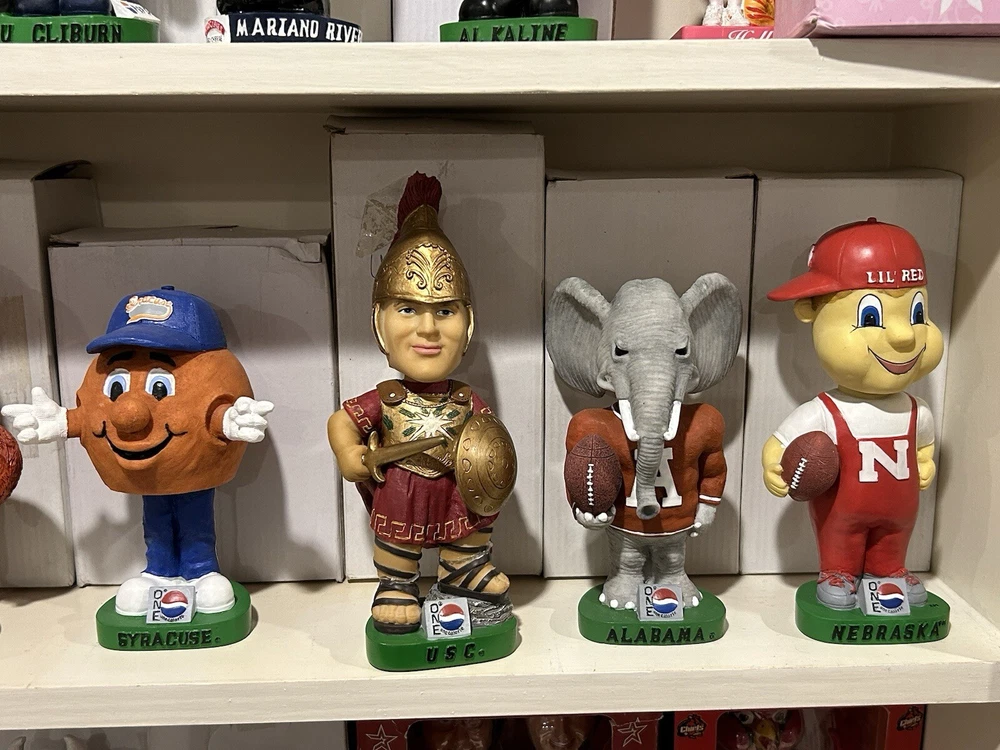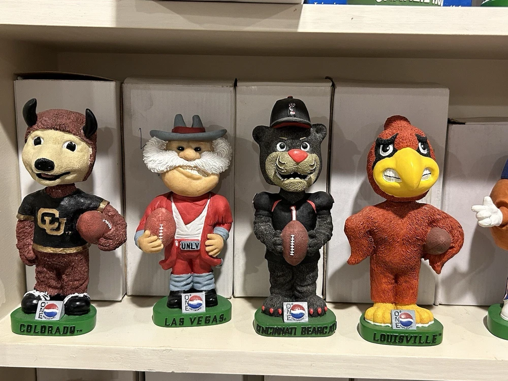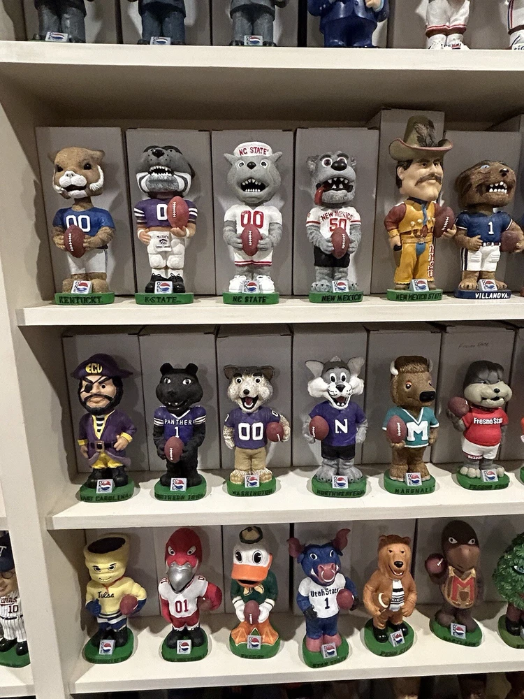 (33) PEPSI ONE NCAA College Mascot Complete Bobblehead Set with Boxes Please view images these are all in Near Mint Mint condition with the boxes. This collection took me 3 years to complete and is very hard to replicate. Any questions please message me. Professionally packaged WITH CARE for shipment PLEASE VIEW ALL MY BOBBLEHEADS ITS TIME TO SELL. I WILL BE LISTING OVER 800 FROM 2000-2003 ERA PLEASE VIEW DETAILED PICTURES THIS IS THE EXACT BOBBLEHEAD AND ORIGINAL BOX YOU WILL RECEIVE. SELLING AS IS NO RETURNS I have had this since it was released stored in my Bobblehead cabinet in beautiful condition. It hasn't been touched in over 20+ years until I took the pictures to list it. ANY QUESTIONS PLEASE MESSAGE ME