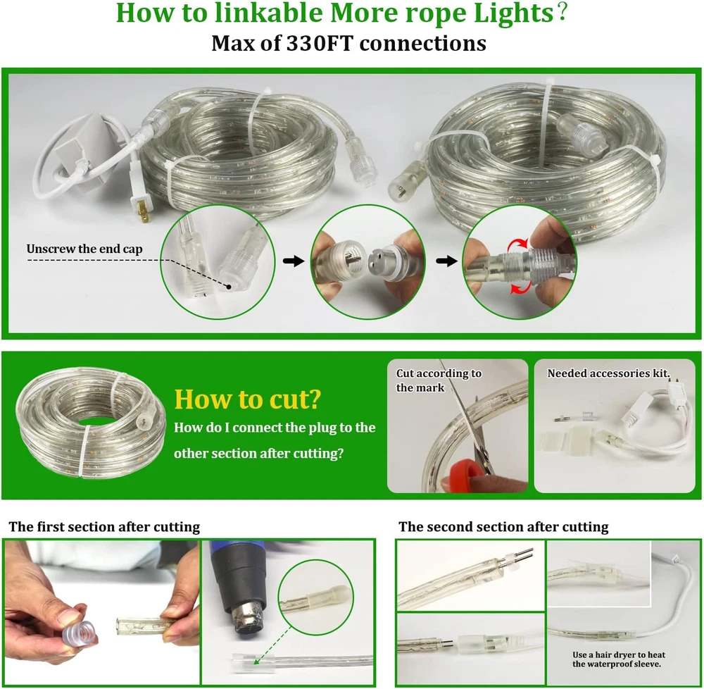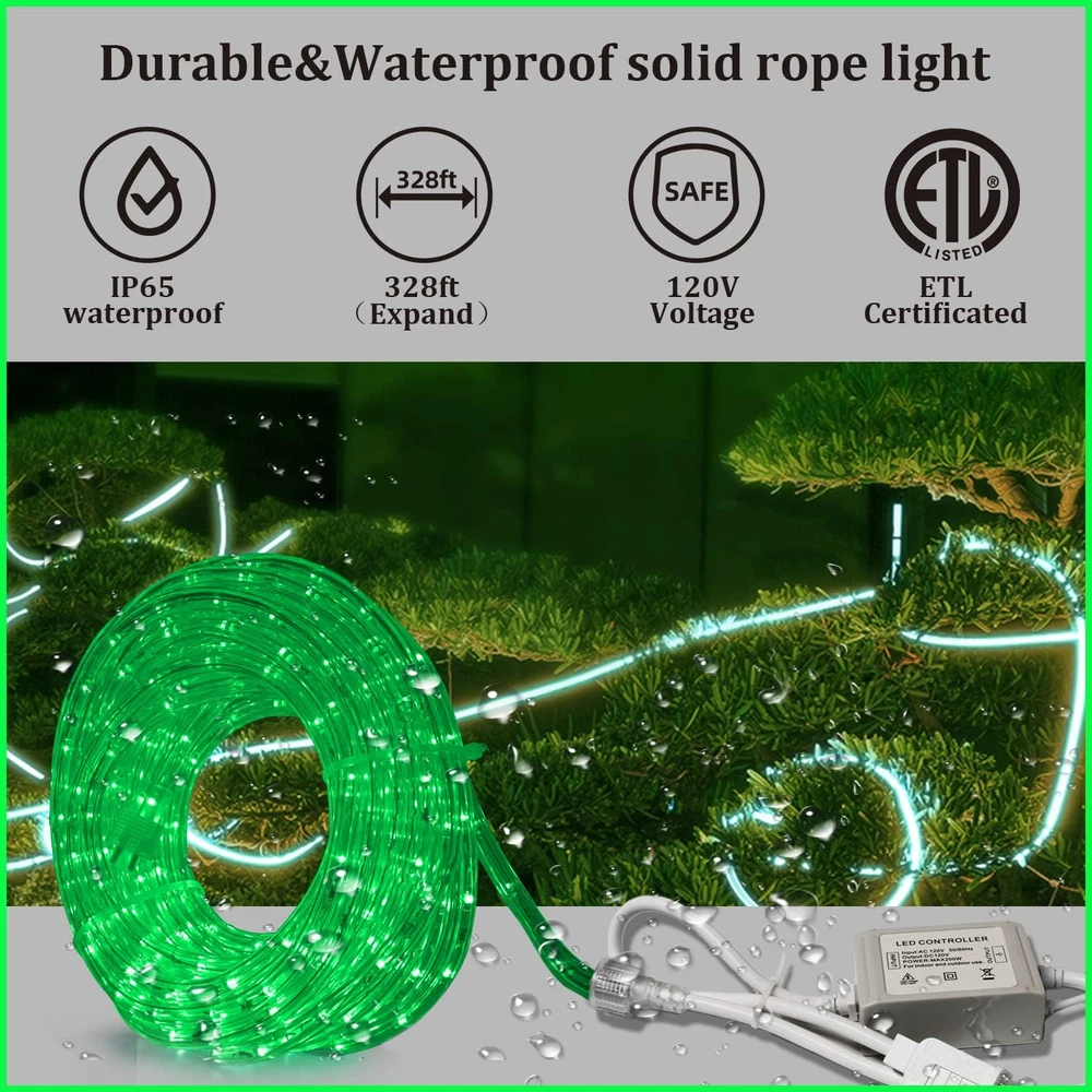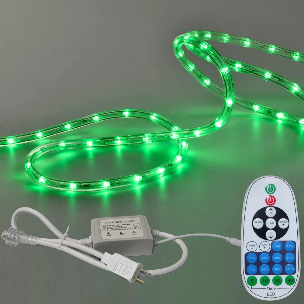 Store New Arrivals Add to Favorite View Feedback Contact Fast deliveries to the customer's home Quality customer service John Make the customers happy! 33FT Rope Lights Outdoor with Remote,Cuttable Connectable, 300Leds Strip Lights with Adjustable Brightness Waterproof with Plug for Patio,Christmas Decoration. (Green) Description 🌟Flexible and Connectable Design: Our LED rope lights are crafted with a high-quality clean tube that ensures the safety of the fairy lights and allows effortless bending into various shapes, enabling easy recycling for future use. The end-to-end connectable feature enables you to connect up to 3 sets, resulting in an impressive total length of 300ft. With this extensive coverage, you have the freedom to fulfill all your creative lighting decor needs. 🌟8 Modes & Safe Operation: Experience a diverse range of lighting options with 8 different modes, including Combination, In waves, Sequential, Slo-glo, Chasing Flash, Slow fade, Twinkle Flash, and Steady on. Conveniently switch between modes using the plug's button to create the perfect ambiance for any occasion. Safety is our priority, as evidenced by the two built-in fuses in the power plug, providing short circuit protection, making these lights highly reliable and reassuring. 🌟Auto Timer & Memory Function: Embrace energy efficiency and convenience with the rope lights timer function. Set them to stay on for 5 - 60 minutes and automatically turns off, saving energy and your time. 🌟Durable and Waterproof Construction: Designed for outdoor use, our LED rope lights are encased in a transparent and thick round PVC tube, ensuring 360 full illuminating and strong resistance to heat. This durable construction allows the lights to withstand various weather conditions with ease. With an IP65 waterproof rating, they are suitable for both indoor and outdoor decorations. 🌟Versatile Usage: Our LED rope lights are not only perfect for enhancing Christmas decorations, party decor, and weddings but also ideal for daily and holiday use. Illuminate cabinets, bedrooms, ceilings, walls, and utilize them as captivating background lighting. Create a delightful holiday atmosphere in your daily life by wrapping them along the pool deck, awning, or any desired location. Product Description This 33FT Remote control Led Rope Lights comes from BEATINEON company in Ca,US.tube is made of clear PVC,Internal all copper wire.Rope lights have a diameter of 2/5in and 9 LEDs/Foot.Total 300Leds.360degrees of light,with infrared remote control,from 5-60 minutes timer on/off function.It can be connected,cuttable,IP65 waterproof.ETL certification,safety and Lifespan more than 50,000H. is ideal for Xmas,Easter,Halloween,Independence day,parties,pool,weddings,outdoor events etc. This led string lights comes with an infrared remote control for ease of use. Pointing to the controller within 16.5FT range, you can easily control the on/off of your Tube Lights. quick setting to 10%-100% deck lights brightness. Set the light off time from 5-60 minutes. There are 8 modes to change the rhythm of the rope lights.These settings will be remembered by the chip when the lights are turned off. No need to repeat the settings, smart, convenient. This rope light can be cut. 3.3FT has a cut mark. Please note. Under 66FT the tube light is not supplied Free accessories for use after cutting.We supply the applicable accessories for sale, please purchase them yourself. (ASIN:B0BN7PT34Z) With remote control/Timing Off this led string lights comes with an infrared remote control for ease of use. Pointing to the controller within 16.5FT range, you can easily control the on/off of your Tube Lights. quick setting to 10%-100% deck lights brightness. Set the light off time from 5-60 minutes. There are 8 modes to change the rhythm of the rope lights.These settings will be remembered by the chip when the lights are turned off. No need to repeat the settings, smart, convenient. waterproof/energy efficient This patio lights outdoor waterproof and very energy efficient, have a diameter of 2/5in and 9 LEDs/Foot.Total 300Leds.with only 0.55 watts per foot, The whole lights is only 17 watts.but the light is very brighting.suitable for many occasions.Rope lights can be used as a decorative atmosphere for Christmas, parties, weddings. Also perfect for daily use. illuminate your anywhere you want to decorate. cuttable/linkable more This outdoor led rope lights it Can be cuttable.3.3FT/each with cuttable markings.If you purchase more led rope lights, you can easily link them together. Up to 330FT can be linked. Note: Free Accessories for cutting and then linking are not provided below 66FT.You need to purchase the attachment for cutting the connection by yourself. if you cut multiple times, you need to buy More additional accessories (ASIN:B0BN7PT34Z) Very Bright but energy efficient The whole lights is only 17 watts This outdoor patio lights Very bright, with only 0.55 watts/foot, 9 LEDs/Foot.Total 300Leds. Want to change the brightness of the light at certain times? Yes. Our light strings ensure that they can provide sufficient brightness. We also consider that some customers need to use a lower brightness at some times.Buy our string lights. There is no need to spend extra money buying a dimmer. Our dimming function is included as standard.And we supply dimming from 10% to 100%. Package included: 1×33ft Rope Lights with plug and Remote control(Batteries not included). 20PCS*fixing clips. 40×M2.5*10 Screws. 20×Plastic Ties. Accessories for cutting are not included, please purchase your own (ASIN:B0BN7PT34Z). Suitable for multiple space, indoor or outdoor Waterproof, anti-glare clear tube light. Whether in the yard, pool, outdoor party, wrapped around the stairs or placed above the ceiling in the kitchen, living room.It will all help to Creating a positive atmosphere Beatineon is a brand of luxurious lighting products, wedding decoration, and home decoration lighting in Cali