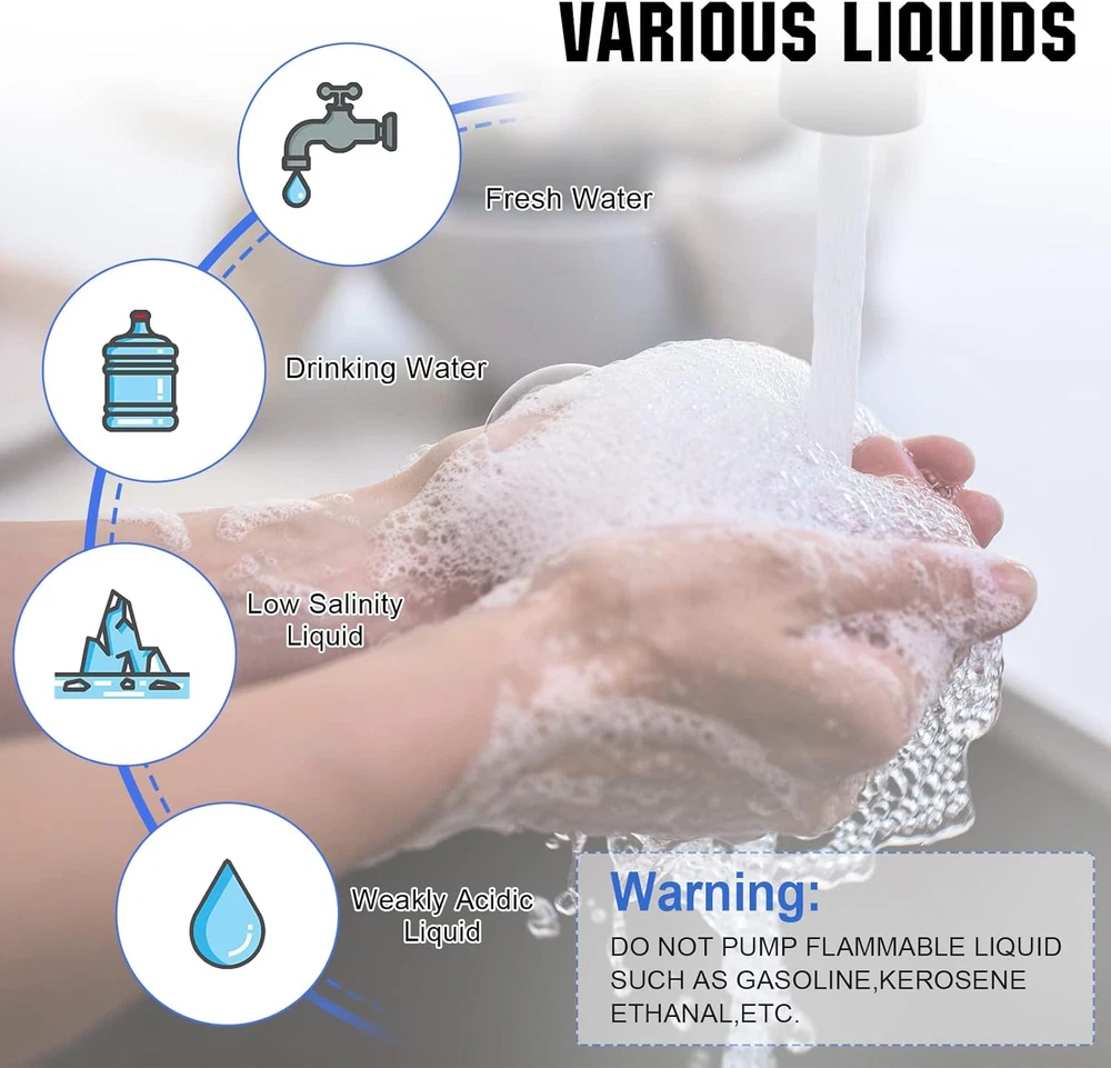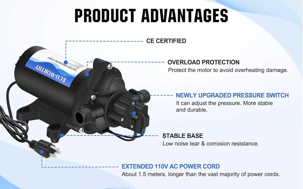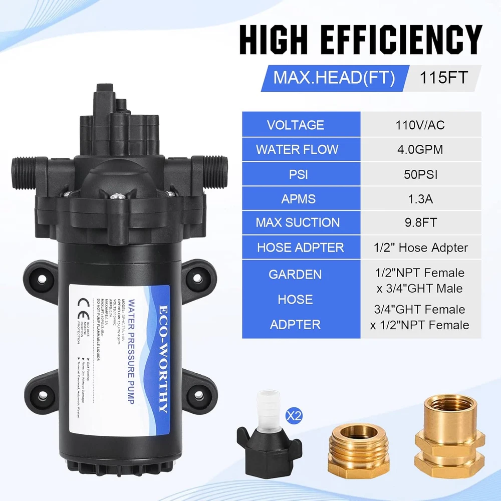 Diaphragm Pump: 110V AC water diaphragm pump provides 4.0GPM flow capacity. Turns on and off using water pressure at 50PSI, 1.3 Max amps. AC power supply, no need to carry marine battery with you Smart Pressure Switch: Turns on and off on demand. It’s quiet, shuts itself off when the faucets are closed and runs when the faucets are opened. It also can adjust according to your needs, adjustable pressure range is 45-70PSI Reliable Performance: Self-Priming up to 9.8 vertical feet, lift up to 148 feet. Thermal overload protection is built into the water pump to make it safe to use. When the temperature is above 70℃/ 158℉, it will automatically disconnect the circuit to protect the motor Multipurpose: The nemesis of low water pressure. Support continuous operation for more than 1 hour. The water transfer pump is suitable for many fields, like RV, Marine, Boat, Irrigation, Sprinkler, Faucet and so on Your First Choice: We always pay attention to customer shopping experience. If you have any questions during use, please feel free to contact with us at the first time. We will always be here Product Description ECO-WORTHY 110V Water Diaphragm Pump This 3 chamber water pump measures 5.12" high by 5.31" wide by 9.45" long. The valves are corrosion-resistant and the pump runs very quietly, keeping your neighbors happy. The on demand water pump are suited for beverage and water applications such as city water pressure boost, portable cart water delivery, batch and transfer of product. Making it a clear cost to performance leader. Features: 4.0 gallons-per-minute(GPM) with 9.8-foot lift. 110V AC. It can connect directly to any standard US outlet making installation easy and simple. 50PSI. Automatic shut off pressure switch. Runs dry without damage. Automatic Pressure Switch Automatic Pressure Switch: On demand, automatic start when water is used, and automatic stop when water is turned off. Bring convenience to your life and work. Adjust Pressure Switch Factory default setting 50PSI. Step 1: Find the screw hole in the center of the switch. Step 2: Turning clockwise is to increase the pressure, and vice versa is to decrease the pressure. Strainer Strainer should be attached to the inlet side. Easy to clean and assemble. Tip: please combine seal tape with our Strainer & Adapter to better prevent leaks on pipes and plumbing.