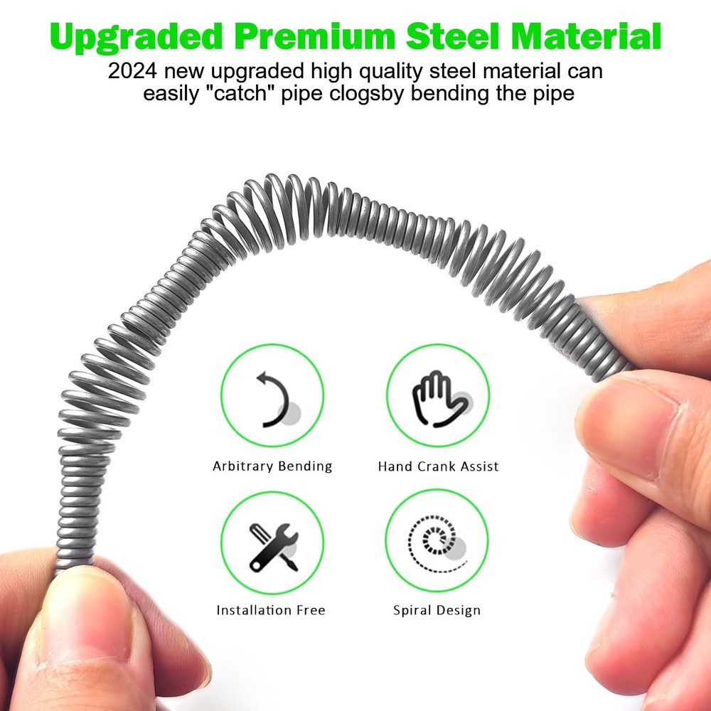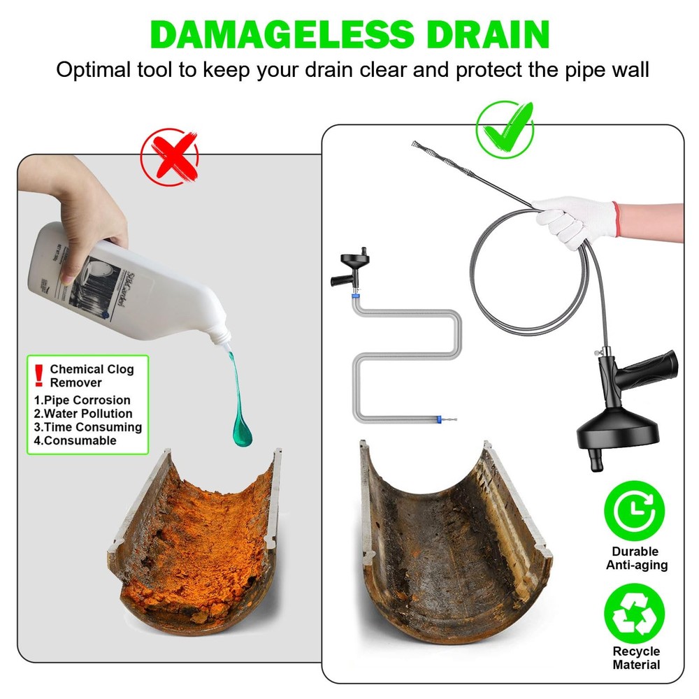 [33 Ft of Flexible Steel Wire Easier to Reach Difficult Clogs]: This professional plumbing snake drains auger comes with 33 ft of heavy-duty spring steel cable that goes beyond traps to remove most household clogs. Best highly effective power drum auger for unclogging drains and keeping your drains flowing smoothly. [Easy Operation and Detailed Operating Instructions]: The drain snake has an ergonomic pistol grip that simplifies use and makes for more comfortable handling. The flexible spring can be bent more than 90 degrees without breaking or kinking, which enable you to reach the sink clogs efficiently. Besides, if you don’t know how to use it, the detailed operating instruction will teach you how easy to do. [Professional and Multiple Use to Clear Most of Clogs]: You can flexibly adjust different lengths to adapt to various depths of drain pipes by whirling the screw switch and pulling the springs back and forth. Hence, the plumbing snake drain can be widely used in kitchen sinks, bathtubs, bathroom drains, sewers, and floor drains to solve most of the household clog problem. It is recommended not to use it in the toilet. [33 Ft of Flexible Steel Wire Easier to Reach Difficult Clogs]: This professional plumbing snake drains auger comes with 33 ft of heavy-duty spring steel cable that goes beyond traps to remove most household clogs. Best highly effective power drum auger for unclogging drains and keeping your drains flowing smoothly. [Easy Operation and Detailed Operating Instructions]: The drain snake has an ergonomic pistol grip that simplifies use and makes for more comfortable handling. The flexible spring can be bent more than 90 degrees without breaking or kinking, which enable you to reach the sink clogs efficiently. Besides, if you don’t know how to use it, the detailed operating instruction will teach you how easy to do. [Professional and Multiple Use to Clear Most of Clogs]: You can flexibly adjust different lengths to adapt to various depths of drain pipes by whirling the screw switch and pulling the springs back and forth. Hence, the plumbing snake drain can be widely used in kitchen sinks, bathtubs, bathroom drains, se [Easy Storage in Durable ABS Drum Housing]: The drain clog remover is made of High-impact ABS drum housing for long-lasting durability. The springs are made of high-quality carbon steel and can be easily stored in the drum to keep it tidy than others sink auger drain. Besides, the upgraded metal mouth reduces wear and it is simple to secure or loosen cable by adjusting stop screw. [Reusable Drain Auger Perfect for The Average Household]: The drain auger can clear clogged drains easily and safely. Effectively to remove sink clogs which usually caused by grease or overworked garbage disposers. It is better than to spending over hundreds of dollars in liquid drain removals or calling a plumber every time when you meet a clogged drain in your house. It is reusable and saving your money and time.