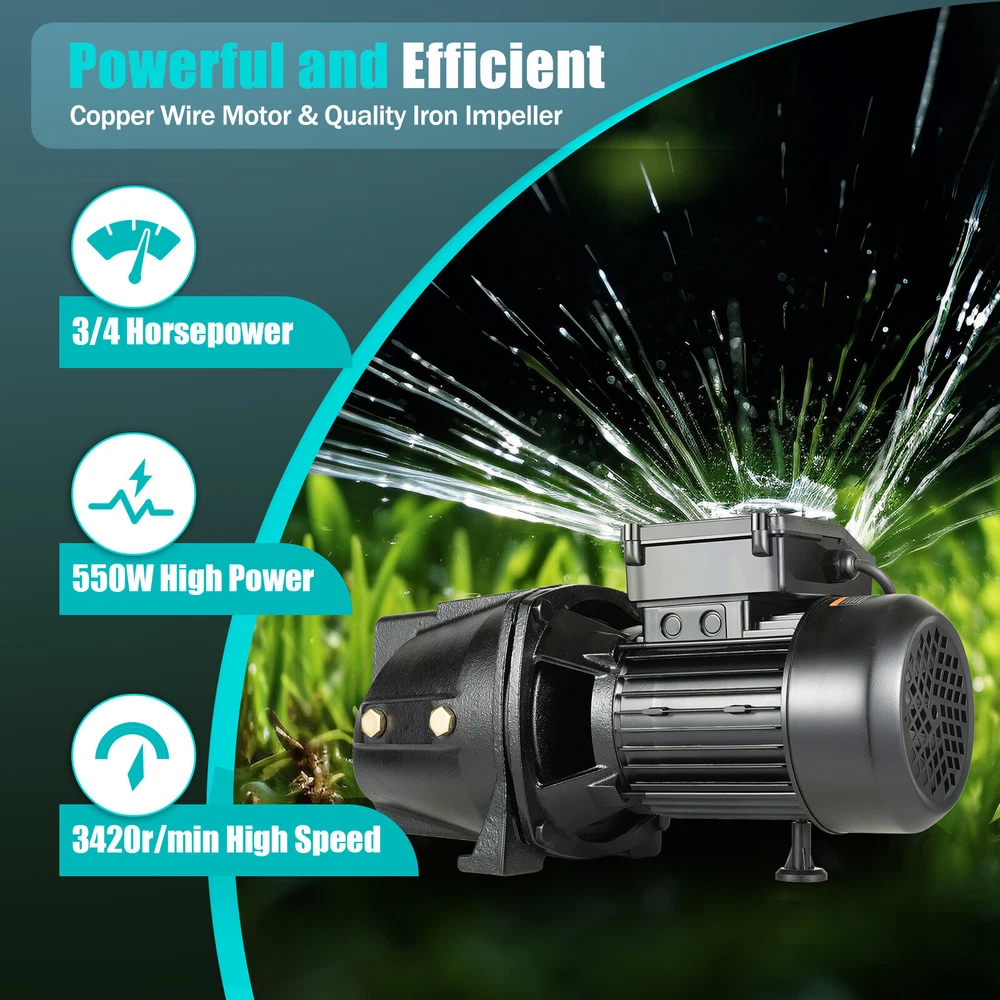 3/4 HP Shallow Well Jet Pump Self-Priming Pump w/Pressure Switch Lawn Irrigation Description It is made of high-quality materials and treated with fine craftsmanship for greater durability. The high-quality copper wire motor gives it strong power, and the automatic pressure boosting system achieves whole-house pressure boosting so that you will no longer be troubled by unstable water pressure, too small water flow, and other problems. And you can free your hands and irrigate your garden and lawn with ease with this well jet pump. Key Features Last and Durable: It is mainly made of high-quality cast iron, aluminum, and iron, with a surface treated by spray painting technology, which has good anti-corrosion and rust prevention ability, and a long service life. Powerful and Efficient: The pump with a powerful 550W copper wire motor and iron impeller has a high speed of 3420r/min, a 1426.53ft³ hourly flow rate and 183.73ft lift, which can efficiently complete various irrigation tasks in a shorter amount of time. With a water outlet pressure of 5.6 Mpa and a self-suction height of 26.25ft, it is possible to pump water to high-rise buildings. Good Heat Dissipation: The evenly distributed cooling holes and motor heat sinks dissipate heat quickly and promptly to maintain stable engine operation. High Safety: It has over temperature and overload protection device. The machine will automatically cut off the power when it exceeds the rated temperature, which can prevent the motor from overheating and burning, and ensure your safety of use. Convenient to Use: It is equipped with an automatic pressure boosting system, and an automatic pressure adjustment switch to regulate the running and stopping of the pump, and it is available for both hot and cold water. Low Noise: It adopts low-noise operation with a noise level of about 30-40dB, which can provide a comfortable environment for you to use. Protective Package: To prevent the product from being damaged and bumped during transportation, we packed it with air column bag and foam to protect your products to the maximum extent possible. Customer Service: Communication is the best way to solve problems. If you have any problems, please feel free to contact us. We will reply and solve the problem for you as soon as possible. Details Support Foot & Thickened Base: The bottom support feet and thickened base provide strong support for the pump body and improve its stability when in use. Junction Box: It has a good seal that can effectively isolate water and electricity, making it safer for you to use. Application It is suitable for garden irrigation, farmland irrigation, underground water intake, high-rise building pressurization, as well as pressurization of household solar energy, water heaters, showerheads, toilets, faucets, washing machines, etc. Specifications Color: Black Material: Cast Iron, Iron, Aluminium, Copper, Plastic, Stainless Steel Process: Spray Paint Voltage: 110V Power: 550W Horsepower: 3/4HP Speed: 3420 r/min Intake and Outlet Diameter: 25mm/3inch Pump Lift: 56m/183.73ft Pump Output: 5.4m³/h/1426.53 ft³/h Rated Self-suction Height: 8m/26.25ft Water Outlet Pressure: 5.6 Mpa Noise: About 30-40dB Product Size: 43*18*21.5cm/16.93*7.09*8.46inch Package Size: 51*32.5*25cm/20.08*12.8*9.84inch Gross Weight: 13kg/28.66lbs Net Weight: 11.85kg/26.12lbs Package Included 1 x Well Jet Pump 1 x Switch 1 x Multi-language Manual Other Accessories for Installation Notes Please allow the slight color difference caused by the shooting light and 1-3 cm error due to manual measurement, and make sure you do not mind before ordering. Payment Delivery details Terms of sales About us Contact us Payment We accept ebay payment 。 Fees such as import duties, taxes are not included in the item price or shipping costs. These charges are the buyer's responsibility. Delivery details Shipping: 2-9 working days to: USA Terms of sales We maintain high standards of excellence and strive for hundred percent customer satisfaction. Feedback is very important to us. We hope that you contact us immediately before you give neutral or negative feedback, so that we can address your concerns. It is impossible to address issues if we do not know about them! About us Your satis faction is our ultimate goal. We work hard to earn your trust and future business. Our certified technicians have tested each item before shipping. The unit comes with 1 year limited warranty on all manufacturing defects. a) If you receive a defective item, you may return it or ask for a discount. Please contact us within 14 days after you receive the package. b) What you returned must be intact and in its original packaging as re? u. Customer is responsible for shipping costs of the returned item. c) We will cover the cost of shipping back t with the shipping rate indicated in the registration page. We will send you a new unit or refund the full payment you paid. Thank you. Contact us Business Hour Business Hour: Monday To Friday: 8:30 AM to 5:00 PM (Beijing China time) Due to time zones, our reply to your questions may not be immediately. But within above working time, we will reply your email within 24 hours. If it's non-workdays, please kindly be patient and wait till Monday. Please contact us with ebay message. Please feel free to contact us if you have any questions. Monday To Friday: 8:30 AM to 5:00 PM (Beijing China time) Due to time zones, our reply to your questions may not be immediately. But within above working time, we will reply your email within 24 hours. If it's non-workdays, please kindly be patient and wait till Monday. Please contact us with ebay message. Please feel free to contact us if you have any questions. Brand Unbranded Feature 1 Great Durability,Exquisite Appearance,High-quality Features Compact Design and Beautiful Appearance 1.Feature *: Unique Appearance,Great Durability 2.Feature *: Compact Design,,Convenient Use, MPN Does not apply Voltage 110V Power 550W The ports 1 inch H