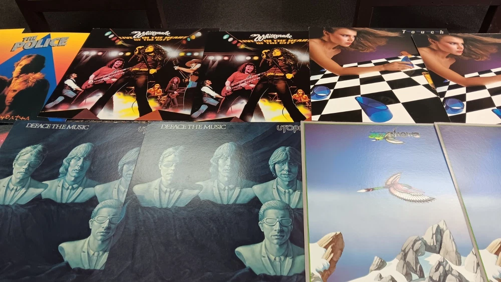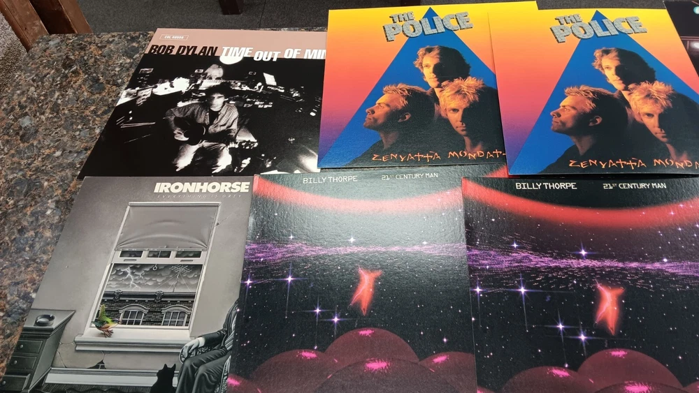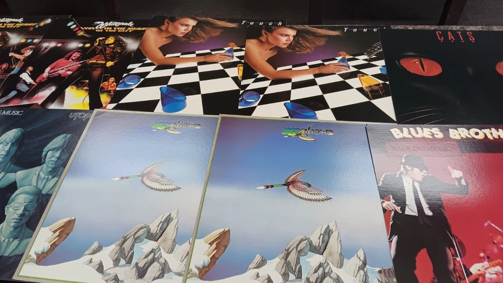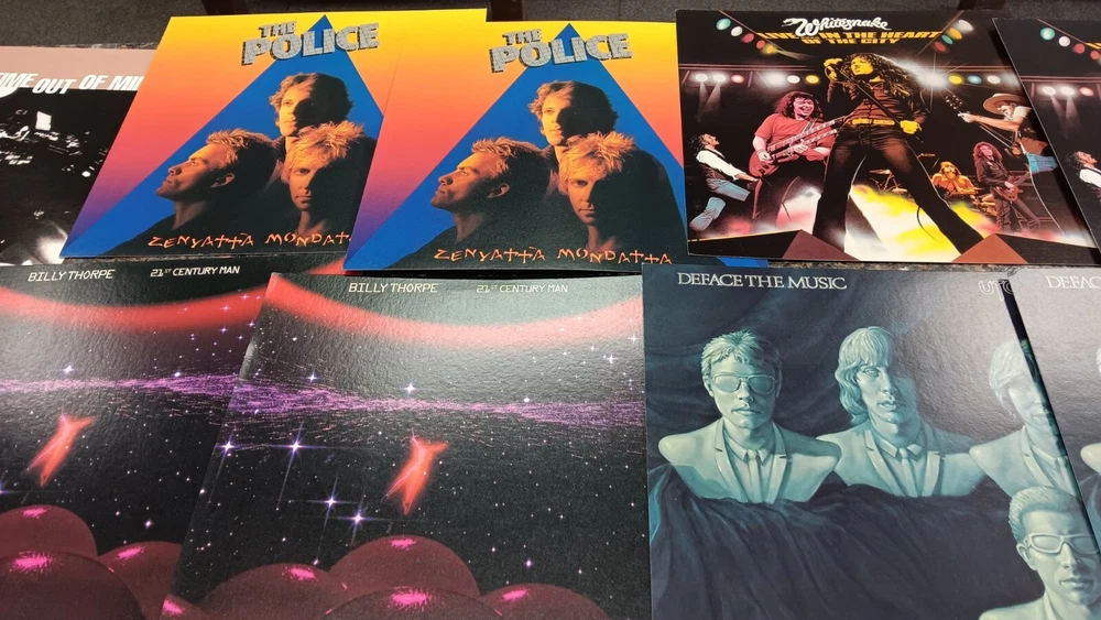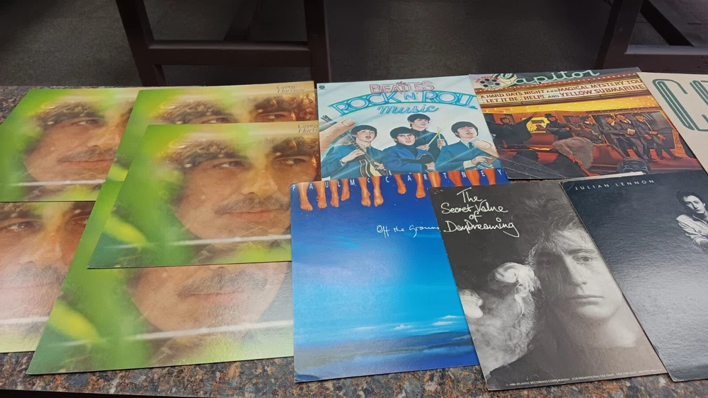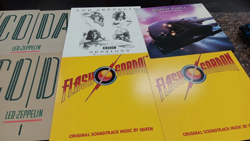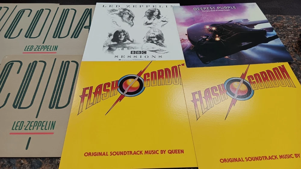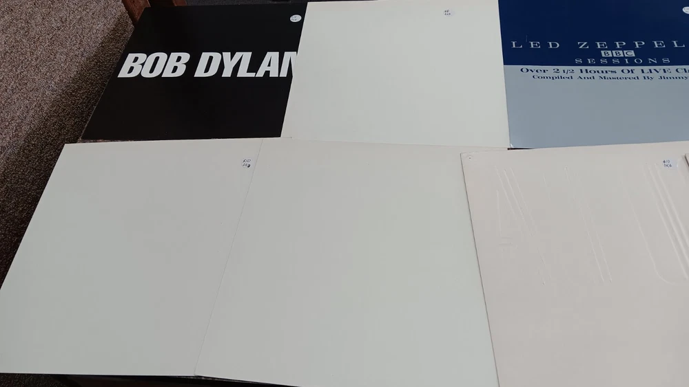 Lot of 35 album cover flats (not albums with records). Price sticker on back of flats. Some might be two sided. Please see all the pictures for condition, some might be wrinkled, have pin holes, edge wear, tape, were put on a wall, or have writing on them. Pictures of backs included. 35 flats in total. You will receive the flats pictured: 5 - George Harrison 1 - Paul McCartney 1 Beatles Rock n Roll 1 Beatles 1 Julian Lennon - Scret 1 Julian Lennon - Valotte 4 Led Zeppelin - Coda 1 Led Zeppelin - BBC Sesions 1 Deep Purple 2 Queen - Flash Gordon 1 Bob Dylan 2 The Police 1 Ironhorse 2 Billy Thorpe 2 Whitesnake 2 Utopia 2 Touch 2 Yes 1 Cats 1 Blue Brothers 1 Jackson Band - Beat Crazy