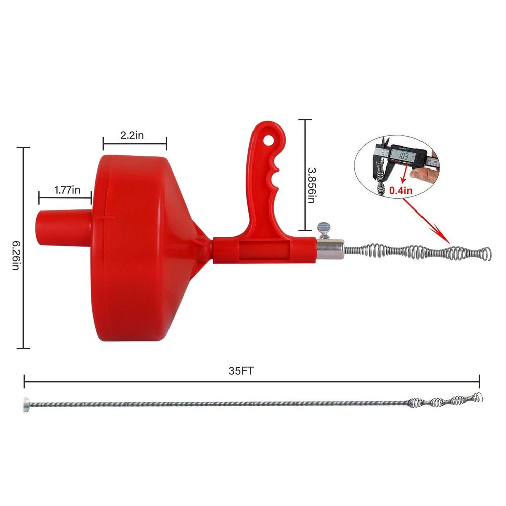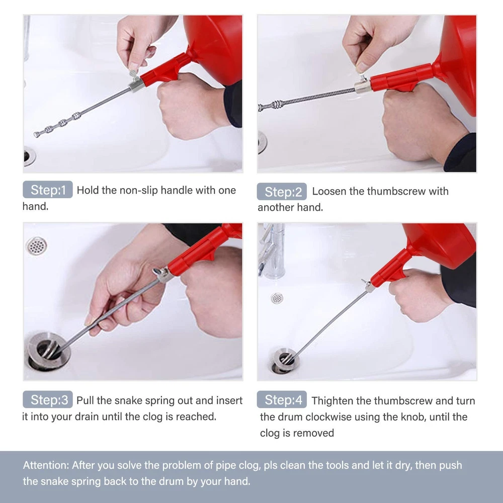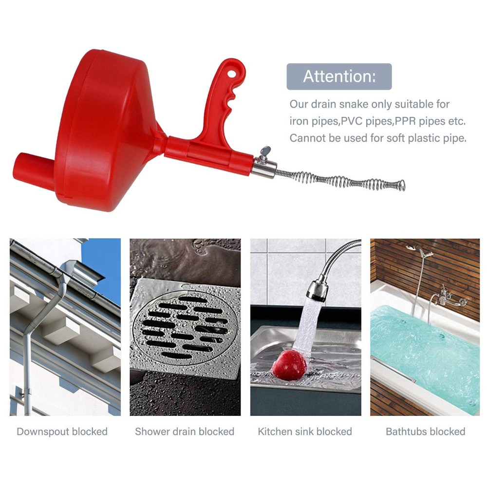 The length of the snake up to 35-FT, which is great for doing heavy duty works as the biggest selling point. Due to easily operation and convenient to use ,so its perfect for beginners or master plumbers Product Specification: Snake Pipe Cleaner Color: Red Spring-Steel Length: 10m(35ft) Grip handle: ABS Pistol Cable material: Steel wire Package: 1 x Snake Pipe Cleaner 1 x Glove Note:The gloves are sent in random color. **Suitable for plumbing snake,sewer,bathtub/bathroom/stall-shower drain, kitchen sink, downspouts, central vacuums cleaning etc, which can be great plumbing tools. **High quality ABS plastic, ergonomic body design feature, the operator can easily grip powerful,durable. **Springs can be stored in drum to keep it tidy than conventional drain cleaner. Operation Guidelines 1.Hold the wire and loosen the screw to allow the wire to be pulled out of the housing; 2.Pull the wire out and push it into the pipeline; 3.If you can't get the wire into the pipeline or get to a blockage in the pipe, then tighten the screw and press the handle and wire toward the pipeline while turning the hand crank clockwise to break up the blockage and until the wire continues into the pipeline. You can fill the pipeline with some water to help remove the blockage, but only if there is still some movement in the drain. If all goes well, the blockage will be washed away and the pipeline will be unplugged; 4.Once the wire is able to continue to be moved into the pipeline, then you can then loosen the screw and continue to repeat the above steps 1-4 until the wire gets through all the blockages; 5.When you have successfully removed the blockage in the pipeline, you can pull the wire out and clean it thoroughly with water. ► 35 ft Drain Cleaner: This drain cleaner with 35 ft (10m) steel cable, which is great for doing heavy duty works. Molded plastic rotating drum body will not be deformed or rusted and easy to clean. ►Multi Use: This manual drain cleaner tool is suitable for use on kitchen, bathroom, utility sinks, bathtubs, shower, downspouts, and sewer drains cleaning to resolve drain clogs. ►Easy Operation: Grip handle and turning knob allows you to use this tool easily to manually drive the drain auger to dredge your pipes, no need calling a plumber, save more money. And pls don't forget to wear gloves to keep your hands clean and safe before you use this plumbing snake. ►High Quality: Precision-made sink snake tools, turning knob can firmly clamp the cable, and can be placed by shaking the wrist. The snake is bendable and flexible, it can help you solve the pipe clog problem better. ►We can provide re-send or refund service if you are not satisfied with our product. Any question, please don’t hesitate to contact us. Click 'Add to Cart' and 'Buy now' if no question.