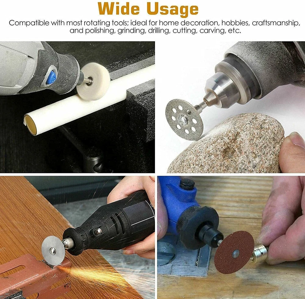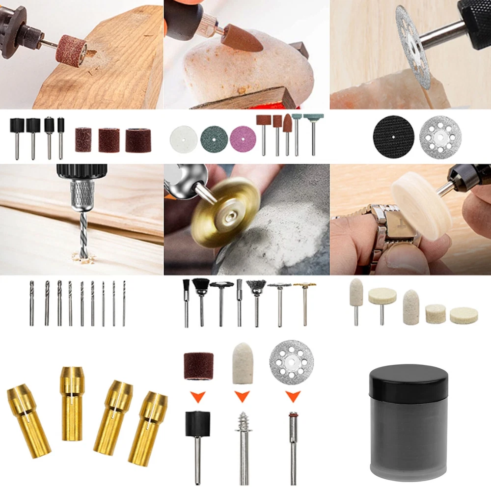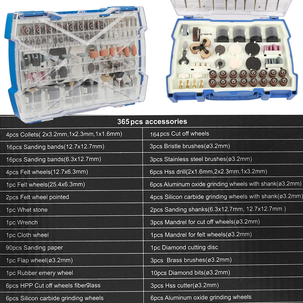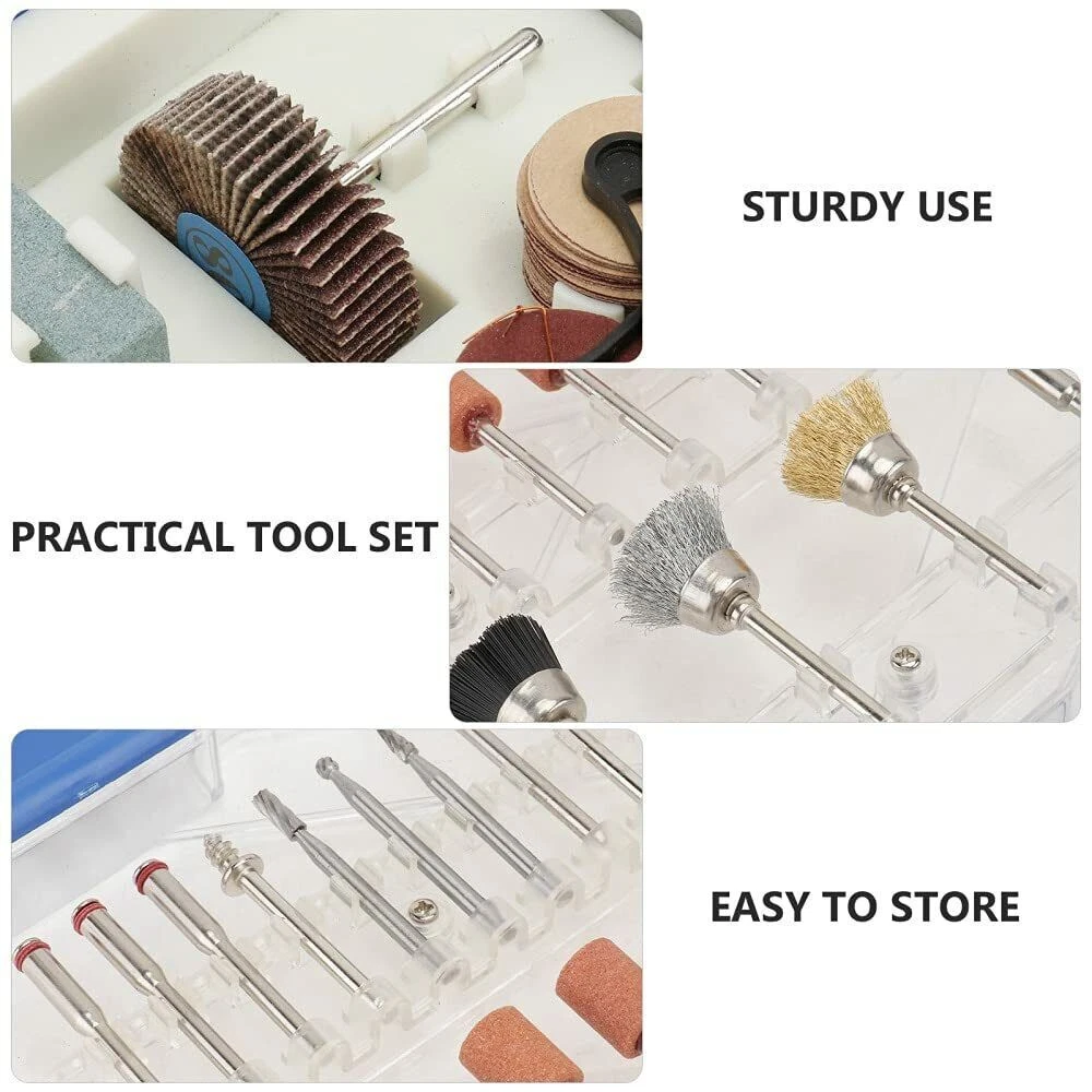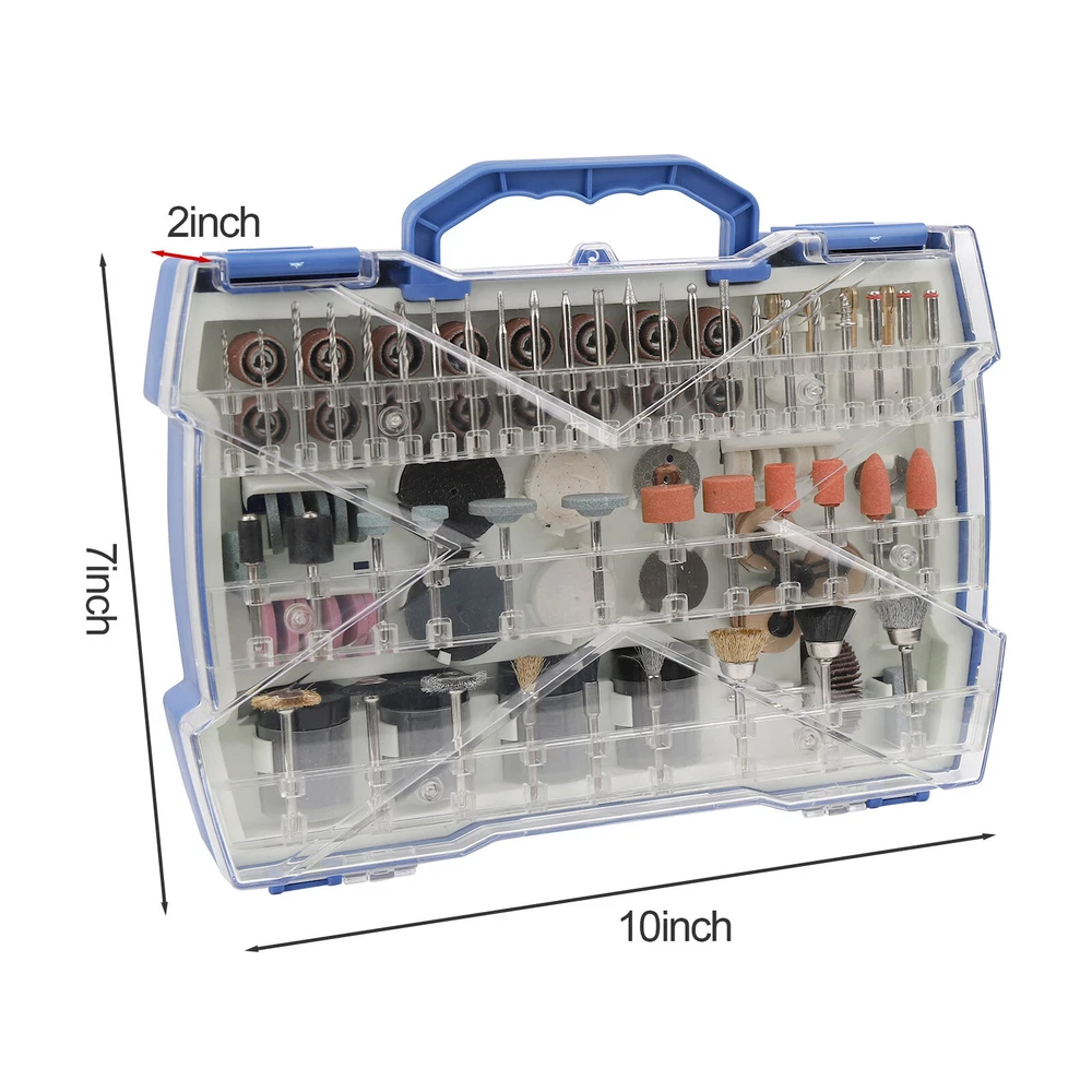 365Pc Abrasive Dremel Rotary Tool Accessories Kit Grinding Sanding Polishing Set Product Feature: 365PCS Rotary tool assortment kit- Includes rich rotary tool accessories of cutting, grinding, sanding, sharpening, polishing, engraving, drilling and cleaning, meet your various application requirements Solid carrying case - PS plastic box is more sturdy, falling resistant and moistureproof, easy for carrying and hanging; All parts were in order and set was complete, well organized to prevent scattered and confused Added accessories - Equipped with special chuck collet(1/16”, 3/32” and 1/8”)1.6mm, 2.3mm and 3.2mm and cloth wheel that dedicated to polishing of jewelry, glass, jade; Flap wheel for polishing and removing on heavy duty material; Diamond cutting disc for cutting jade, thin iron plate Wide usage - 1/8"diameter shanks, compatible with most rotary tools; Ideal for for home improvement, hobby, craft and whenever you need to polish, grind, drill, cut, engrave, and more You will get: 365 Pieces Rotary Tool Accessories Kit (Suitable for most Multi-functional Rotary Tool Kit and other most rotary type tools) Packing Included:(In a case) 3 pcs Brass Brushes 3 pcs Bristle brushes 1 pcs Felt Wheel Mandrel 1 pcs Cloth wheel 3 pcs Stainless steel brushes 5 pcs felt wheels 1 pcs Flap wheel 2 pcs felt wheel pointed 10 pcs Diamond grinding needle 3 pcs Hss cutter 6 pcs silicon carbide grinding wheels 6 pcs aluminum oxide grinding wheels 1 pcs rubber emery wheel 4 pcs silicon carbide grinding wheels with shank 6 pcs aluminum oxide grinding wheels with shank 1 pcs whet shone 4 pcs collets 1 pcs wrench 1 pcs diamond wheel 3 pcs cut manderl 160 pcs cut off wheels regular 6 pcs cut off wheels fiberglass 16 pcs slim sanding bands 16 pcs sanding bands 94 pcs sanding paper 2 pcs sanding shanks 6 pcs hss drill Shipping Policy Payment Method Returns Policy Feedback Contact us Shipping Policy All item will be carefully packaged very well with safe material and shipped to US States. Items will be sent in 2 working days,usually shipped by USPS Priority Mail. It will take about 3-5 days to US addresses. If you would like to ship by other shipment methods,please contact us.( shipping cost will be combined for multiple items you purchase at a time.) Payment Method Only PayPal is acceptable.It is a safe and easy payment method for buyers. Please pay in 48 hours after you win the item(s).If payment cannot be made in five days,your order(s) will be claimed as unpaid case and the item will be relisted. Returns Policy Customer satisfaction is our first priority. 30-days return is available after delivery. However, return shipping and insurance cost will be on buyers. Please email us before returning. Delivery date will be different according to UPS or USPS tracking system, so please inspect your item immediately upon arrival. Money will be return to you after the return item is sent back. We can not refund to you, if your return item is broken or damaged. Please ensure its safety. Feedback Your feedback is very important to us. If you can't leave us a "5-Star" rating and a positive feedback, please contact us without hesitation before leaving feedback. We are eager to work with our customers. We believe in communication. Give us a call or send us an email, we will make things right for our buyers. Positive feedback for our buyers will be left automatically by eBay Seller Manager Pro. Contact us 1. If in doubt, please send us an email. Our customer service team will provide a satisfactory answer What we do is 100% satisfaction for your customers 2. Except for Sundays and festivals all mail is sent and received within 24 hours
