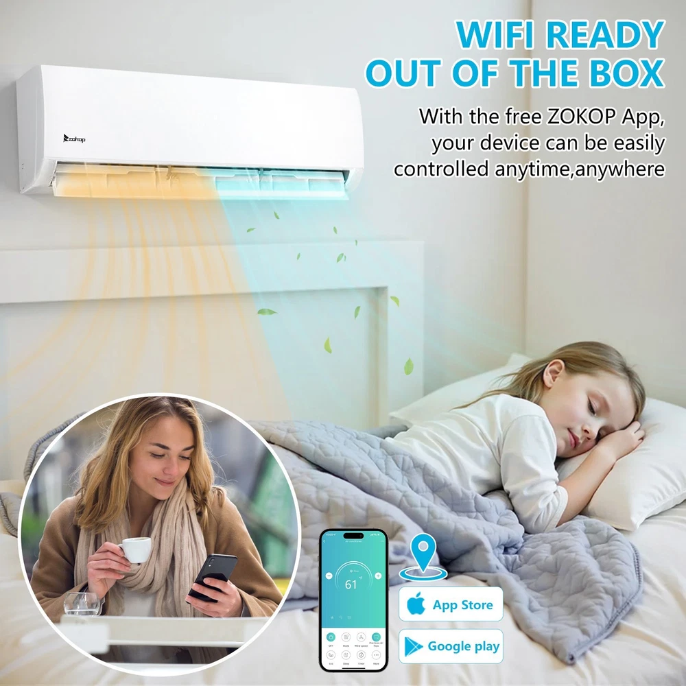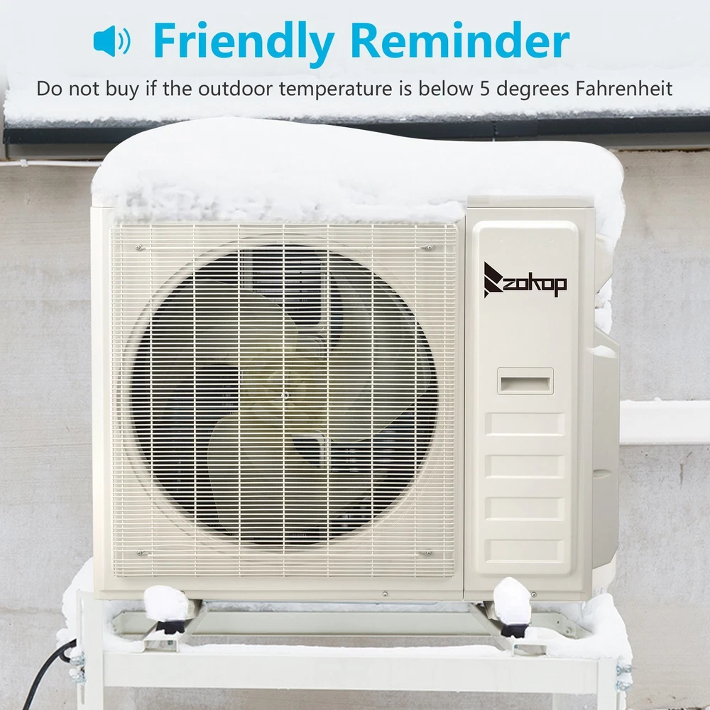 36000 BTU 3 Zone 2 x12K+18K BTU Mini Split Air Conditioner Heat Pump AC Ductless ZOKOP 3 Zone Ductless Mini Split Air Conditioner Heat Pump System, 21 SEER2 Ductless AC with 2 Indoor Air Handlers, 1 Outdoor Condenser, 25ft Installation Kit (12K+12K+18K) Introductions: ZOKOP smart Split Type Type Inverter Air Conditioners with heating function are made with high quality compressor, high speed pure copper motor & inner spiral copper tube which are powerful to quickly cool down / warm your home, office, garage or apartment for maximum comfort in quiet operation, perfect appliance in hot Summer or cold Winter. Comparing with others, machine featured with high SEER grade, which means that it is more energy efficient and much money saving! This unit also has Sleep, Turbo, ECO, Mute and Timer functions. These functions help you enjoy the true individual comfort. Let the ZOKOP Mini Split Air Conditioner 3-Zone be the solution to your home's heating and cooling needs. Features: 1. [MULTIPLE ROOMS] Comes with 3 indoor air handlers 12,000 BTU+12,000 BTU+18000BTU with separate controller for individual rooms and 1 outdoor condenser. Enjoy individual temperature controls in each room for ideal climate control. This unit provides cooling and heating for up to 2100Sq. Ft ( two indoor unit recommended area 550 Sq. Ft., another one 1000 Sq. Ft. ) and able to work in environments as low as 5 degrees Fahrenheit. 3 pcs 24.6ft copper pipes (Standard size 1/4" & 3/8" outer dimension) and 2 installation kits included. The length for drain pipe is 78.7". Featured with Cooling, Heating, Dehumidifying and Fan only modes in one compact unit. It is ideal for using in home's bedroom, living roo, kitchen, office, apartment, garage and so on. 2. [Energy Saving] ZOKOP the speed of the air conditioner equipped with frequency converter directly affects the service efficiency of the air conditioner. The frequency converter is a control system used to control & adjust the speed of the compressor to make it always in the best speed state, so as to improve the energy efficiency ratio (at least 35% more energy-saving than the conventional air conditioner). This 21 SEER2 12000BTU+12000BTU+18000BTU, 208/230V~60Hz, AHRI Certified AC unit with a heat pump(up to 5℉/-15℃) is featured high quality compressor for more efficient cooling and longer working life; Higher SEER grade & Eco-friendly design which leads you for money saving ( please confirm voltage before making purchase) . 3. [Quiet Cooler & Heater] Ultra Silent at only 28-49 dB(A) and beautifully built adds a touch of elegant charm to your room. In sleeping & mute mode, It's able to maintain the temperature while you are sleeping. And you can use the 24-hour timer in combination to free you from additional worries. Featured with 4-way swing function, unit provides scientific airflow in your room to suit your comforts in just a few minutes. Best choice to decorate your home. 4. [Smart Operation] Operating this conditioner is an easy-understanding and enjoyable cooling experience (61-88degree Fahrenheit ). We can set all functions on remote control (Fan Speed Selection, Sleep Mode, 24 Hour Timer, ECO Mode, Turbo Mode, and Mute Mode). Built-in microprocessor chip & sensor in the remote controller makes it more convenient to operate the air conditioner from a distance. Digital LED display controls offer precise temperature adjustments and the remote control lets you control the air conditioner from across the room. 5. [Washable Air Filter] This indoor AC machine comes with a permanently washable and easy cleaning air filter. Keep your air conditioner running more efficiently by cleaning the filter once a month. Specifications: 3*Indoor Unit: 1. Color: White 2. Power Supply: 208/230V, 60Hz 3. Cooling : Rated Capacity: 12000Btu/h, 18000Btu/h Rated SEER2: 21Btu/W.h, 21Btu/W.h Rated EER2: 9.5Btu/W.h,9.5Btu/W.h 4. Heating: Rated Capacity:12600Btu/h, 19000Btu/h HSPF2 Rating (Region IV): 8.2Btu/W.h,8.2Btu/W.h 5. Operation temperature: (16~31)degree Celsius/(61~88)degree Fahrenheit 6. Use the air conditioner in the following temperature conditions: Indoor(cooling/heating): 17 ~32degree Celsius(63 ~90degree Fahrenheit)/0 ~27degree Celsius(32 ~80degree Fahrenheit) Outdoor(cooling/heating): 15 ~55degree Celsius(59 ~131degree Fahrenheit)/-15 ~24degree Celsius(5 ~75 degree Fahrenheit) 7. Moisture removal: 1.6L/h, 2.2L/h 8. Indoor air circulation/Hi : 520/450/380m³/h, 1030/790/730m³/h 9. Indoor noise level at cooling(Turbo/High/Med./Low/Mute): 45/42/35/30/28dB(A), 49/47/42/37/32dB(A), 10. Application Area: 12000BTU Up to 550 sq.ft. , 18000BTU Up to 1000 sq.ft 11. Certificate : AHRI, ETL 12. 12000BTU: Indoor Dimensions: 81.1x29.2x20.5cm(31.9x11.5x8.1inch) Indoor Package dimensions: 88.5x36.6x27.8cm(34.8x14.4x10.9inch) Indoor Net weight: 9.5kg/20.9Ibs Indoor Gross weight: 12.7kg/28Ibs 13. 18000BTU: Indoor Dimensions: 101×31.5×22cm(39.8x12.4x8.7inch) Indoor Package dimensions: 109.6×39×30cm(43.2x15.4x11.8inch) Indoor Net weight: 12.5kg/27.6Ibs Indoor Gross weight: 15.3kg/33.7Ibs 1* Outdoor Unit : 1. Cooling Capacity: 28000BTU/h 2. Heating Capacity: 28000BTU/h 3. SEER2: 20.0BTU/h.W 4. Rated Voltage: 208/230V~60Hz 5. Refrigerant type: R454B/2200g/77.66ozs 6. Outdoor Dimensions: 97.8x42.1x80.3cm(38.5x16.57x31.61inch) 7. Outdoor Package dimensions: 102.2×48×83.5cm(40.27x18.9x32.96inch) 8. Outdoor Net weight: 54kg/119lbs 9. Outdoor Gross weight: 68kg/127.9lbs 3*Copper pipes : 1. Connecting Pipe: Gas 3/8''-24.6FT/7.5M Liquid 1/4''-24.6FT/7.5M 2. Signal Cable Length: 24.6FT/7.5M 3. Drain Hose:6.6FT/2M Package Includes : 3* Indoor box includes : 1 x Indoor Unit 1 x Remote Control 1 x Screw Pack 1* Outdoor box includes: 1 x Outdoor Unit 4 x Outdoor feet rubber 3*Copper pipes box includes: 1 x Copper pipes set(24.6FT) 1 x Signal Cable(24.6FT/7.5M) 1 x Drain pipe(6.6FT) 1 x Drain pipe adapter 2 x Sealant 2 x Wall sleeve cover 2 x Pipe tape 1 x Insulation pipe 1 x Wall sleeve