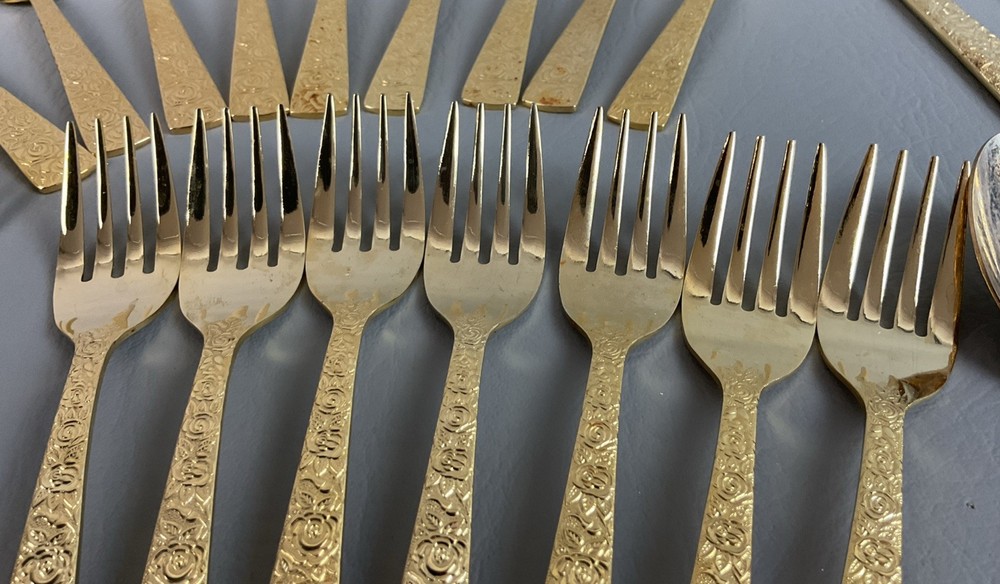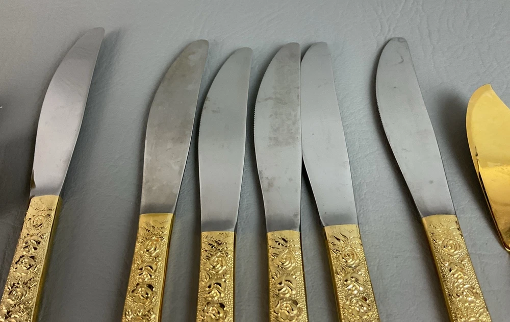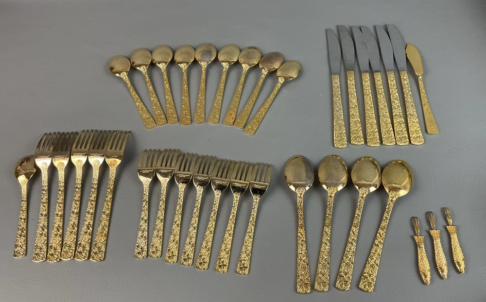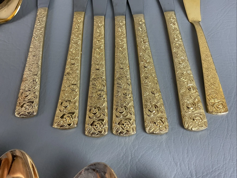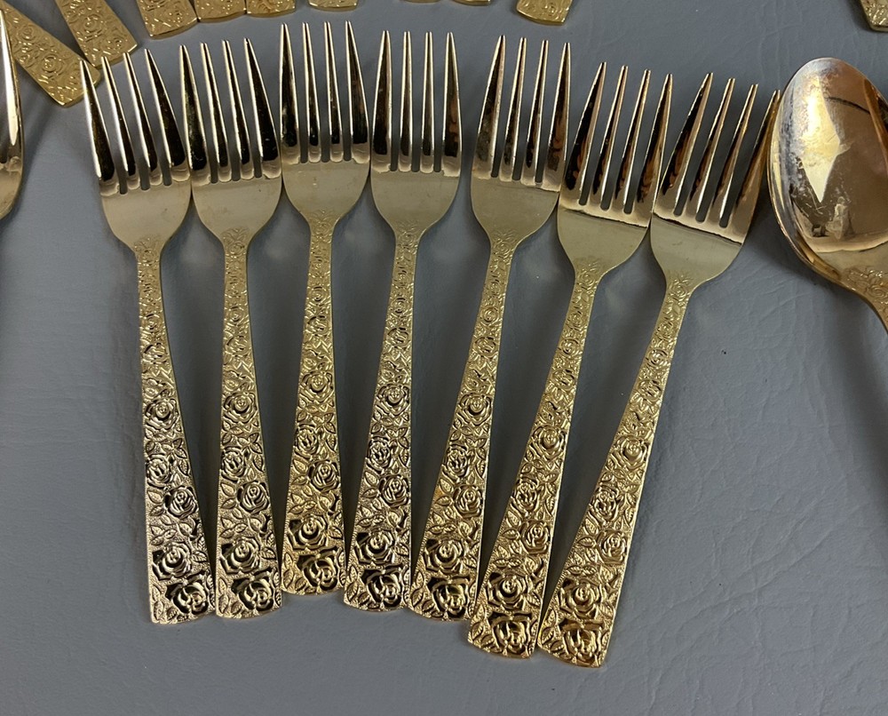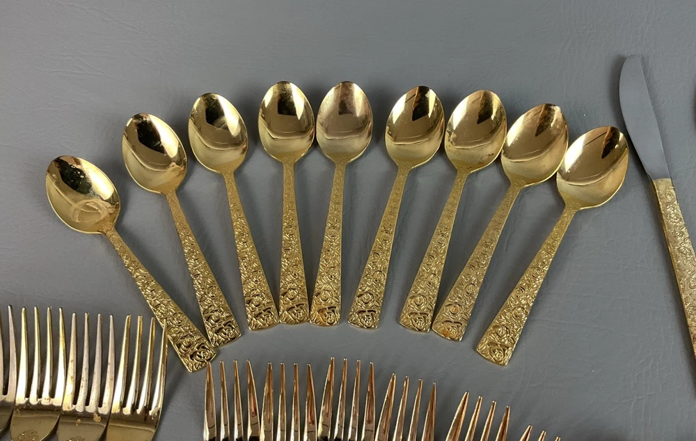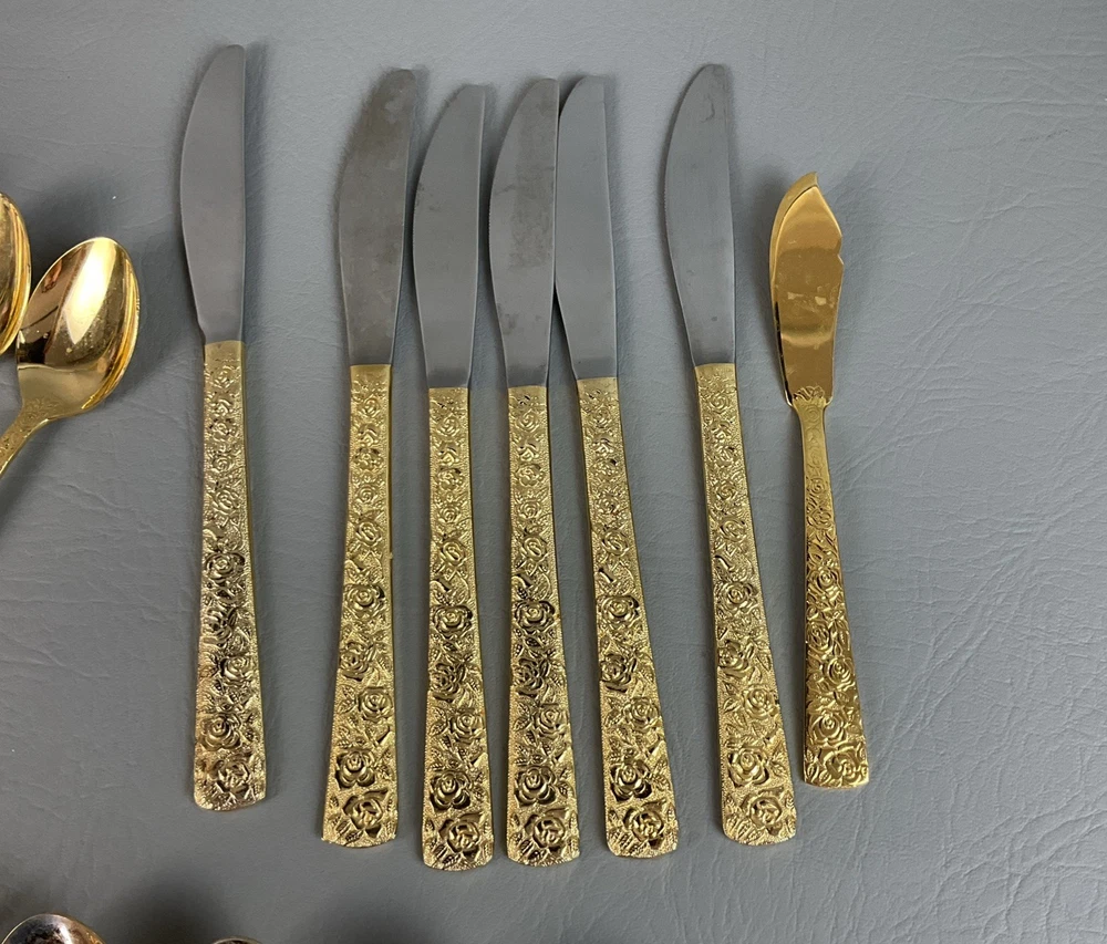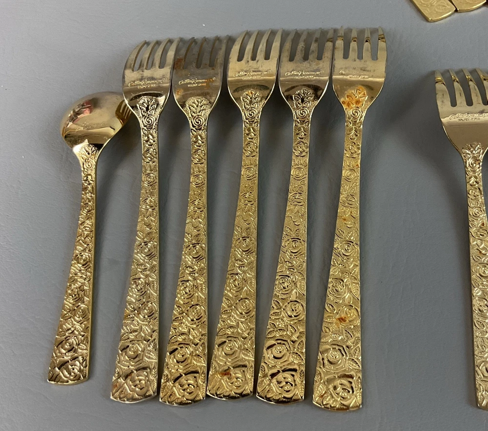 The 36 pieces CELLINI ROMANESQUE Golden Flatware Set with rose handles is a vintage Romanesque style flatware set made by Golden Japan in 1968. The set includes knives, forks, and spoons with a gold color and floral handle pattern. Crafted from stainless steel with a glossy finish, this set is perfect for adults who appreciate classic and elegant dining utensils. The set is a timeless addition to any kitchen or dining room, adding a touch of sophistication and style to meals.