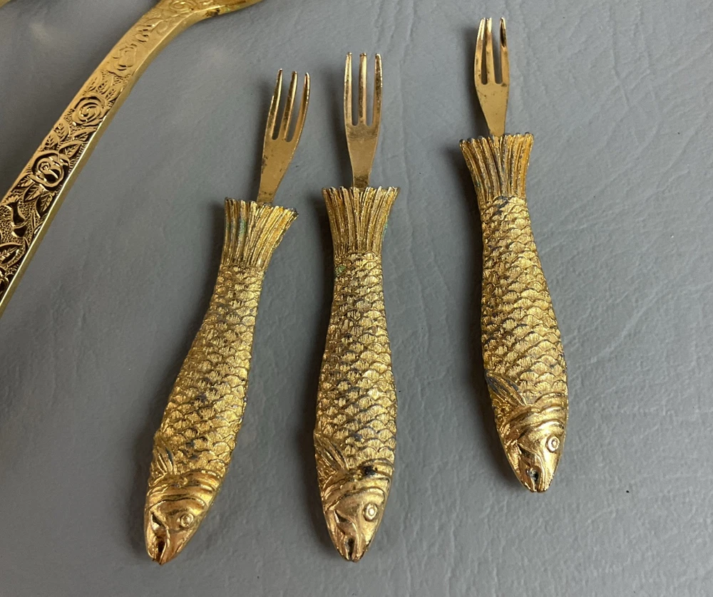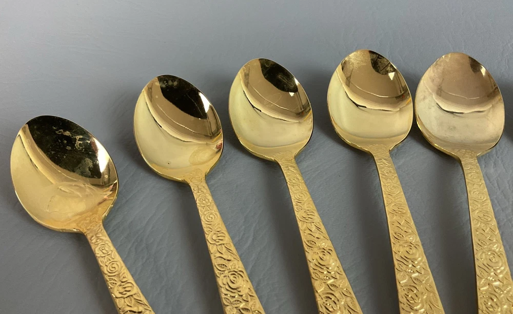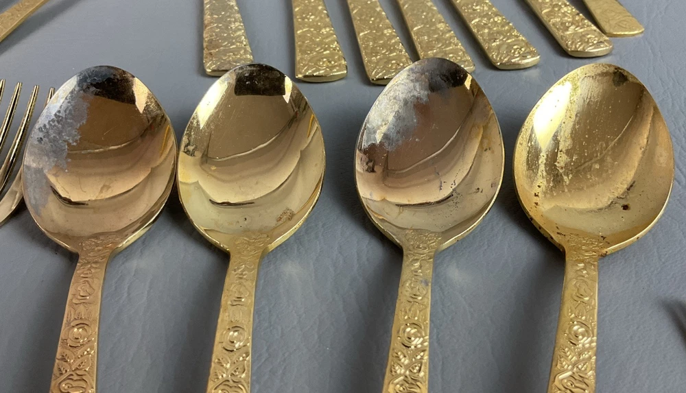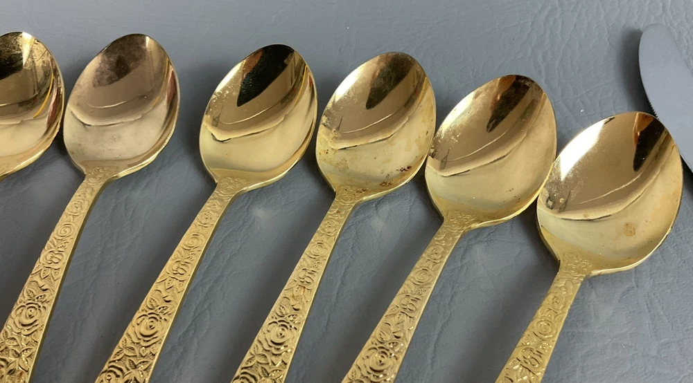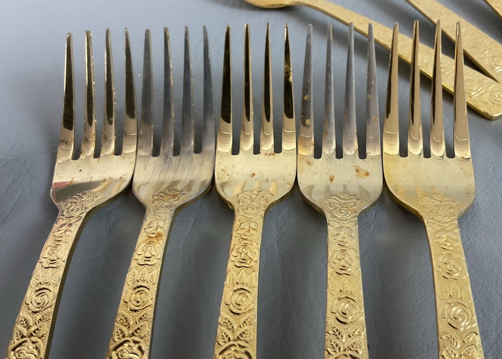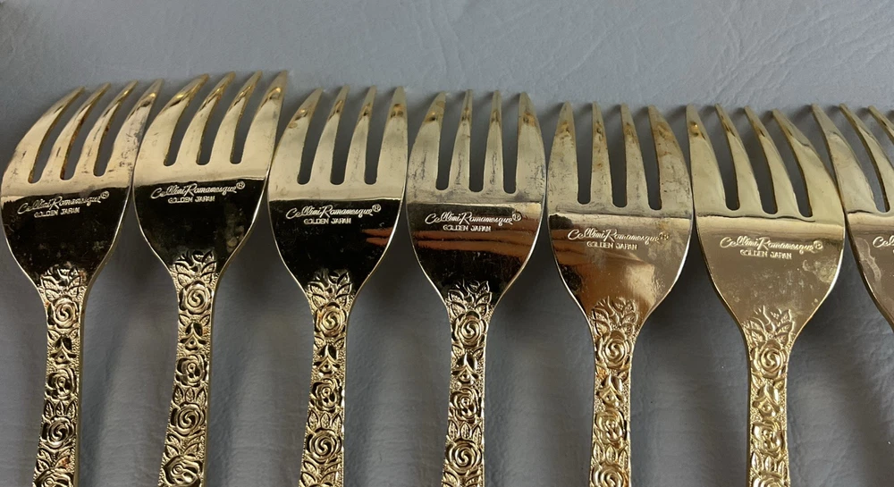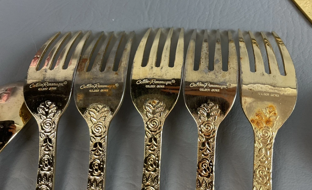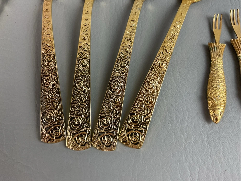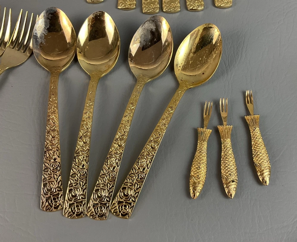 The 36 pieces CELLINI ROMANESQUE Golden Flatware Set with rose handles is a vintage Romanesque style flatware set made by Golden Japan in 1968. The set includes knives, forks, and spoons with a gold color and floral handle pattern. Crafted from stainless steel with a glossy finish, this set is perfect for adults who appreciate classic and elegant dining utensils. The set is a timeless addition to any kitchen or dining room, adding a touch of sophistication and style to meals.