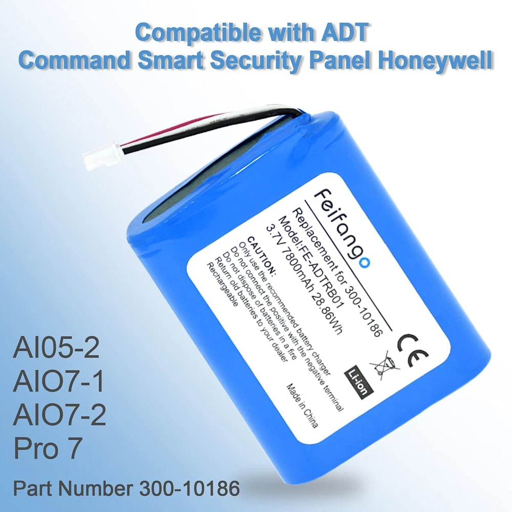 3.7V 7800mAh Li-ion Replacement Battery for 300-10186 Compatible with ADT Command Smart Security Panel Honeywell AI05-2 AIO7-1 AIO7-2 Pro 7Battery Voltage: 3.7VCapacity: 7800mAhType: Li-ionBattery Specification: 2.7 x 2.18 x 0.74 inchesPackage includes:replacement battery*1; Instruction*1➤This battery of is perfectly suitable for Honeywell AI05-2 AIO7-1 AIO7-2 Pro 7, please confirm the model before purchasing.➤Li-ion batteries have no memory effect, can be recycled more than 500 times, have a longer service life. The self-discharge is low even if stored for a long time, effectively reducing the natural loss of power.➤High-quality circuit chips and batteries have passed international system certification, good high temperature resistance, making it safer to use with you.➤Warm Noticed: When using a new lithium battery for the first time, you should use up the virtual power before charging it, which is conducive to the battery life. Compatible Models: Compatible with Honeywell AI05-2 AIO7-1 AIO7-2 Pro 7, same as original battery, perfect replace ADT Command Smart Security Panel batteries. Battery Voltage: 3.7V; Capacity: 7800mAh; Li-ion. Specification: 2.7 x 2.18 x 0.74 inches Multiple Protection and 100% Safety: Built with multiple circuit protection (over-charging, over-current, over-voltage, short-circuit, high-temperature). Tested and validated by manufacturer to match specifications of OEM, fast and safe charging. Package Includes: 1*replacement battery, 1*instruction and friendly customer service.