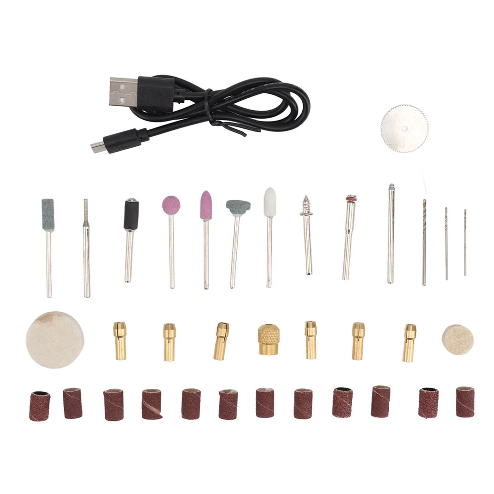 Feature: 1. MULTIPLE USAGES: 3.7V cordless rotary tool kit, portable pen type design for sanding, engraving, polishing and cleaning etc., suitable for home and craft projects. 2. 5 VARIABLE SPEEDS: The grinder pen has 5 variable speeds, 3600r/min, 8000r/min, 12000r/min, 15000r/min, 18000r/min, suitable for different DIY work situations. 3. USB AND BATTERY: The tool supports charging with DC 5V USB connector, and equipped with a 1000mAh large capacity battery, suitable for long term operation. 4. OTHER PARTS: Equipped with abrasive rings, chucks, grinding rods, cotton wheels, saw blade, twist drills and connecting rod, etc., this set is convenient and practical. 5. EASY OPERATION: The electric grinder pen is small and compact, easy to operate, ready to use after installing the grinding head, has a wide range of applications. Specification: Item Type: Cordless Rotary Tool Kit Material: ABS Gear Speed: 3600r/min, 8000r/min, 12000r/min, 15000r/min, 18000r/min Power Supply Battery: 1000mAh Li ion battery (built in) Package List: 1 x Electric Grinder Host 1 x Charging Cable 12 x Sand Rings 5 x Collets 5 x Grinding Sticks 2 x Cotton Wheels 1 x Small Circular Saw Blade 3 x Connecting Rods 2 x Grinding Needles (Random Style) 3 x Twist Drills 1 x Storage Box Note: Different tool accessories fit different collets. If the tool attachment tends to come off the head of the rotary tool, replace it with a new collet to fit it.