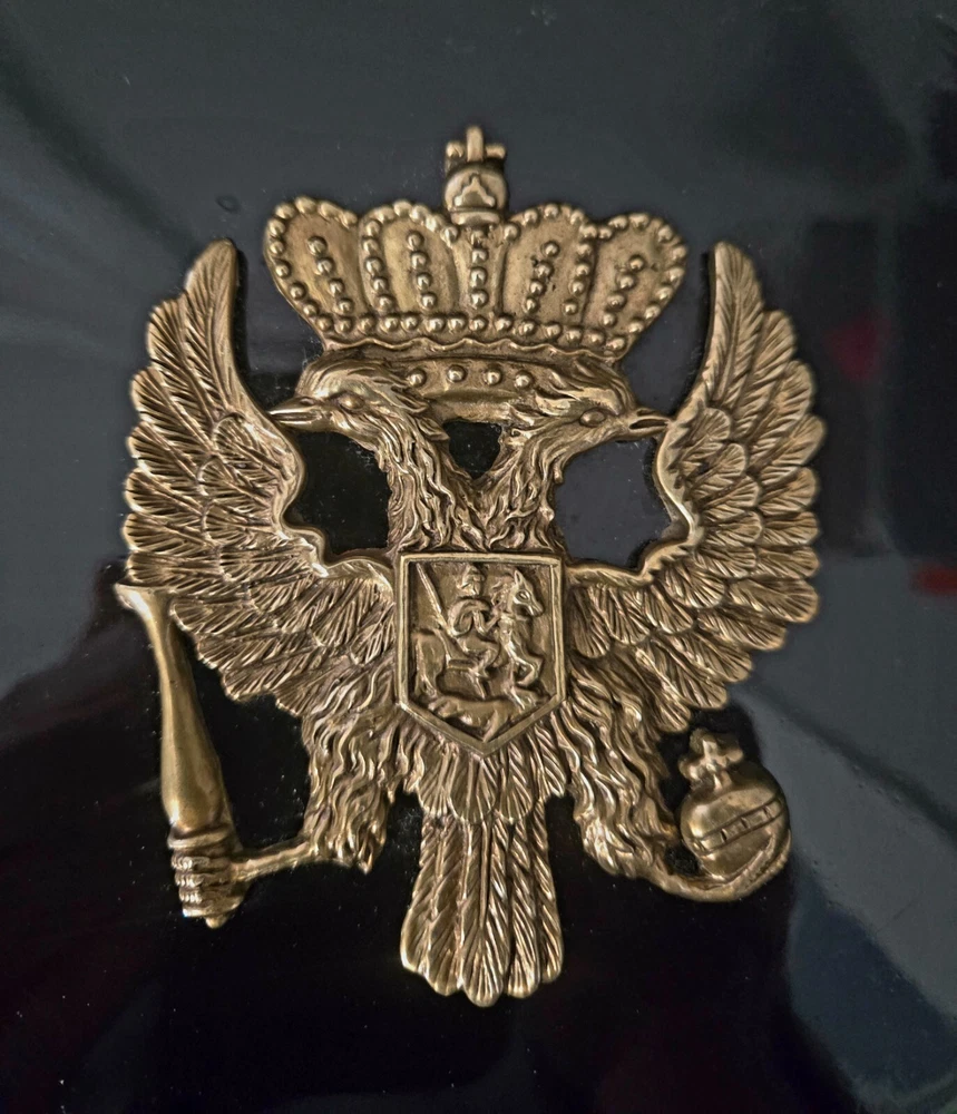 The product is a set of three heavy black ceramic collector plates with a round shape and a diameter of 10.5 inches. Each plate features a 3D brass design of various coat of arms representing Russia and Spain. These decorative plates are intended for hanging on the wall and would make a unique addition to any collector's display. There is some normal wear -- see pictures. The intricate designs and cultural significance of the coat of arms add a touch of history and elegance to these collector items. J083