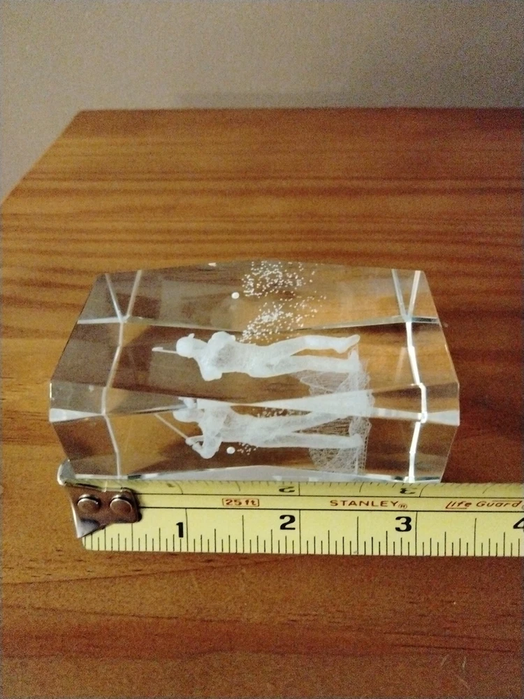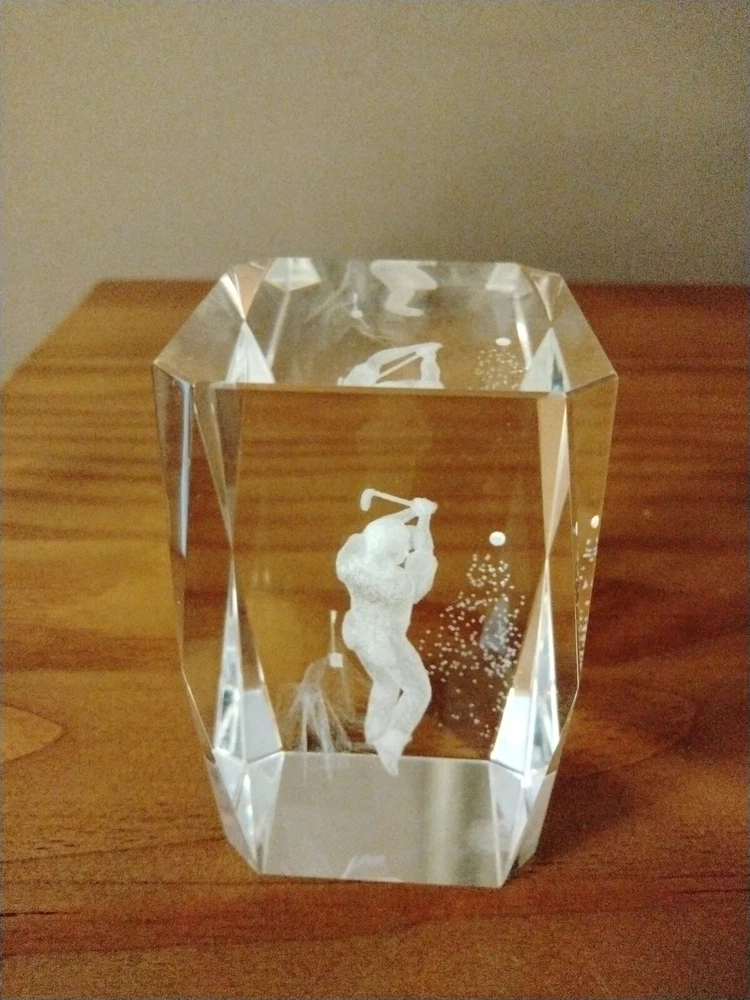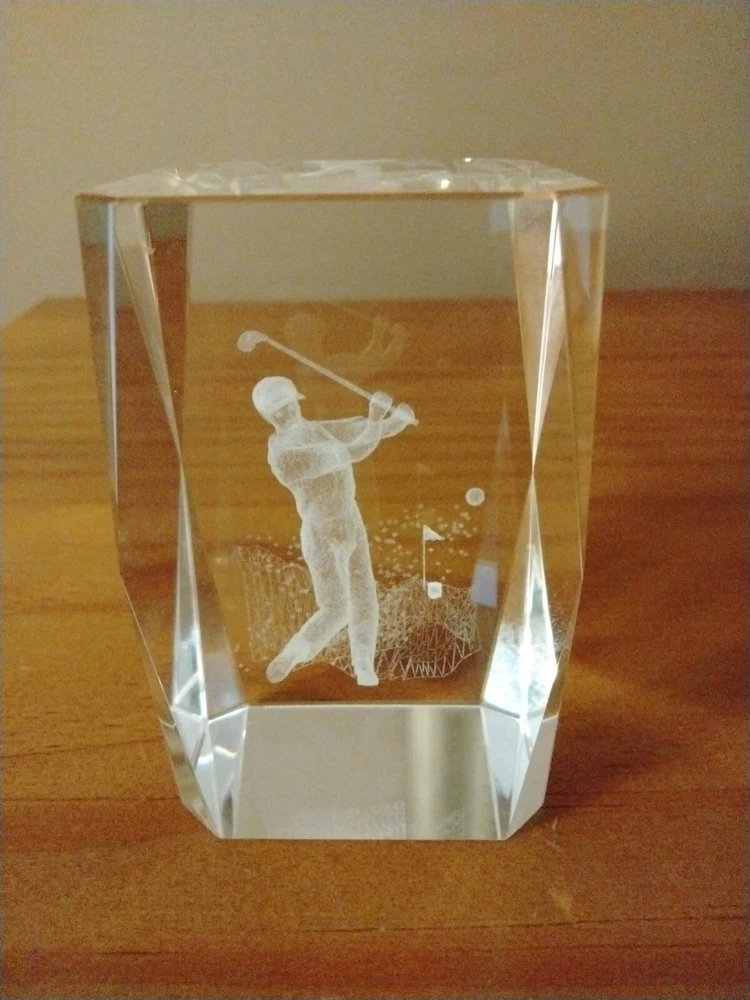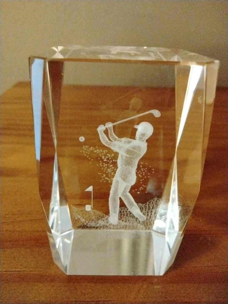 3D Laser Etched Crystal Cube Golfer Paperweight. Preowned and in good condition.